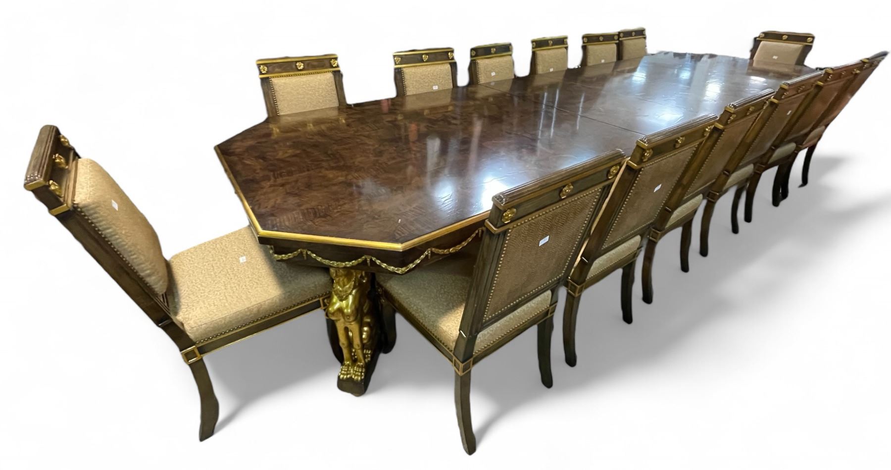 Antique French Napoleon Empire Reproduction Dining Set - includes a 14-Seat Dark Wooden Dining Table w/ Painted Female Sphinx Figures & 14 Assorted Chairs
