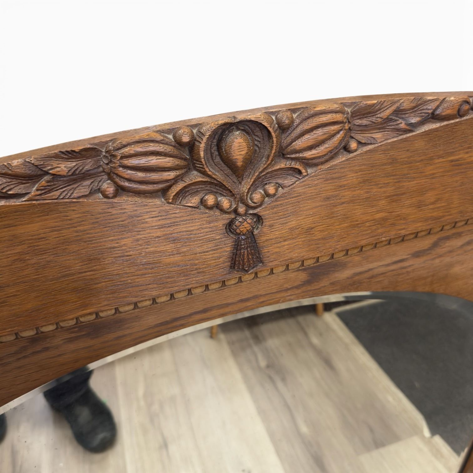 Antique French style oak mirror measuring 46x37.5-Inch. Features a wood frame with ornate detailing typical of French design influences. Mirror is rectangular with beveled edges. Item is as pictured.