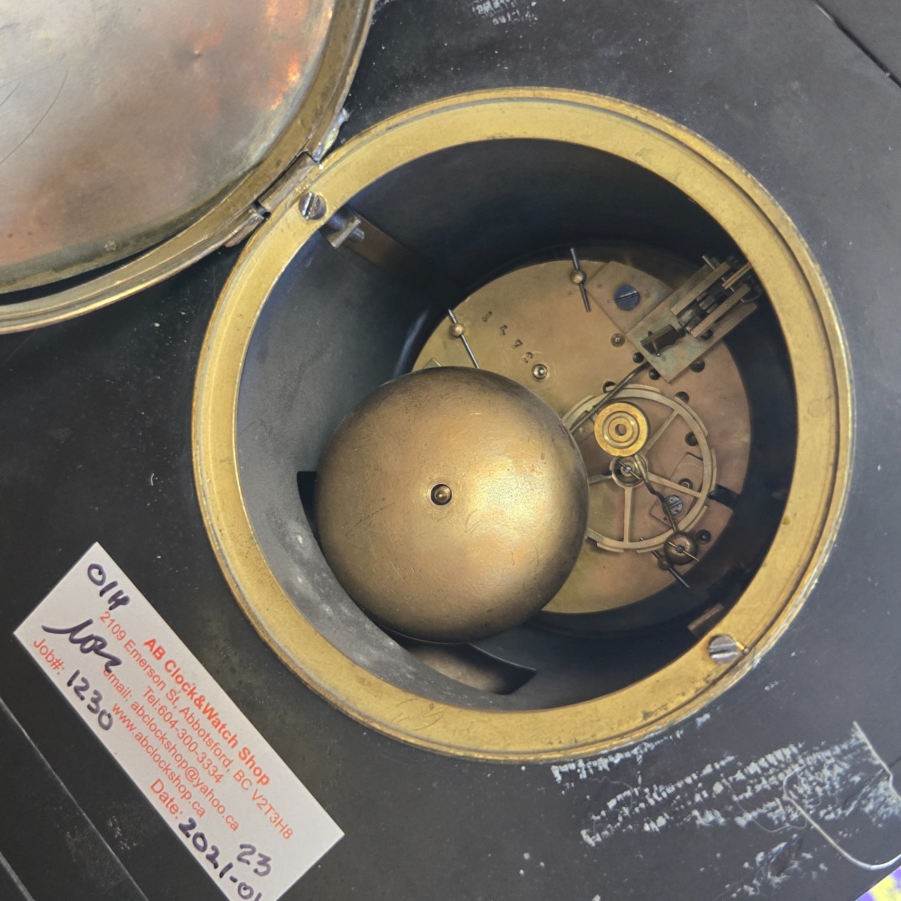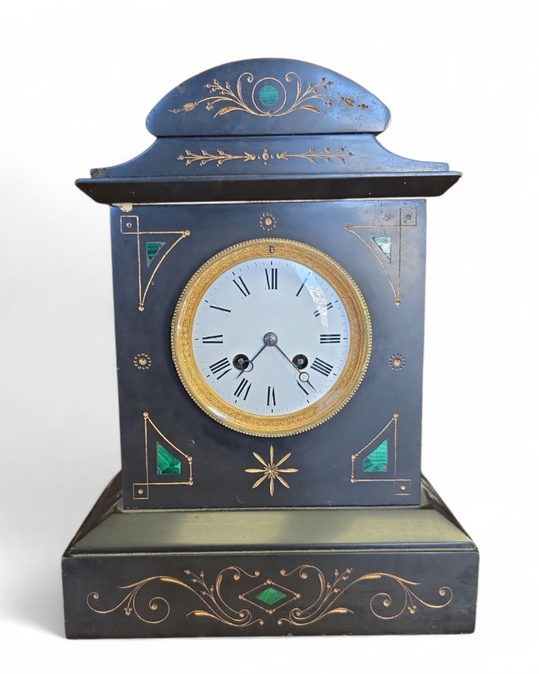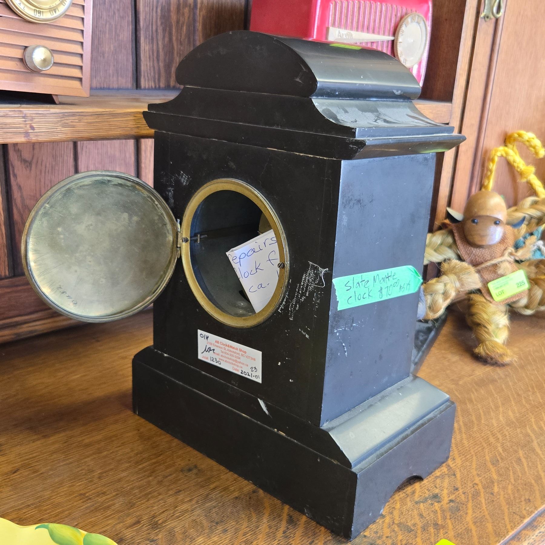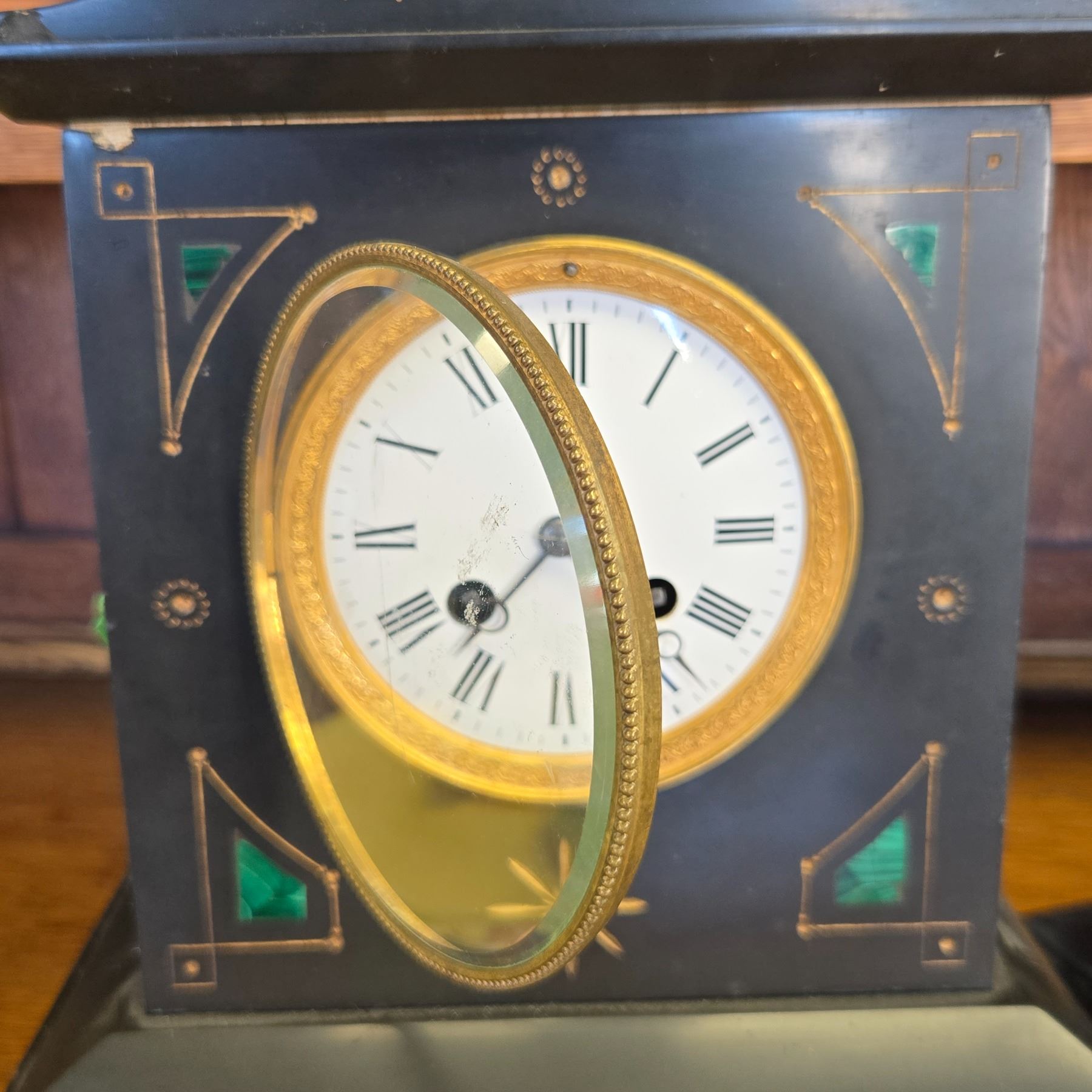 French Victorian mantle clock made of black slate and marble. Dimensions are 10x13x6-Inch. Features intricate design elements characteristic of Victorian era craftsmanship. Likely mid-to-late 19th century. Item is as pictured.