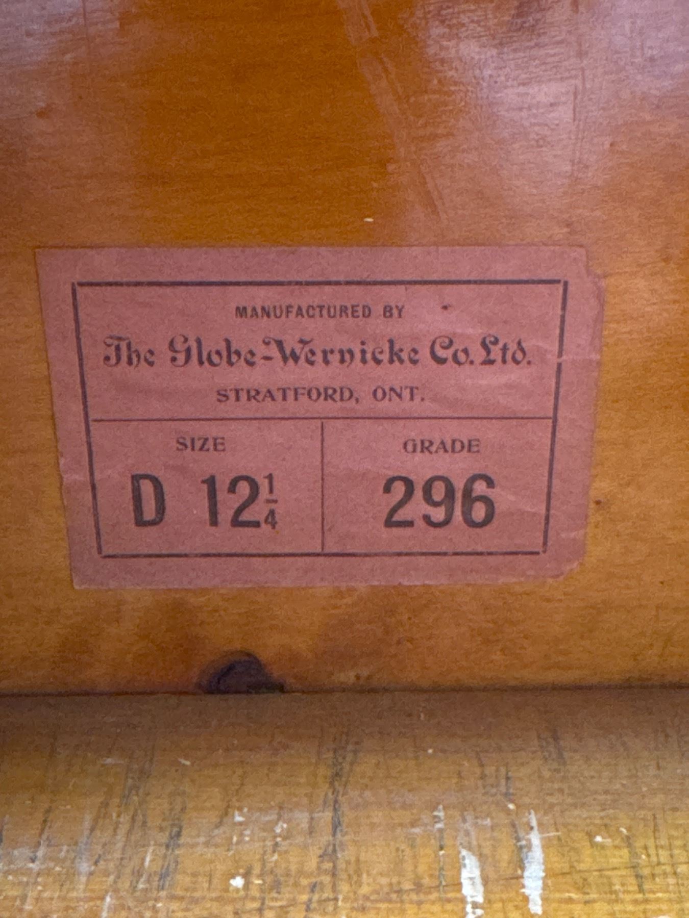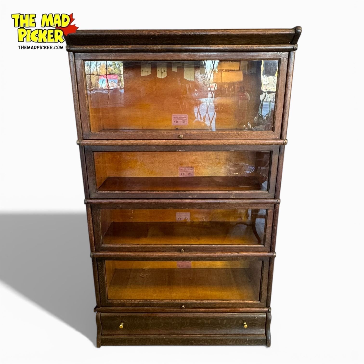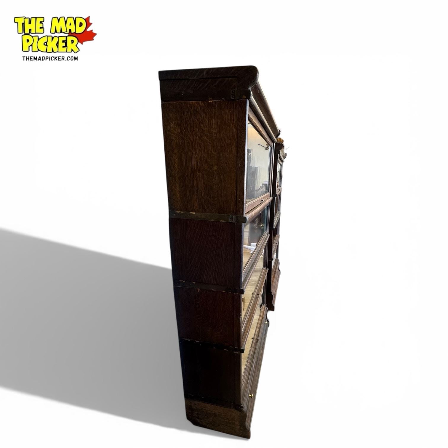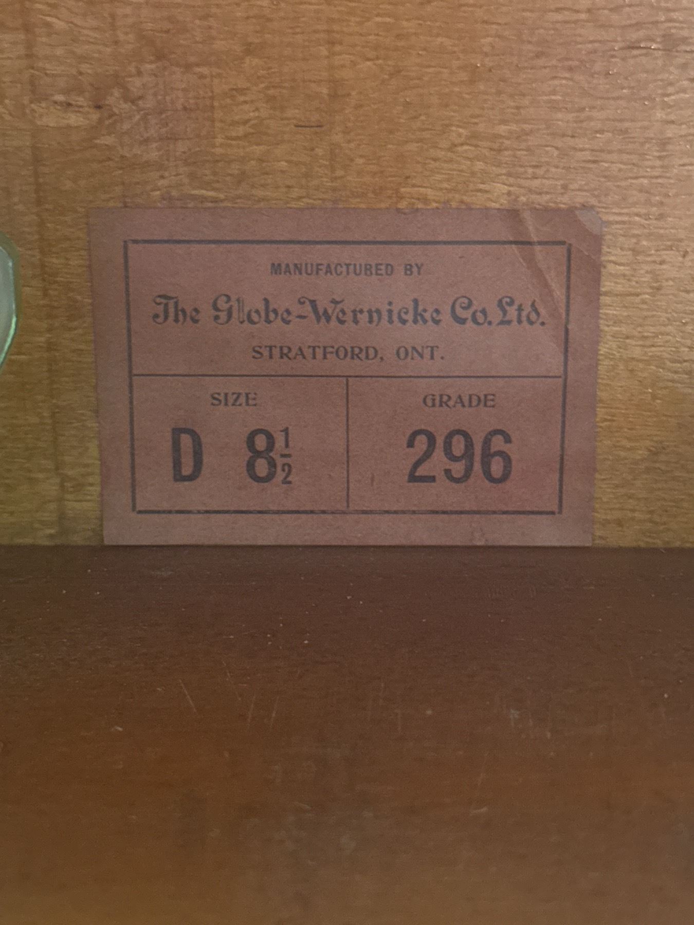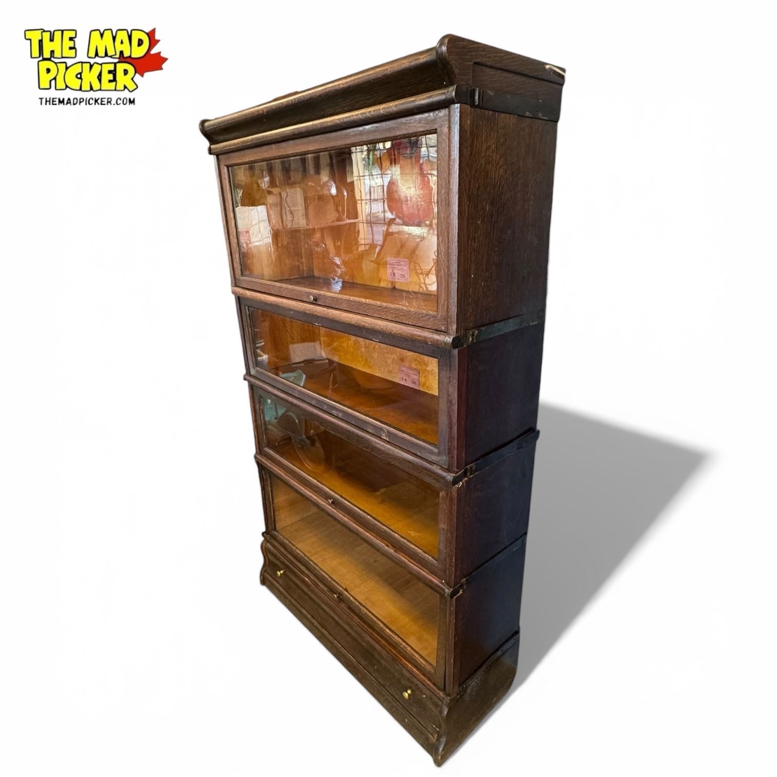 Antique Globe-Wernicke Co. Ltd. modular barrister bookcase made in Stratford, Ontario, Canada. Features 3 shelves at 8.5 inches each, 1 shelf at 12.25 inches, bottom drawer, and top crown piece. Measures 58 inches tall, 34 inches wide, and 12 inches deep. Crafted for durability and functionality. Stamped Leslie inside.