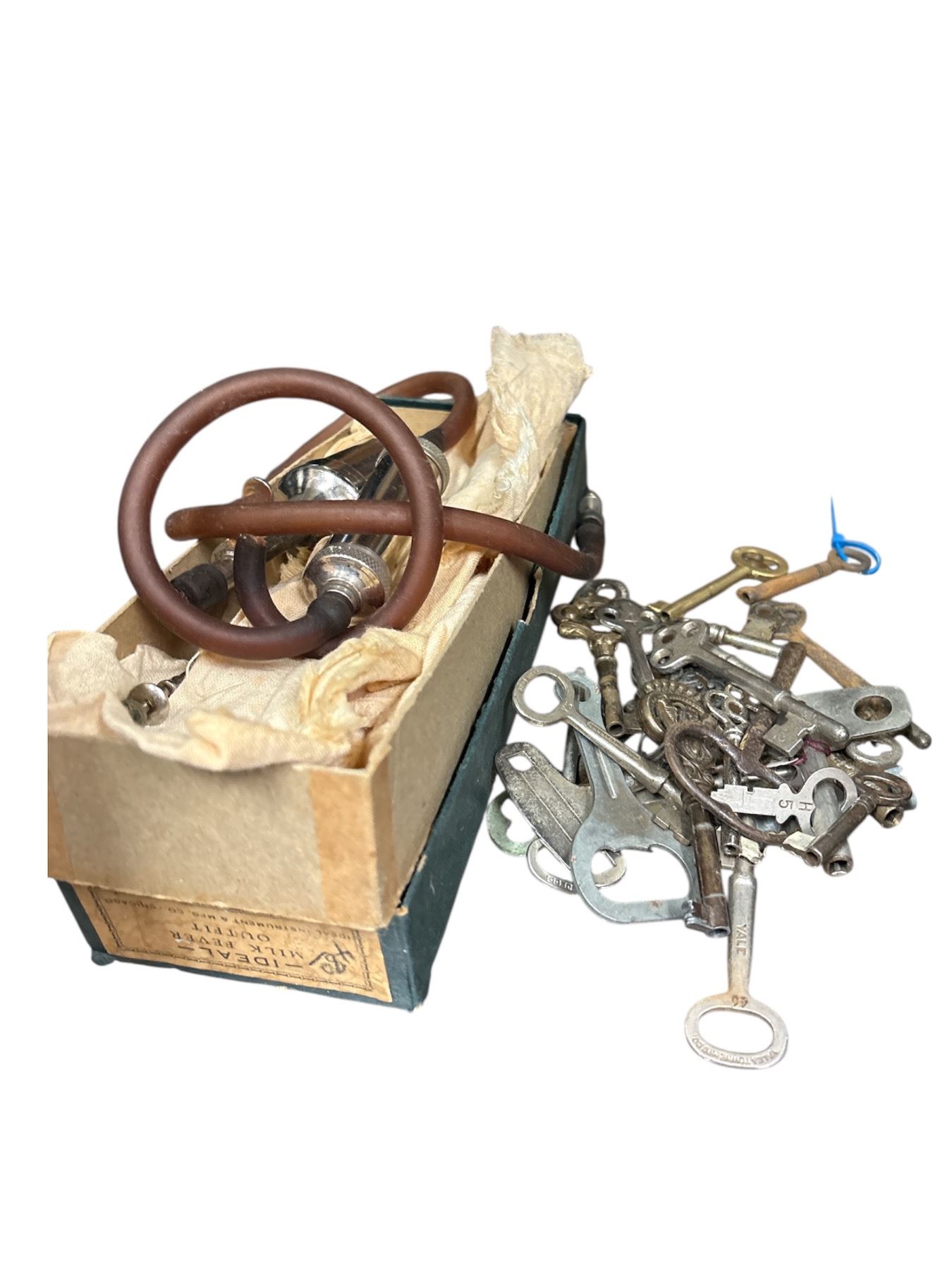 Includes an Antique Ideal Milk Fever Outfit veterinary tool used historically for livestock care, alongside a collection of vintage and antique skeleton keys. Items show age-appropriate wear. Item is as pictured.