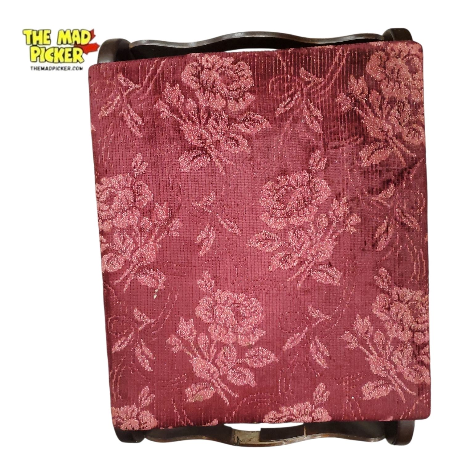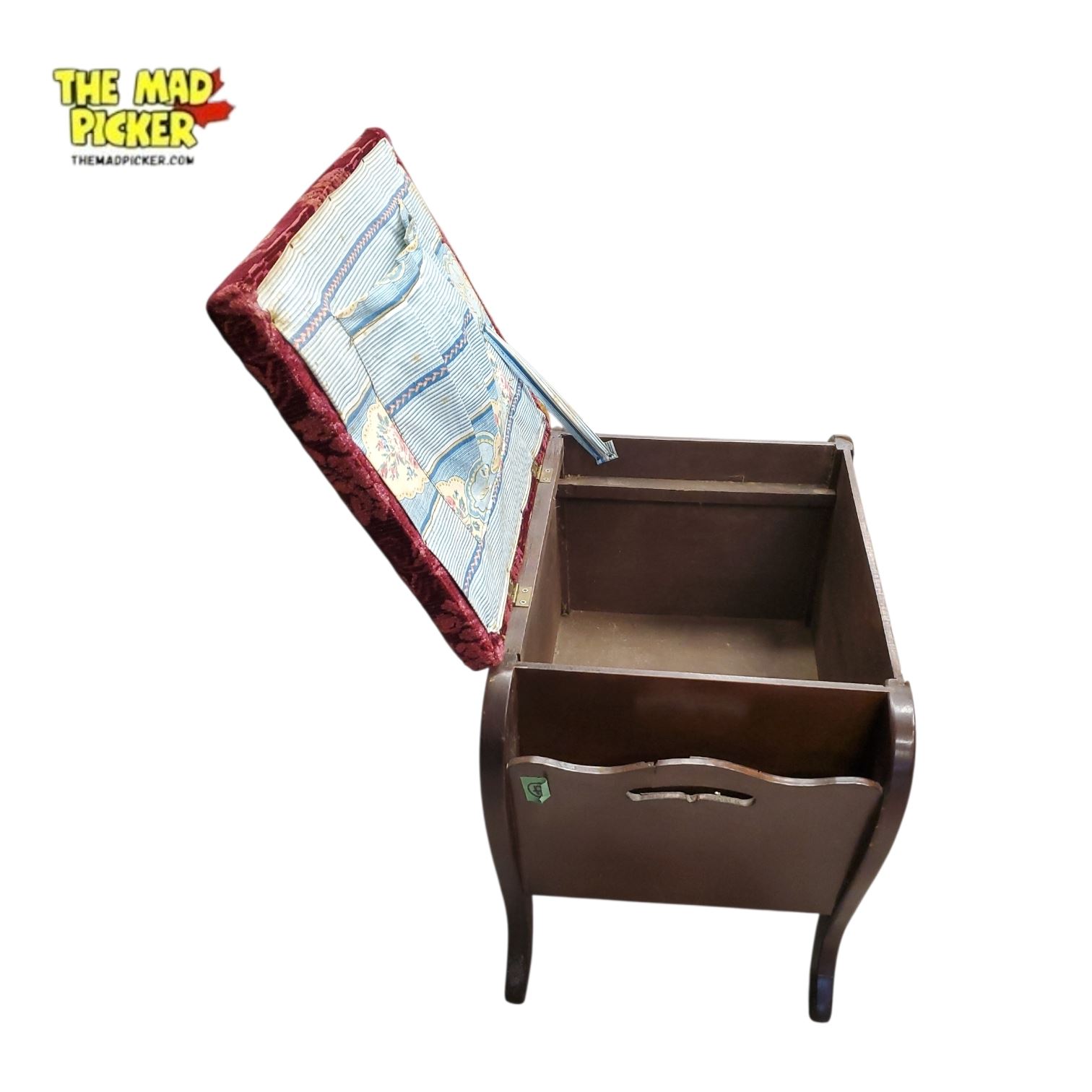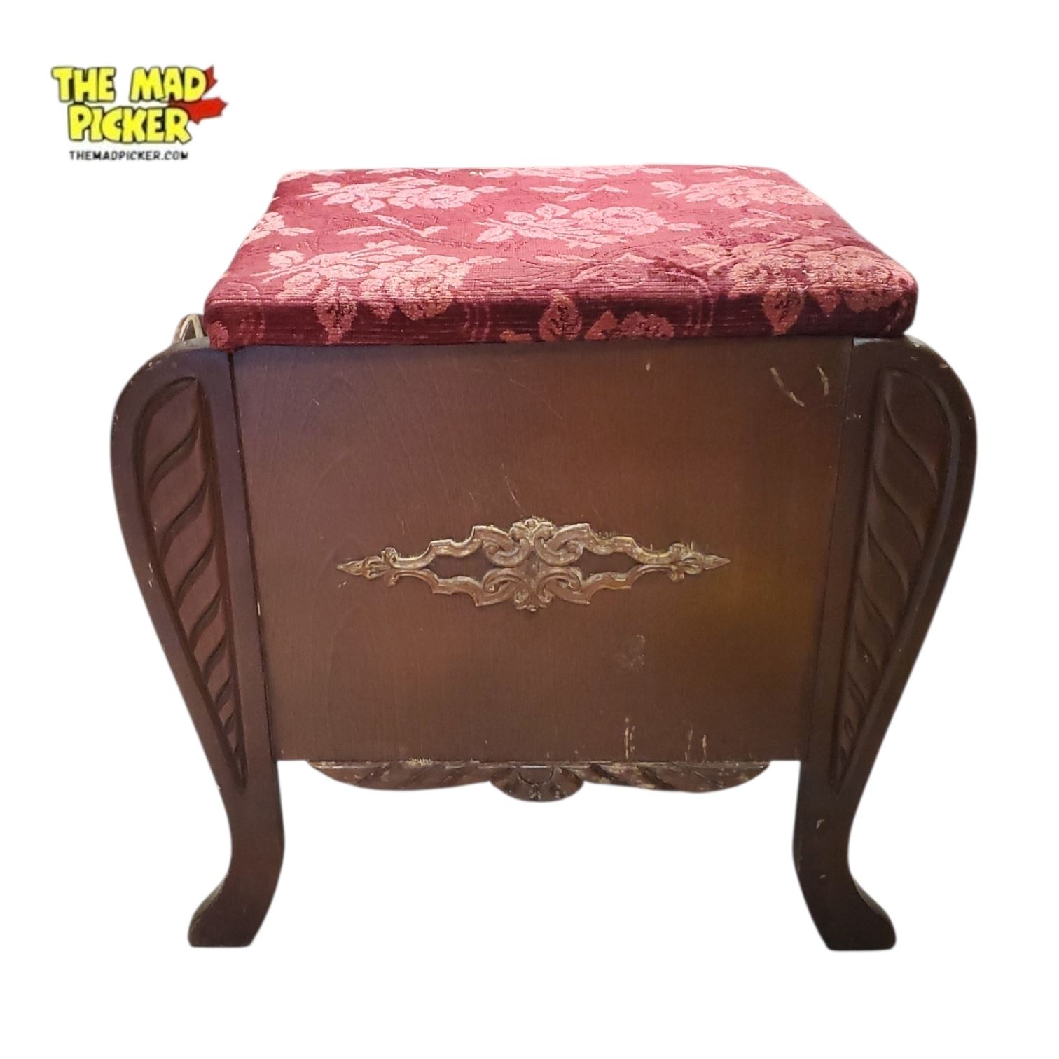 Antique mahogany piano stool with red floral upholstered seat, early to mid-20th century. Features a lift-up lid revealing an interior storage compartment, suitable for holding music sheets or sewing supplies. The design reflects Edwardian Revival style, combining functionality with a timeless decorative appeal.