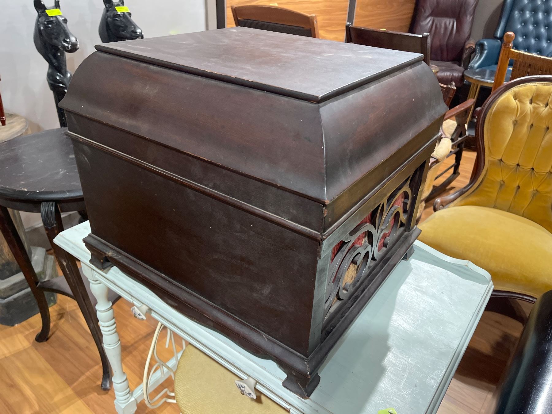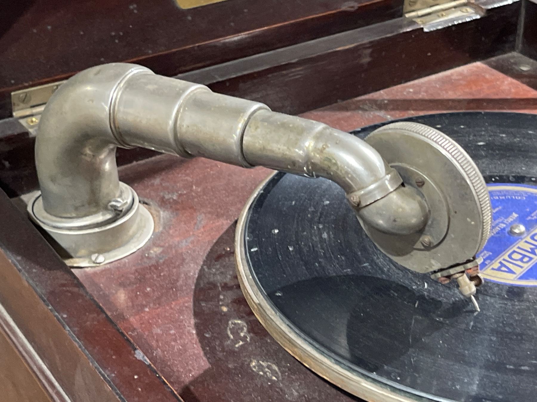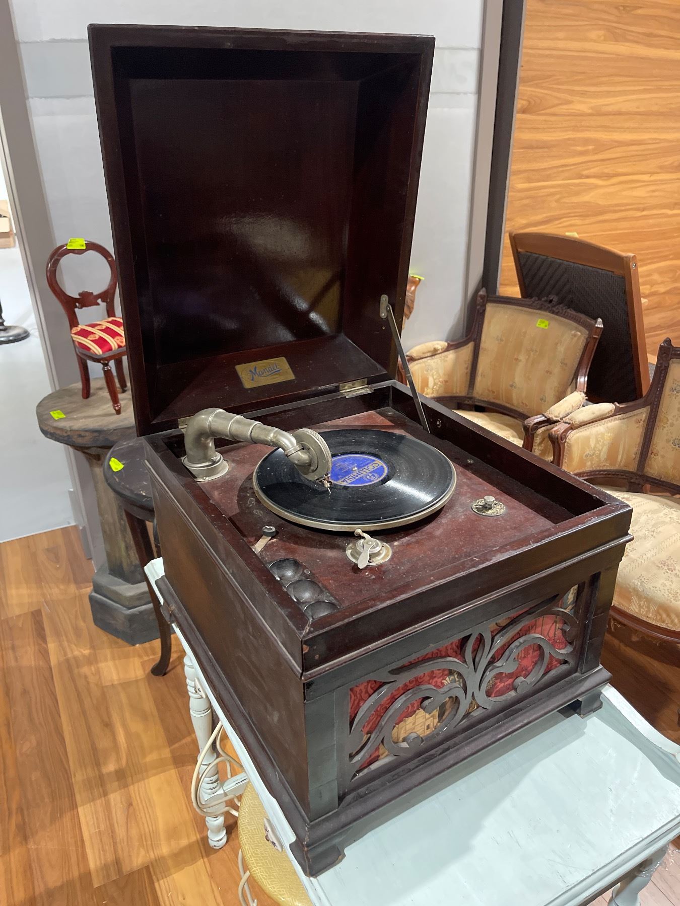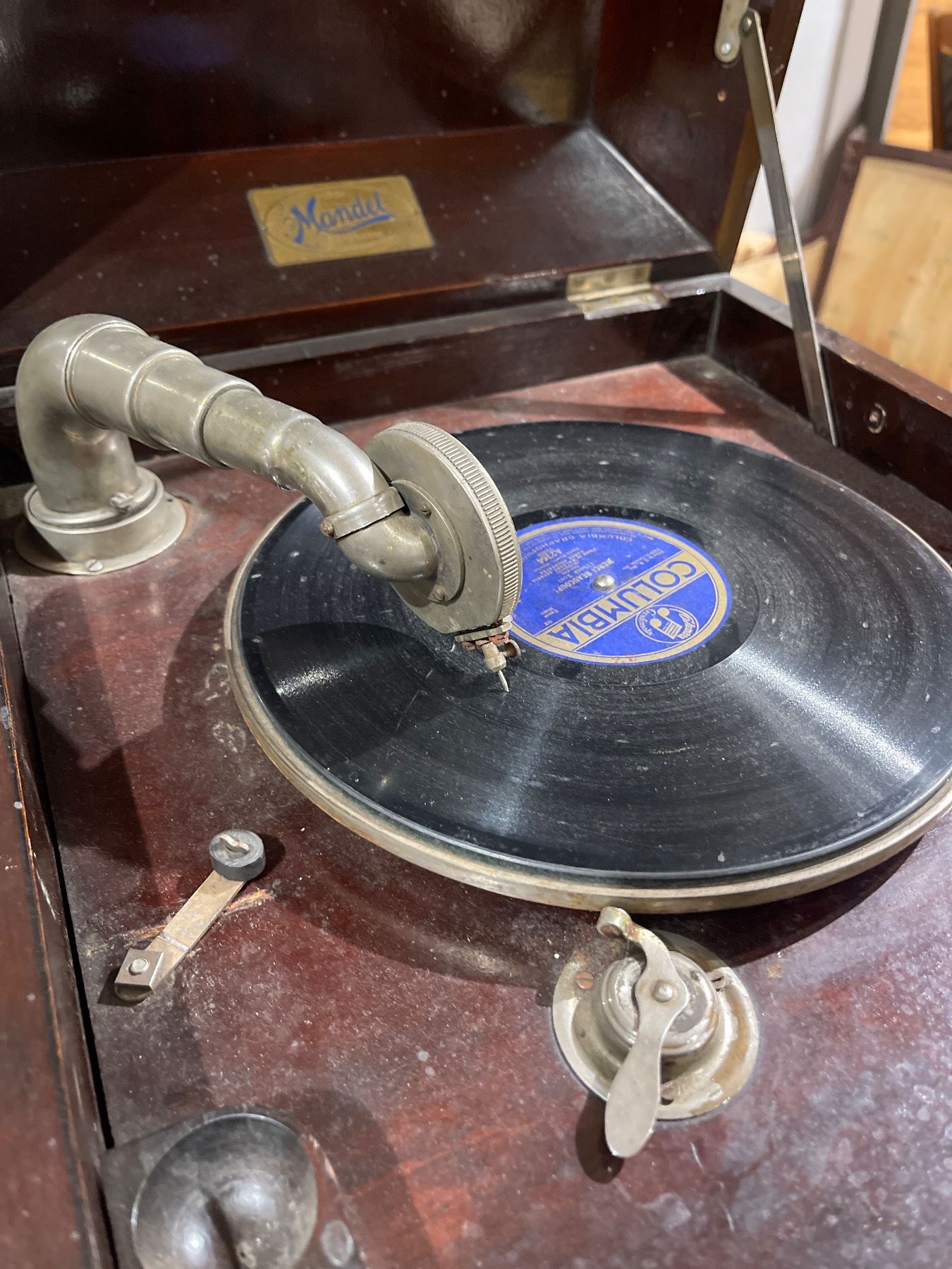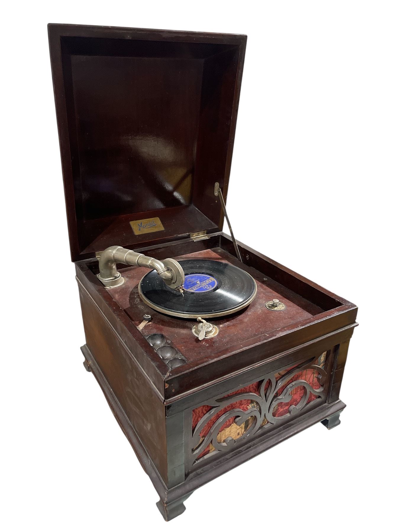 Antique Mandel phonograph from the early 20th century featuring a wood cabinet with manual crank operation. Known for its craftsmanship and sound quality during its era. Includes internal components as pictured. Item is as pictured.