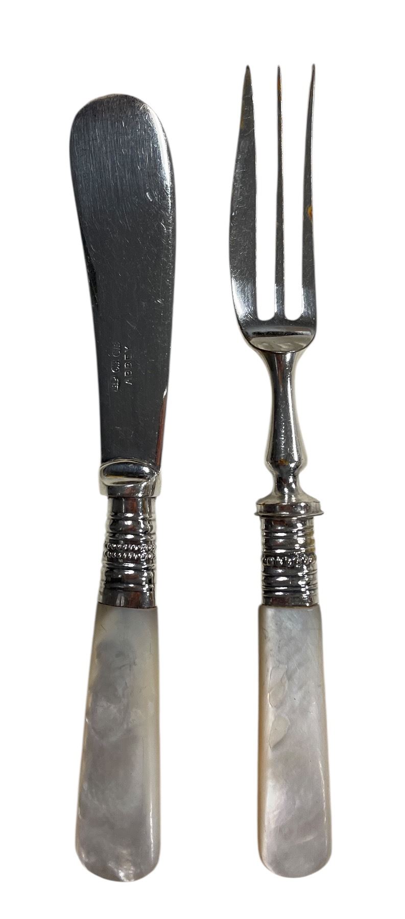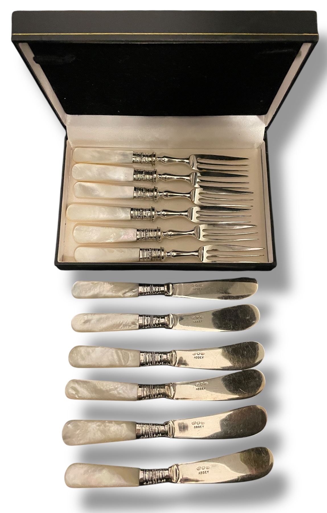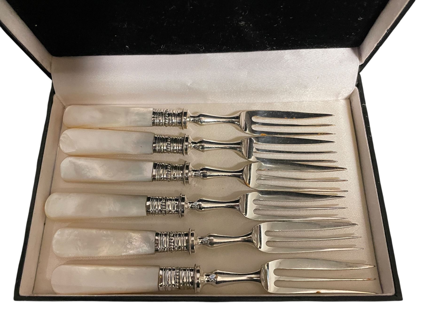 Antique Pearloid Handled Dessert Forks & Knives Set - Silver Plated in Fitted Case