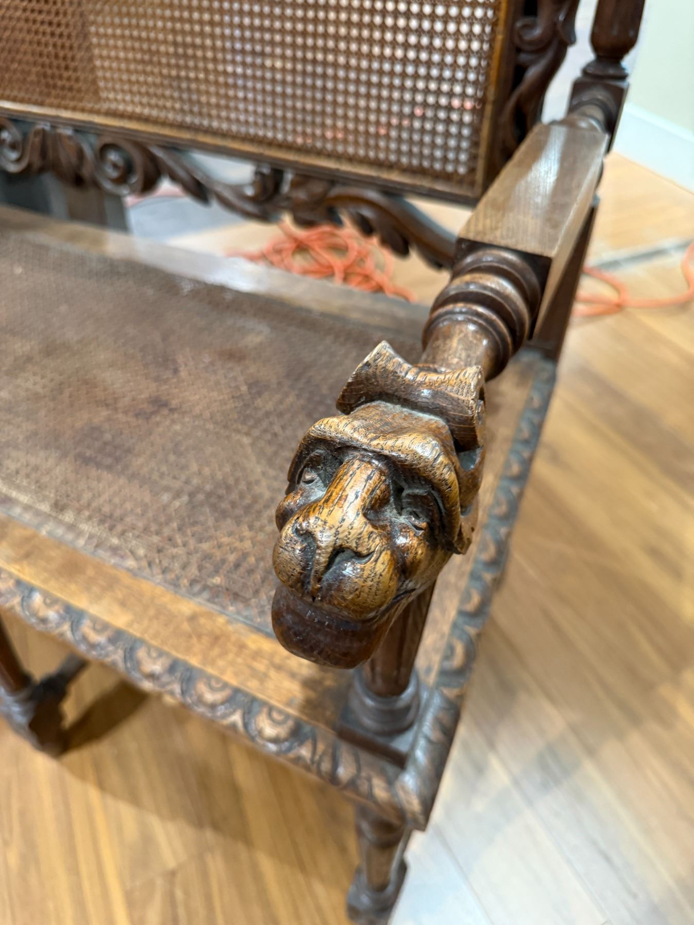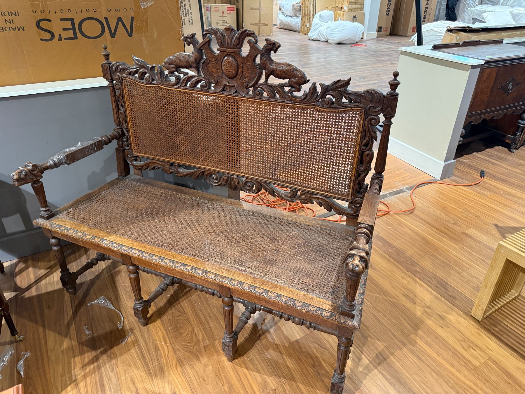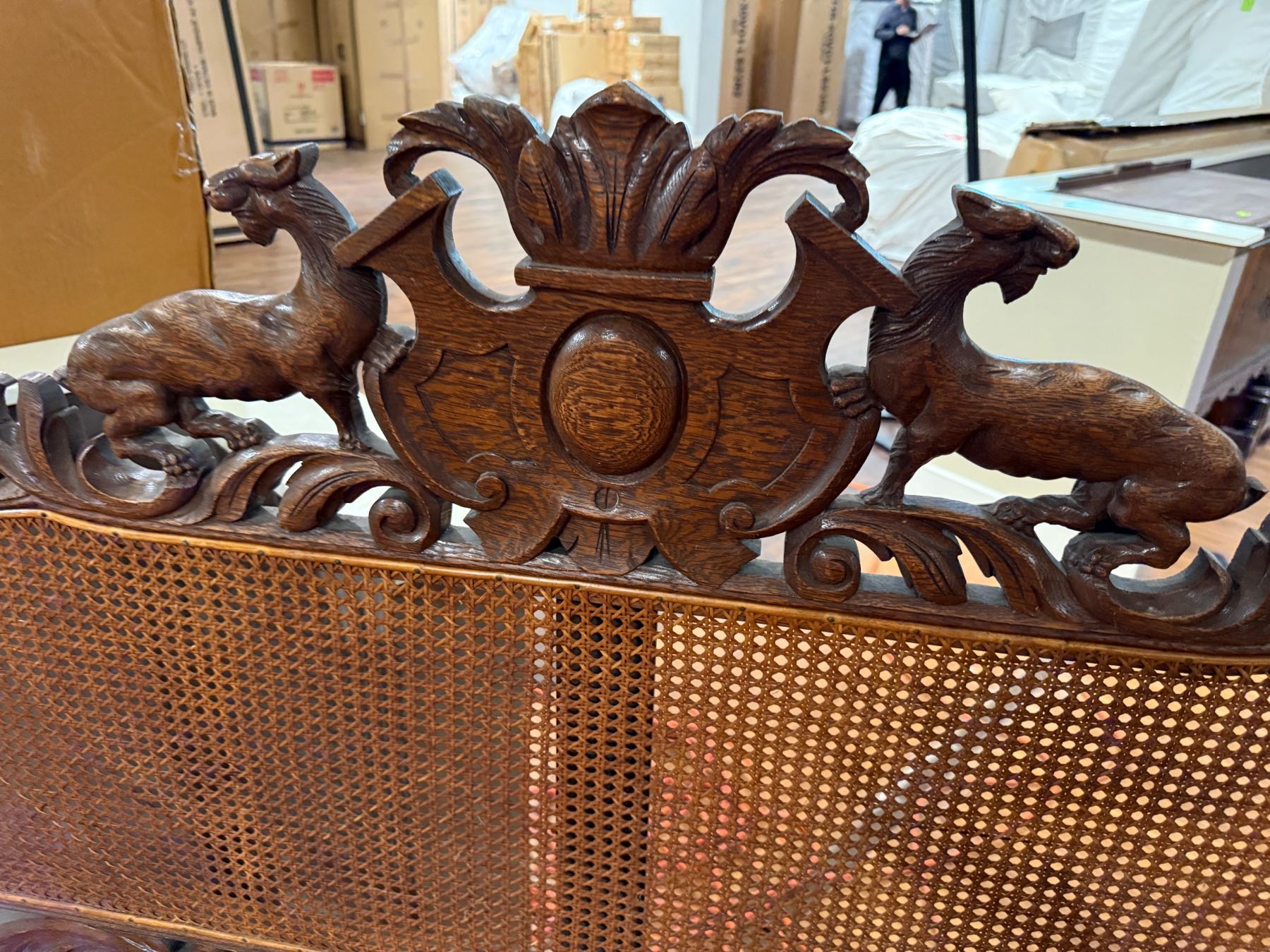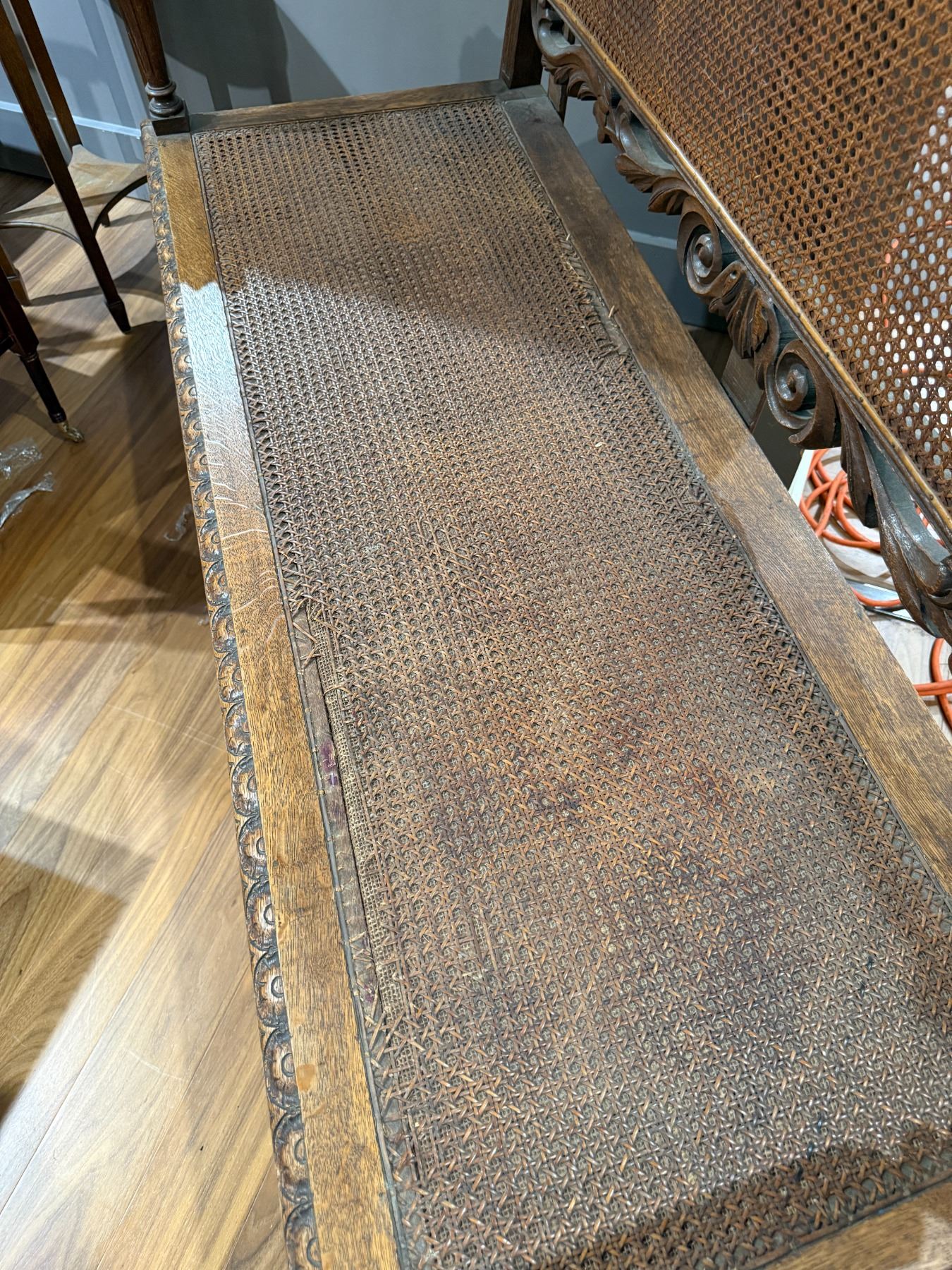 Antique Renaissance Revival carved settee featuring detailed English-style carvings with a rattan seat. Dimensions are 535.5-Inch length, 22-Inch width, and 48-Inch height. Crafted from wood with intricate design elements reflecting the era's style. Item is as pictured.