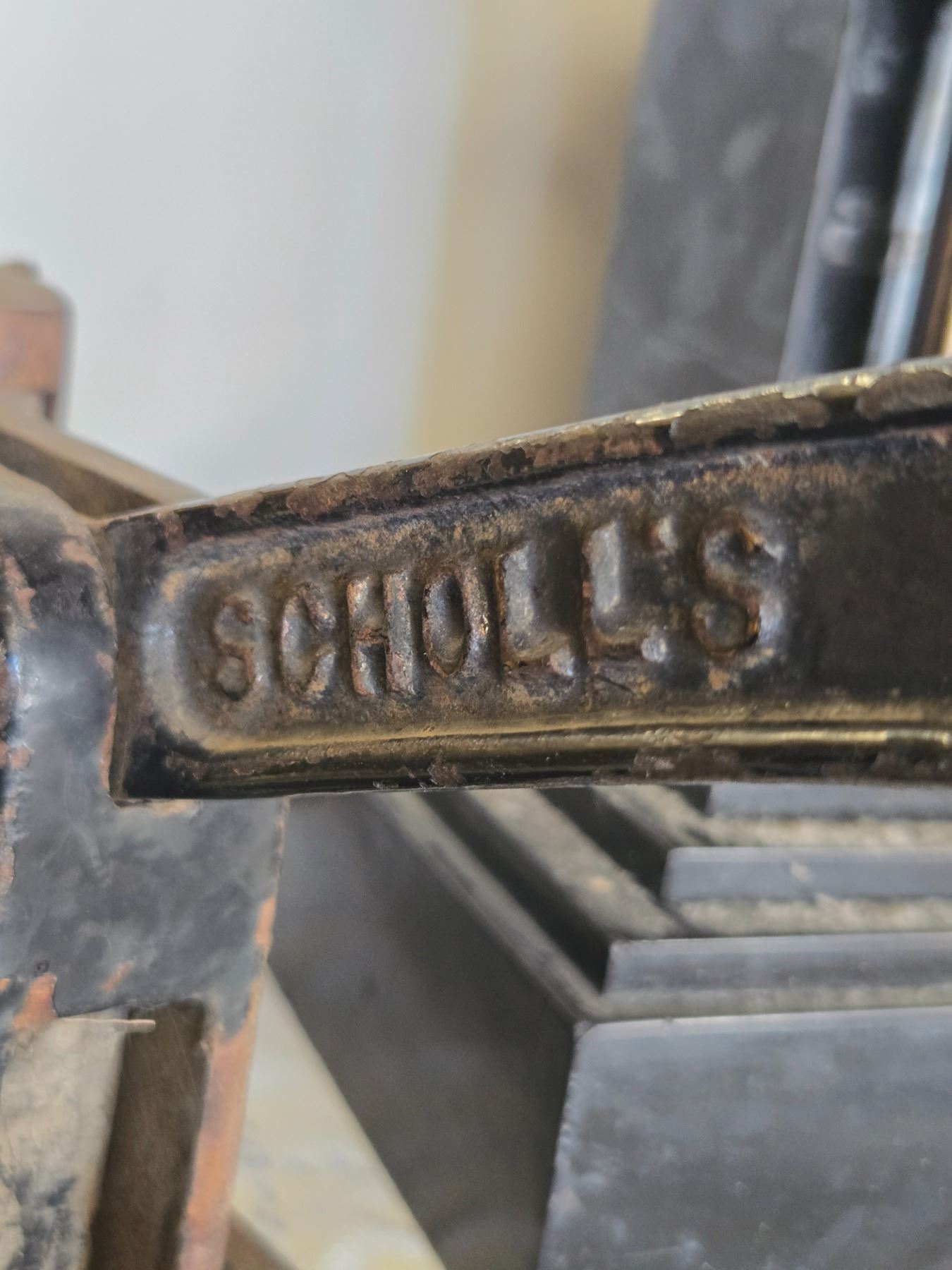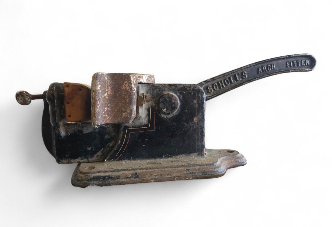 Antique Scholls Arch Lifter Cobbler's Machine made of cast iron, associated with early 20th-century cobbling tools. Designed for shoe repair and shaping, it features an arch support functionality. Item is as pictured, showing wear consistent with age and use.