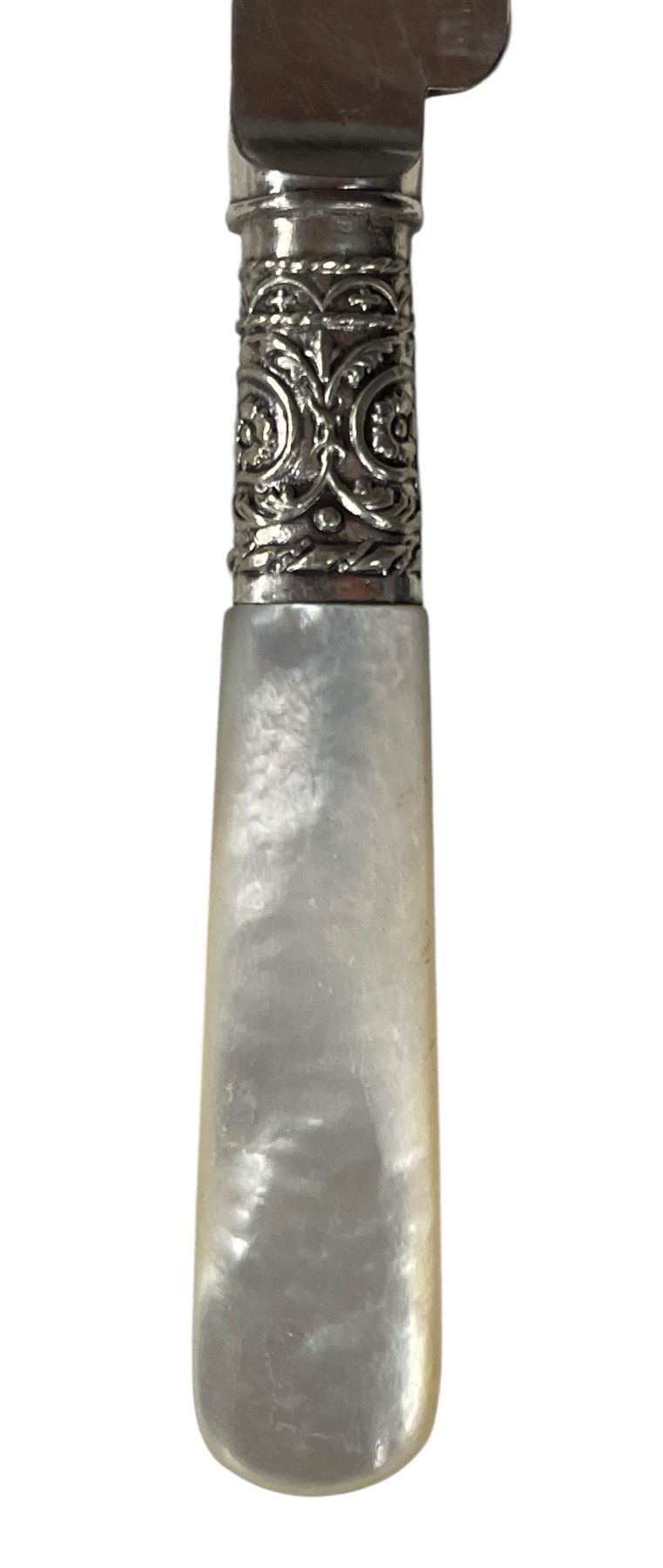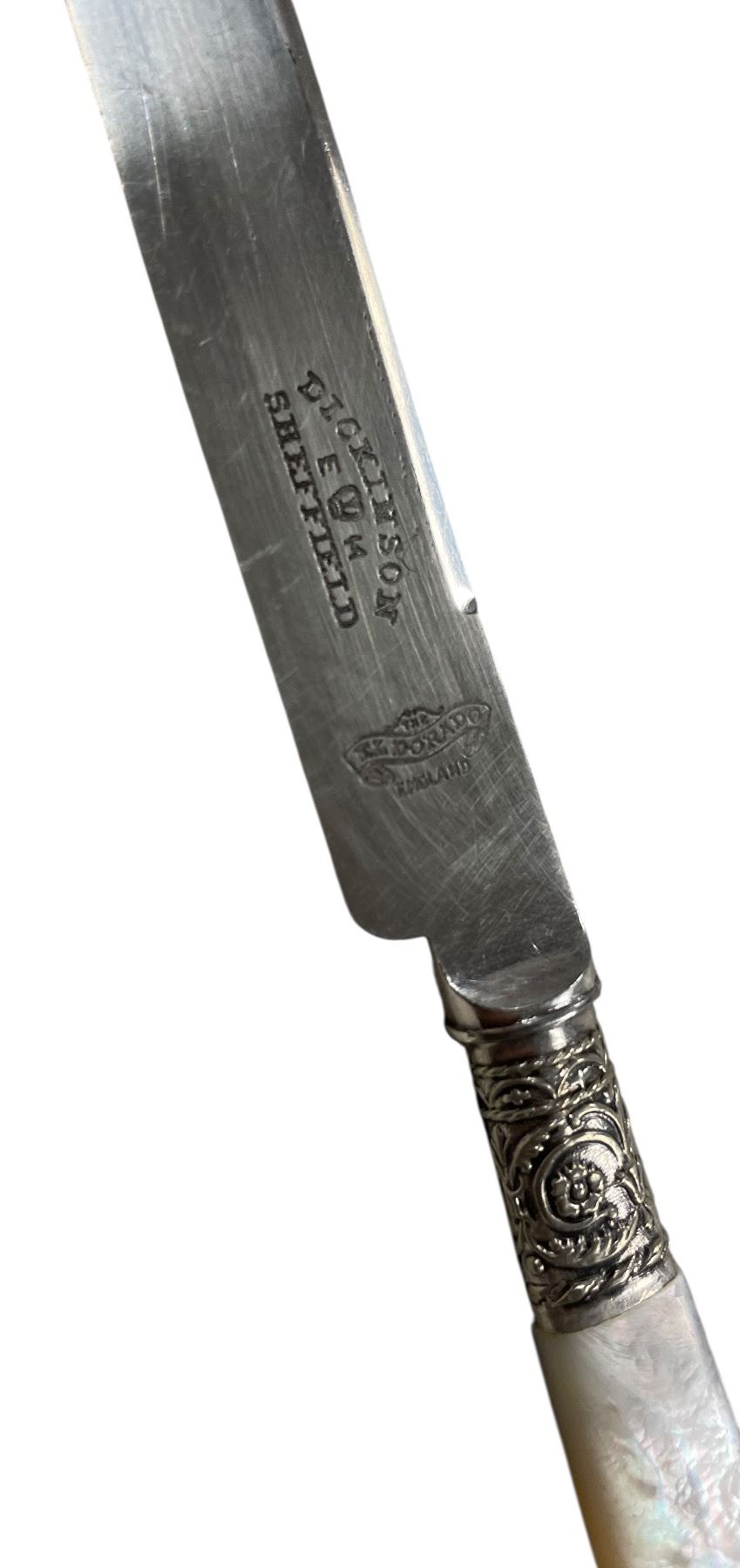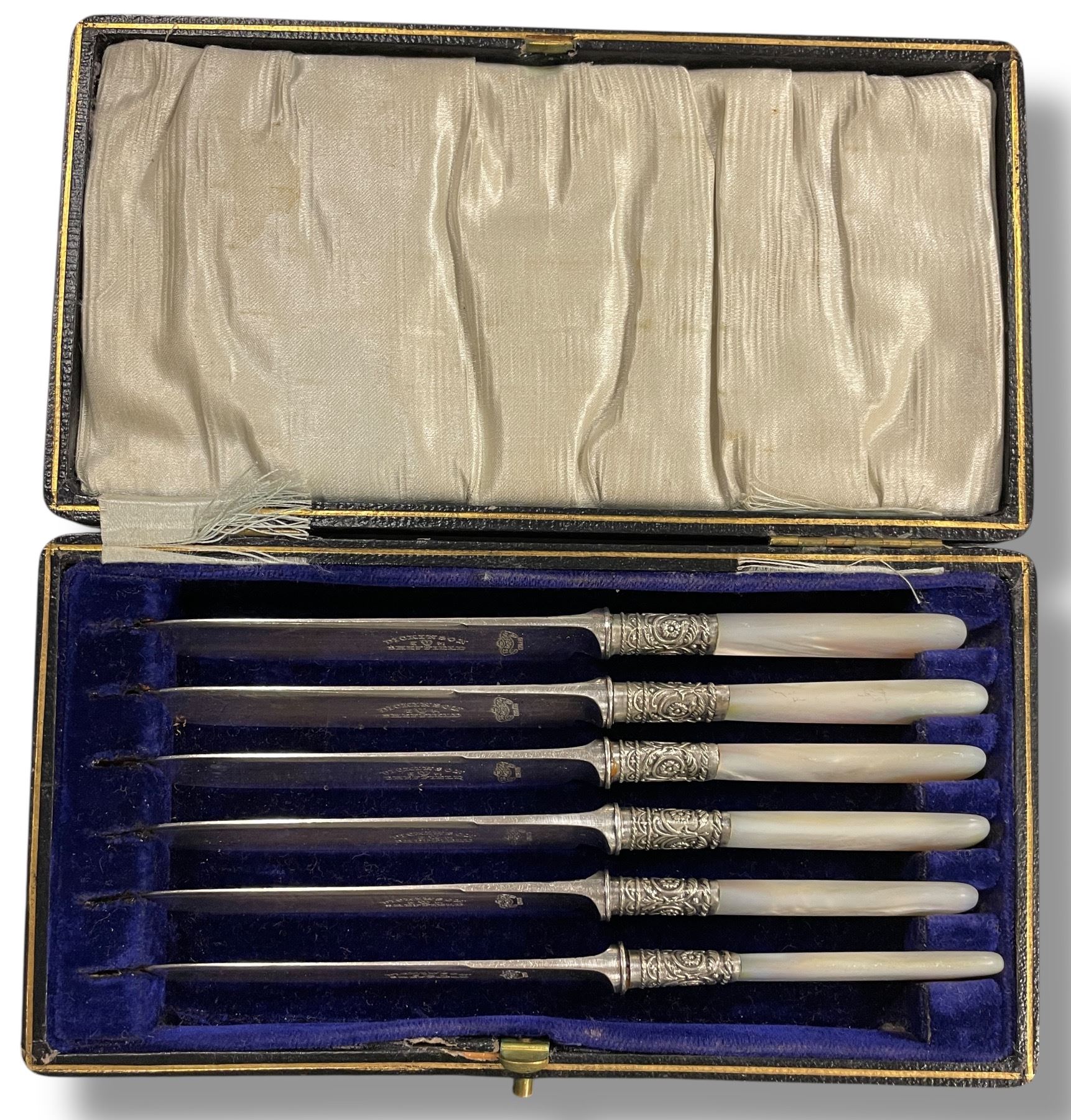 Antique Set of 6 Dinner Knives - Pearloid Handles and Dickinson Sheffield Blades in Fitted Case