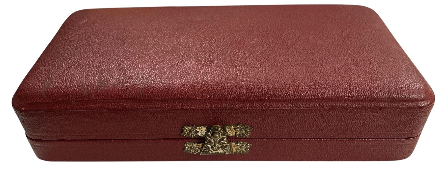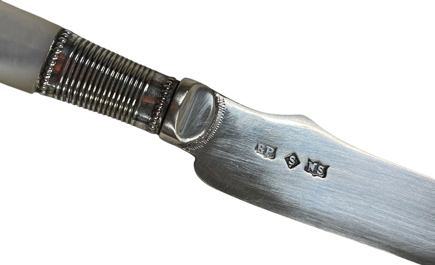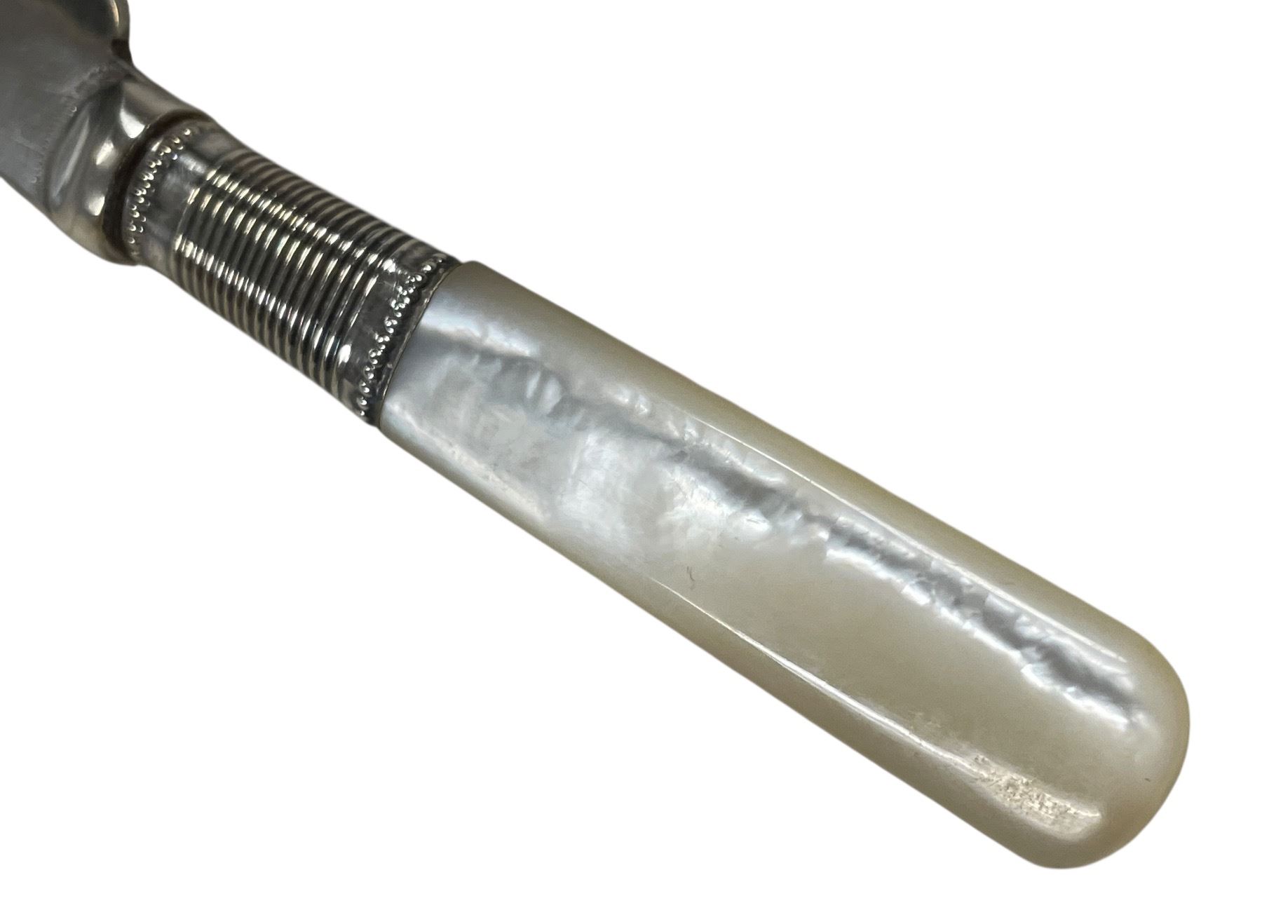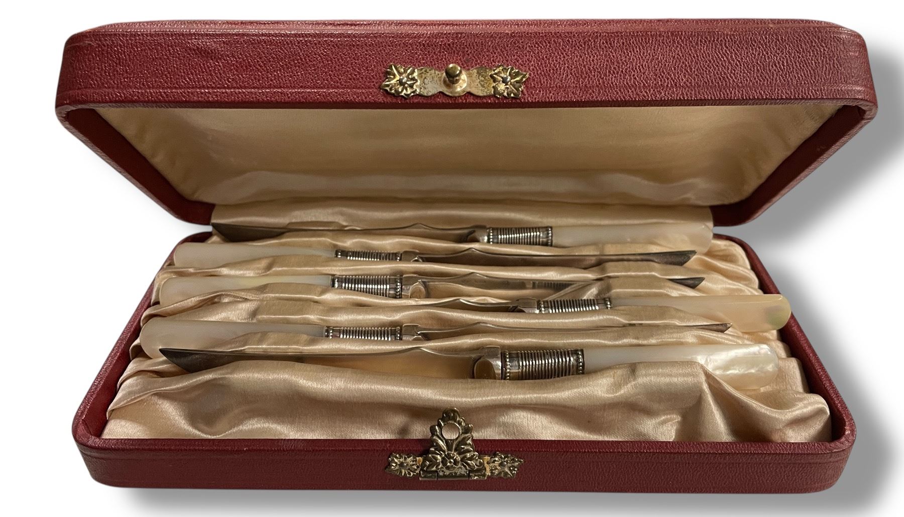 Antique Set of 6 Silver Plated Dinner Knives with Pearloid Handles in Fitted Case