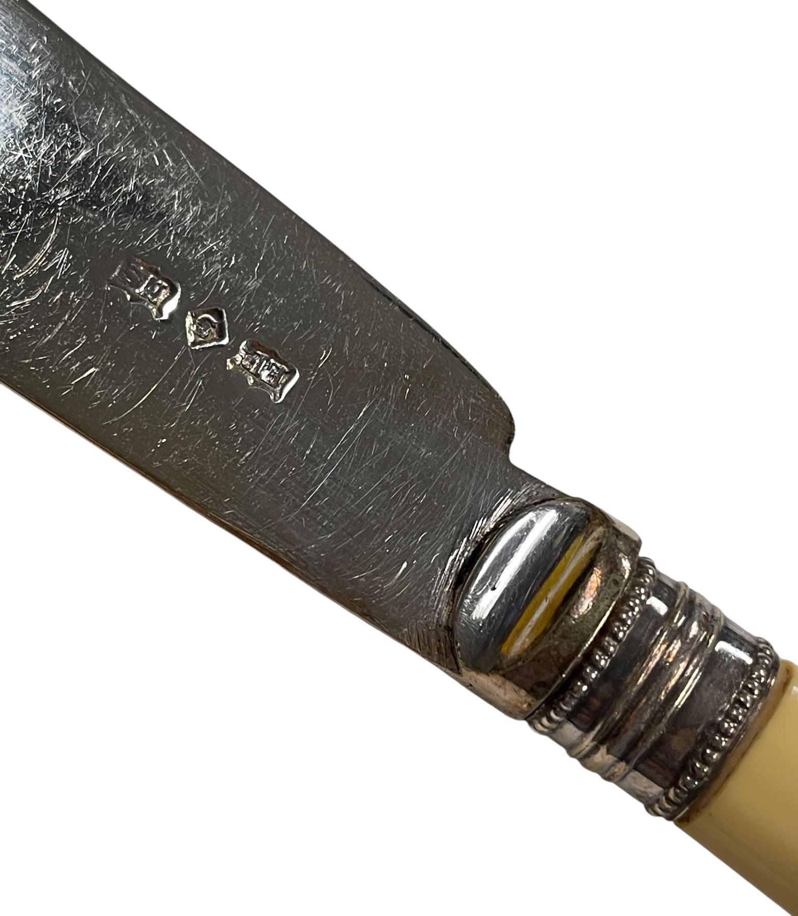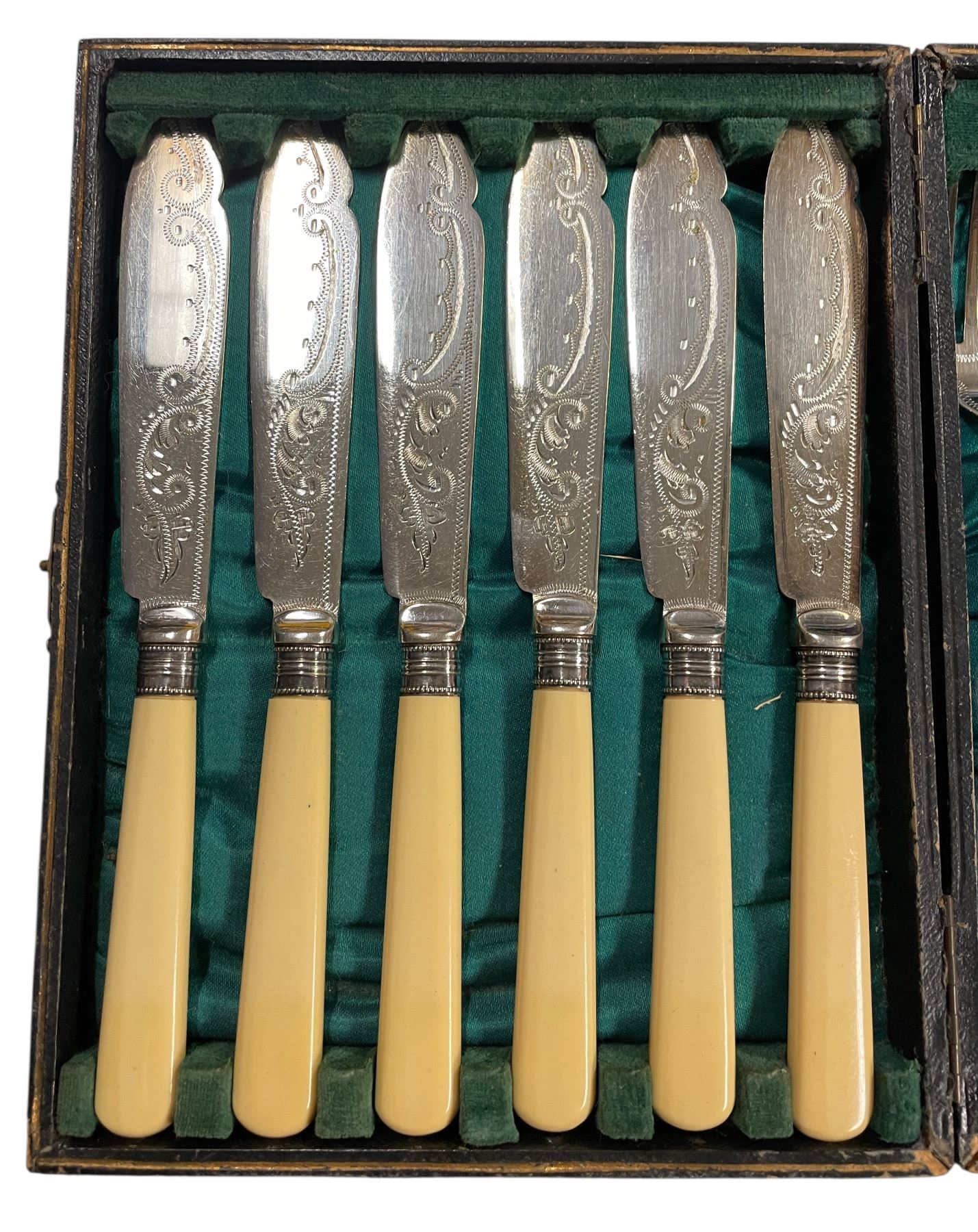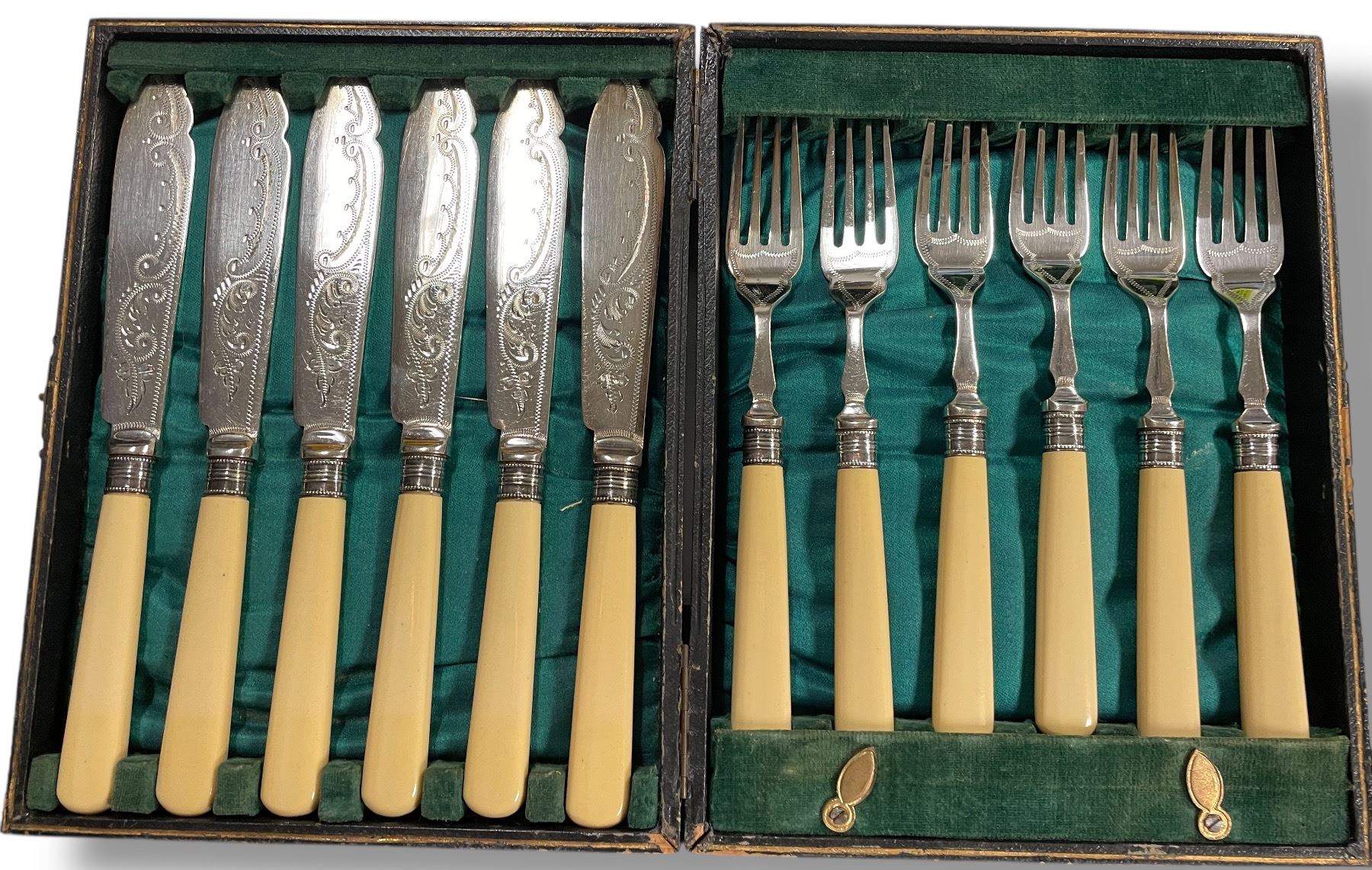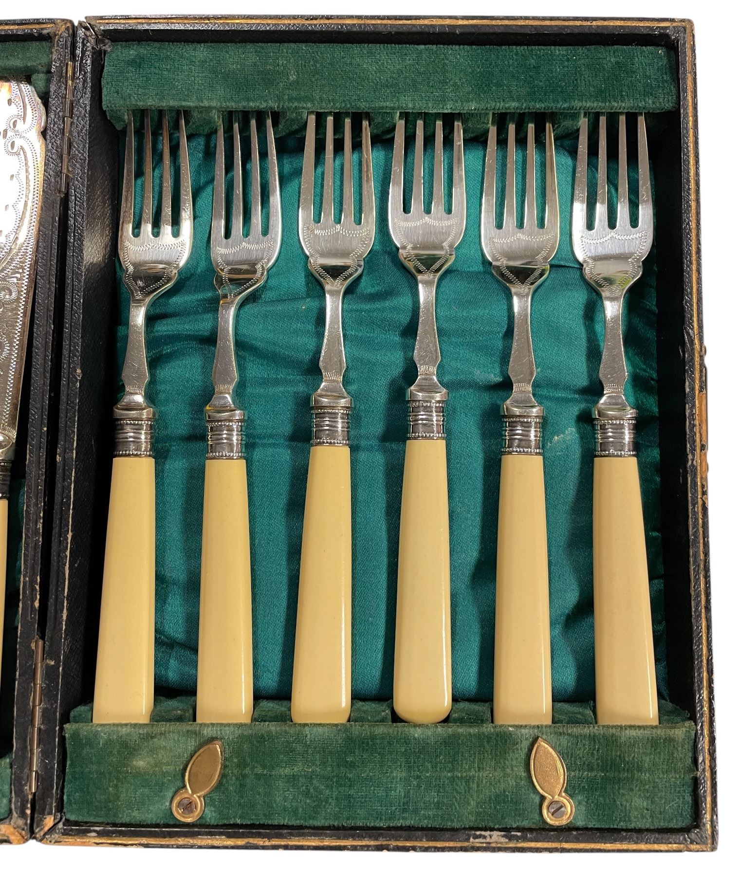 Antique Silver Plated Forks & Knives Set with Faux Bone Handles in Fitted Case