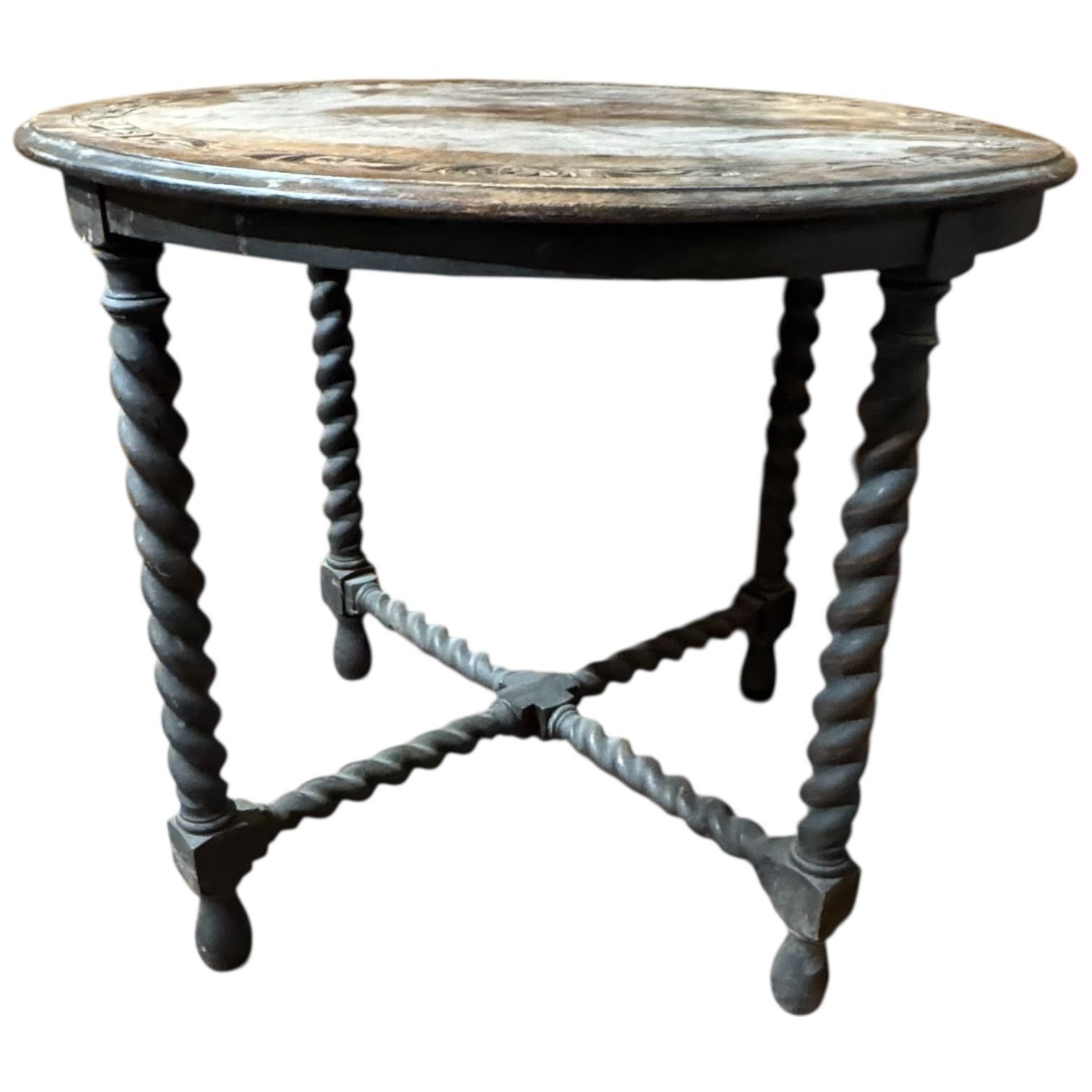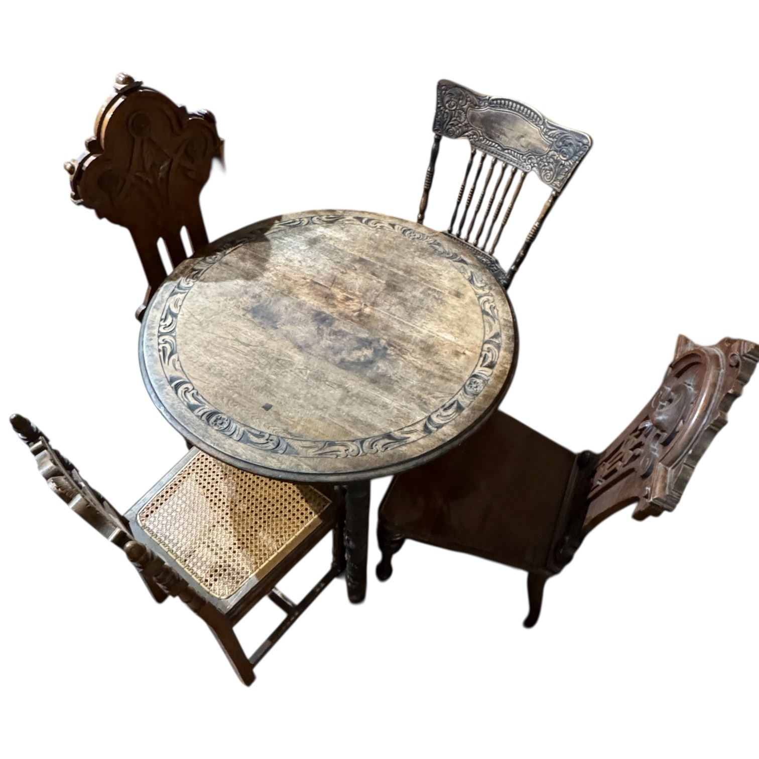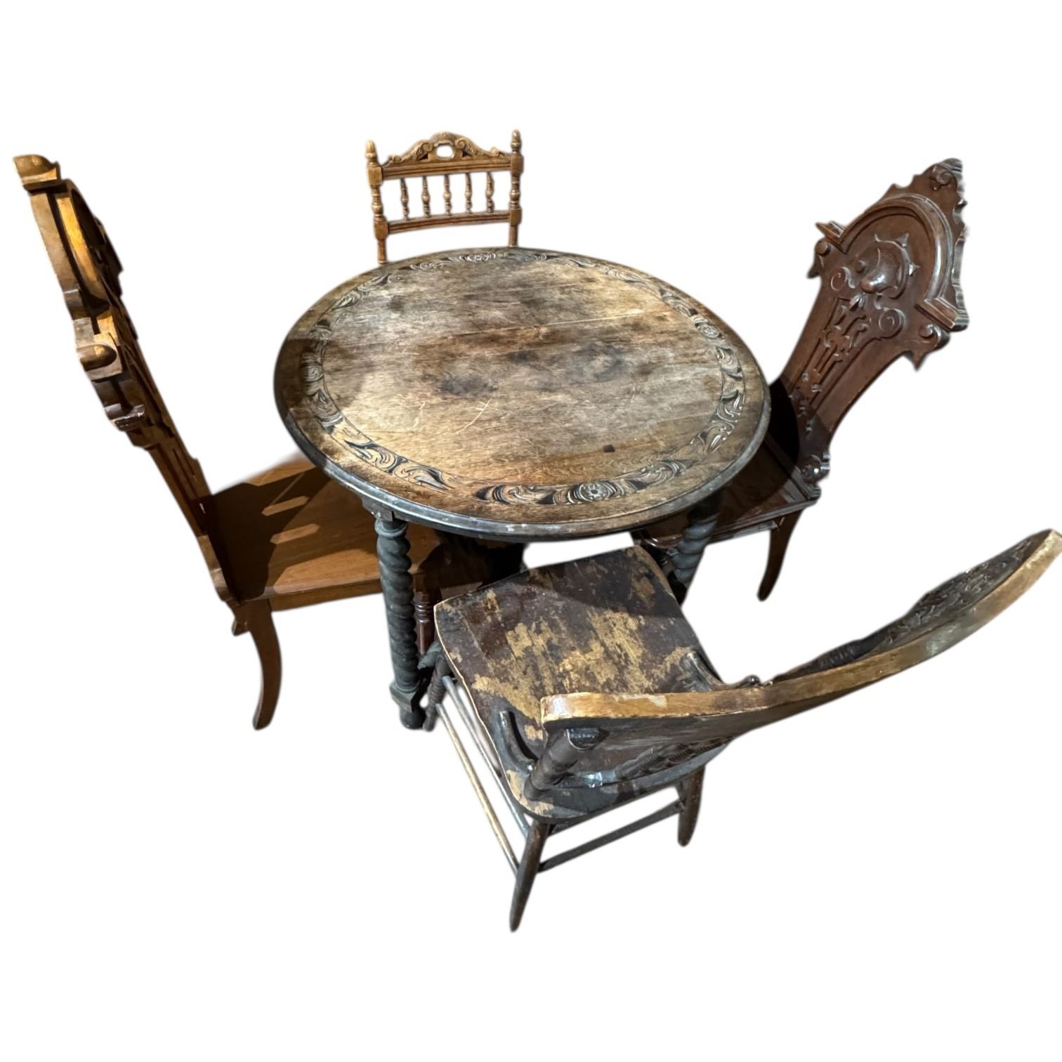 Antique round table featuring barley twist legs and a carved wooden top, measuring 35-Inch in diameter and 39-Inch tall. Includes a set of 4 mixed style antique chairs.