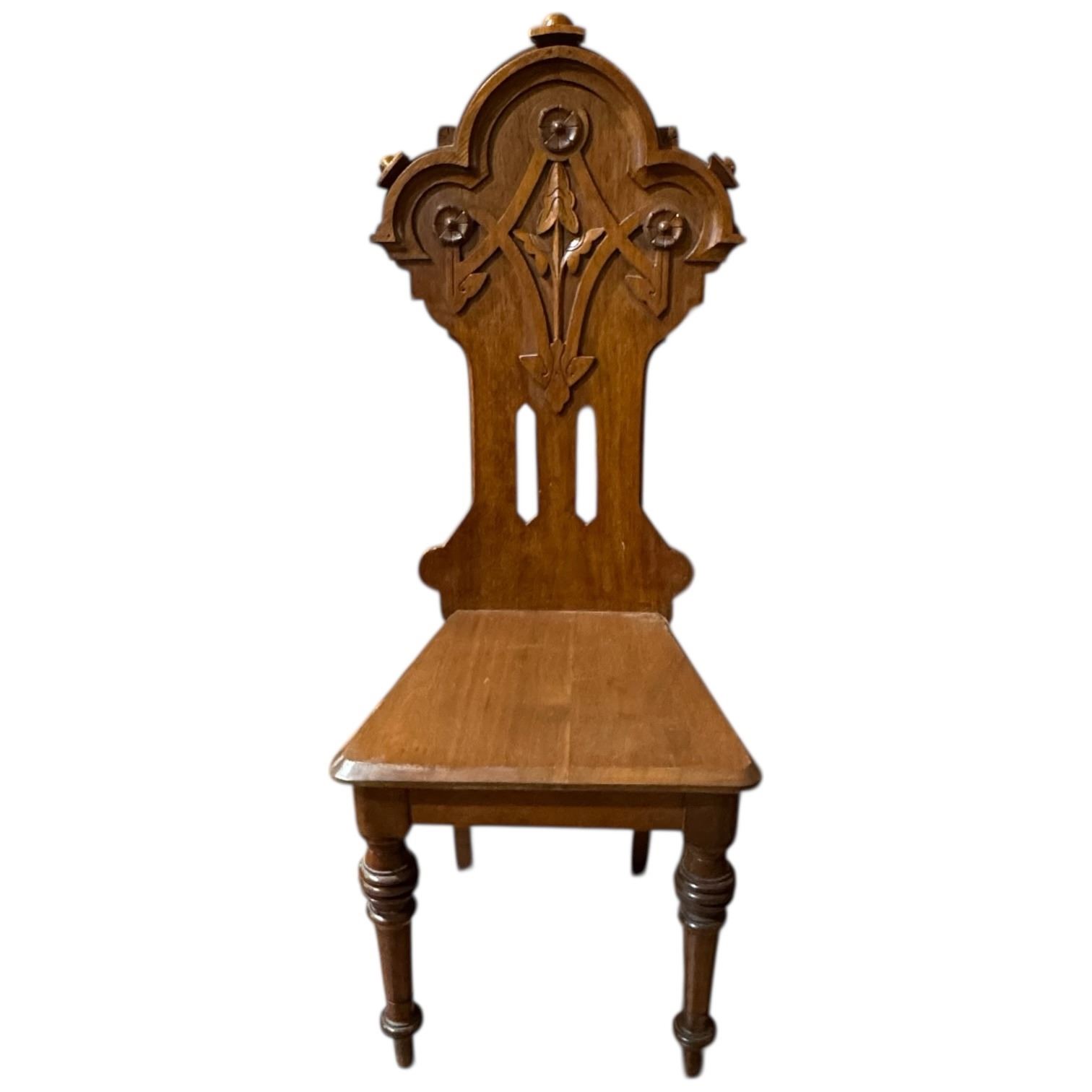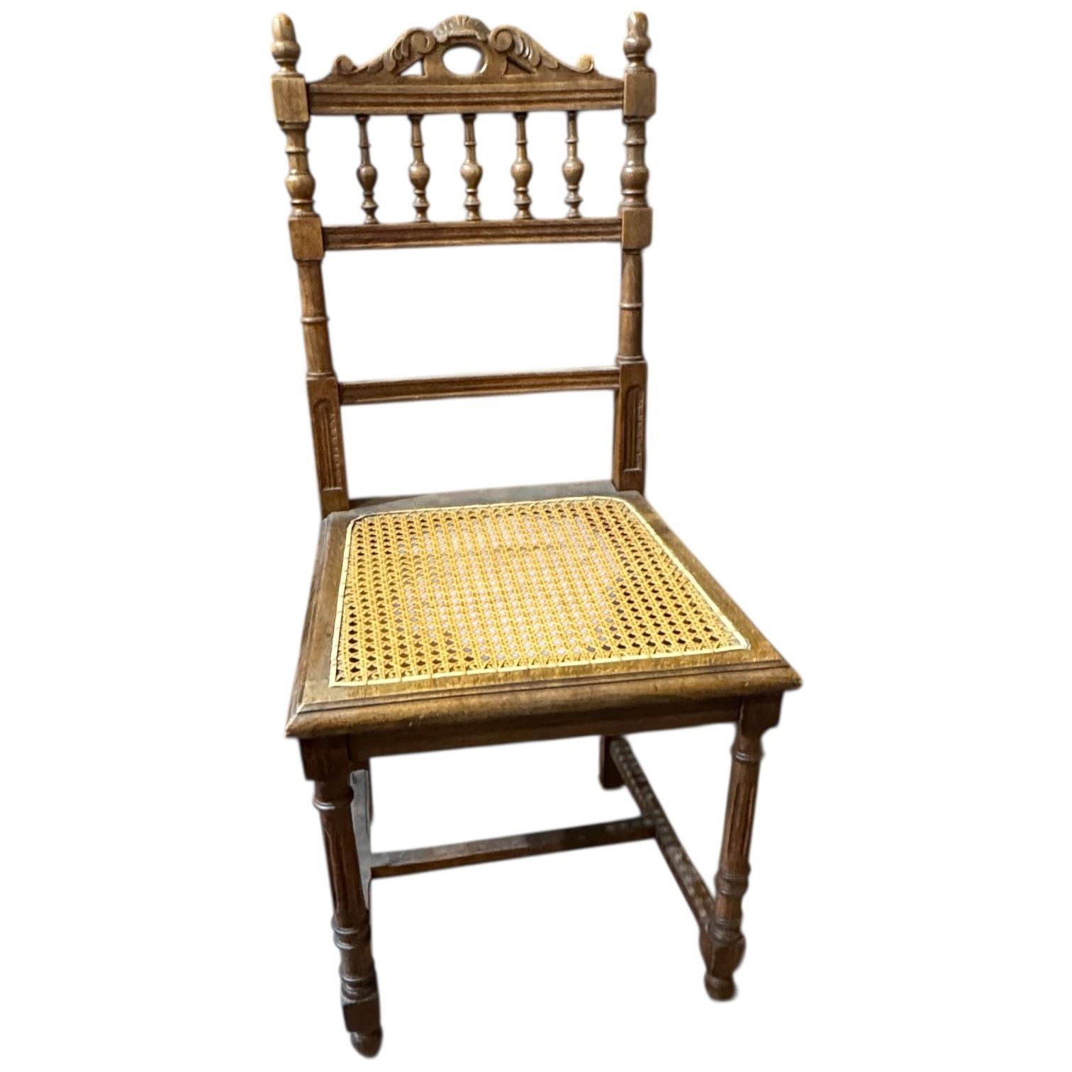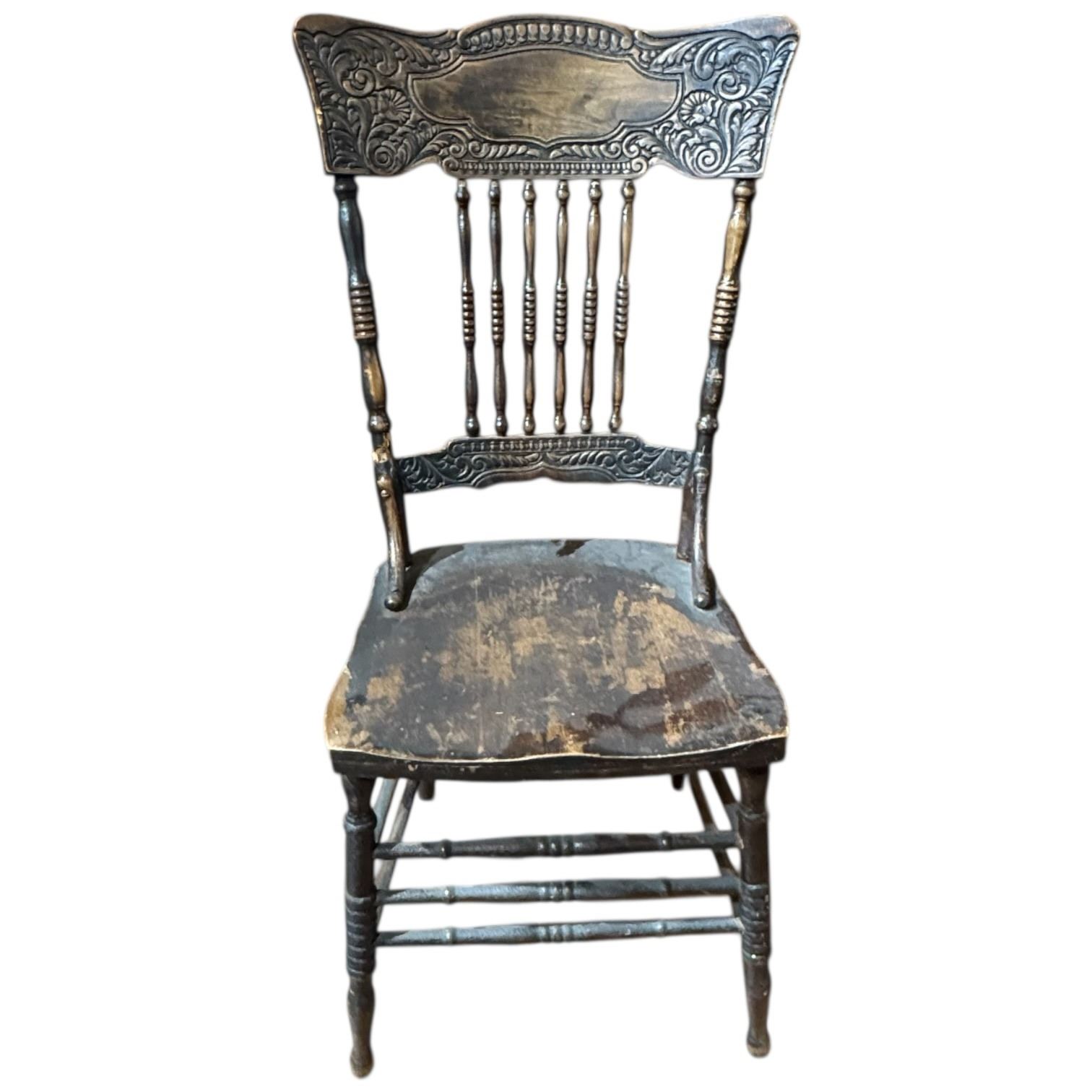 Antique round table featuring barley twist legs and a carved wooden top, measuring 35-Inch in diameter and 39-Inch tall. Includes a set of 4 mixed style antique chairs.