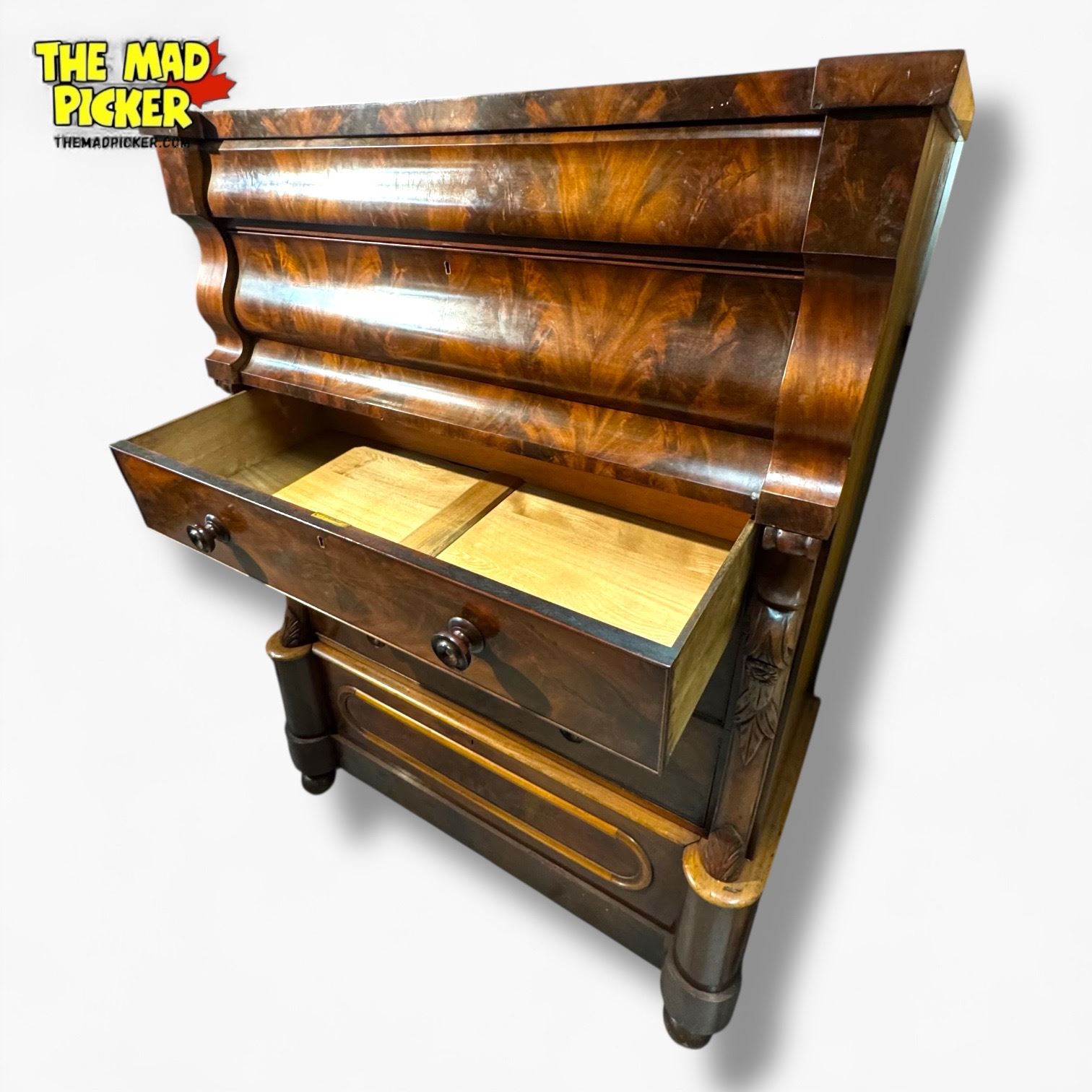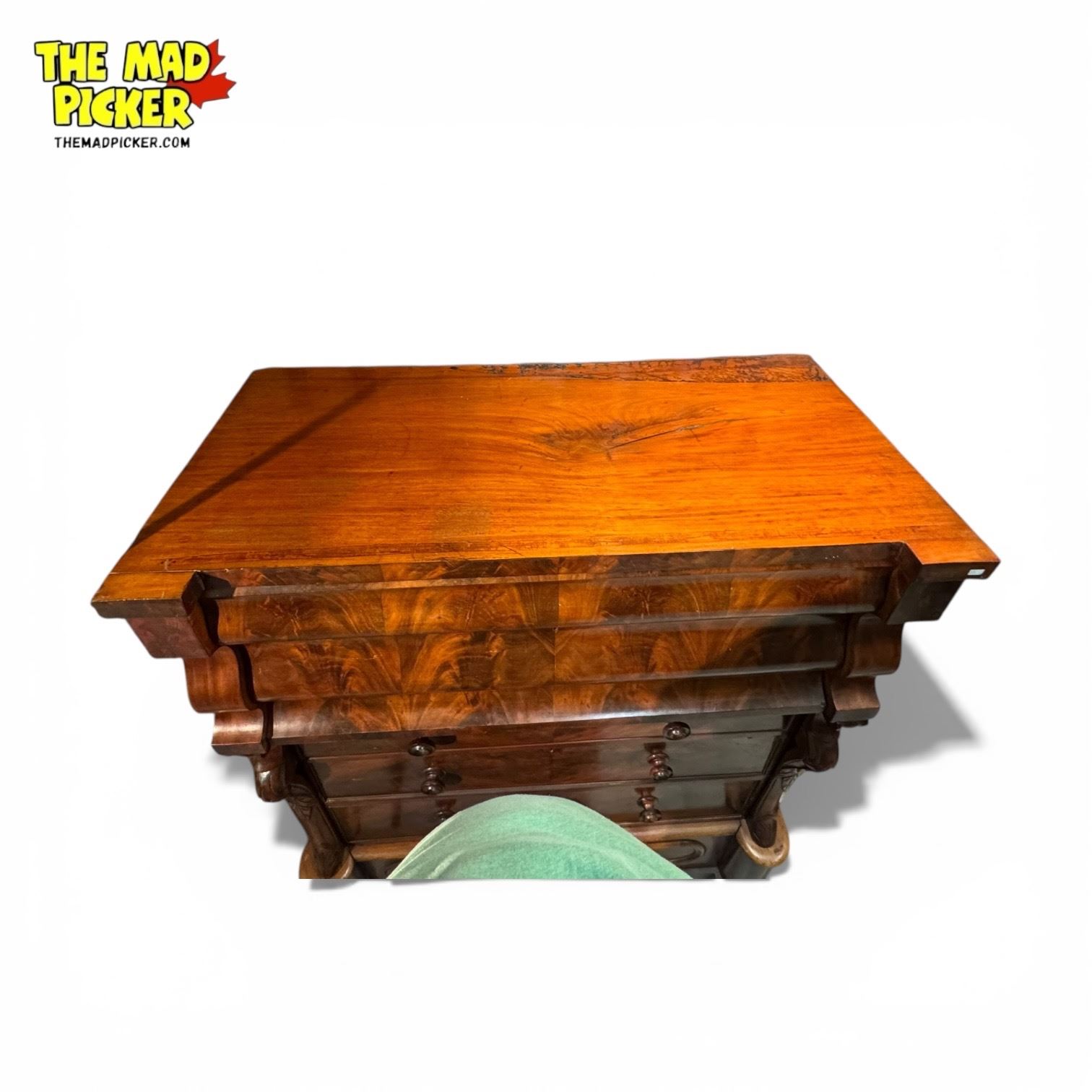 Antique Victorian Scotch chest of drawers, likely mid-to-late 19th century. Made of mahogany with flame mahogany veneers. Features an ogee design with a curved frieze drawer, graduated drawers, flared pediment, and carved columns. Original turned wooden knob handles. Measures 48x24x64.5". Comes with key. Needs some repairs.