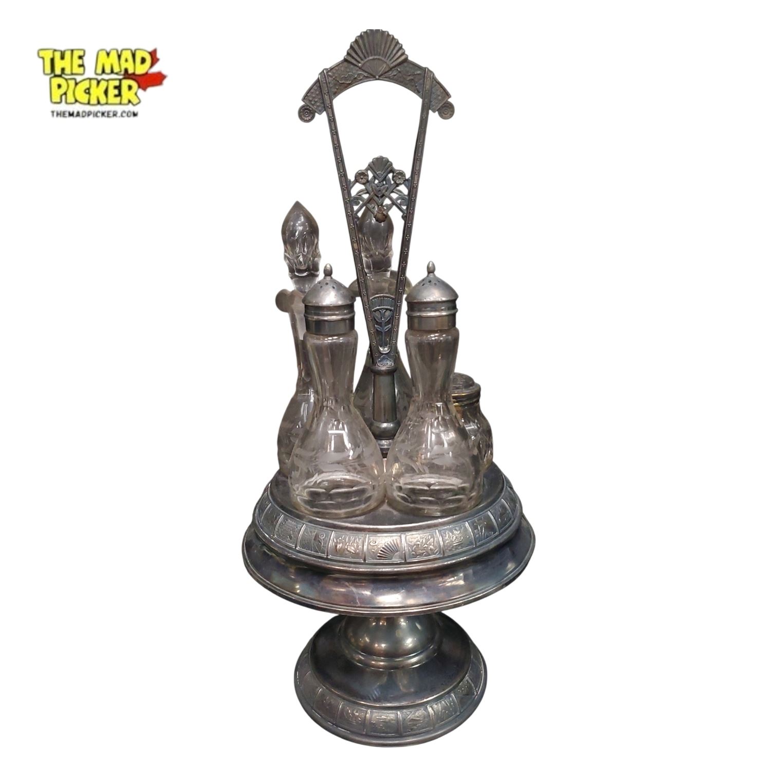 Victorian-era silver-plated cruet set by Reed & Barton, marked 'Hand Plated by Reed 4000.' Features a stand with intricate detailing and provisions for multiple condiment bottles. Likely dates to late 19th century. Classic example of Victorian dining tableware.