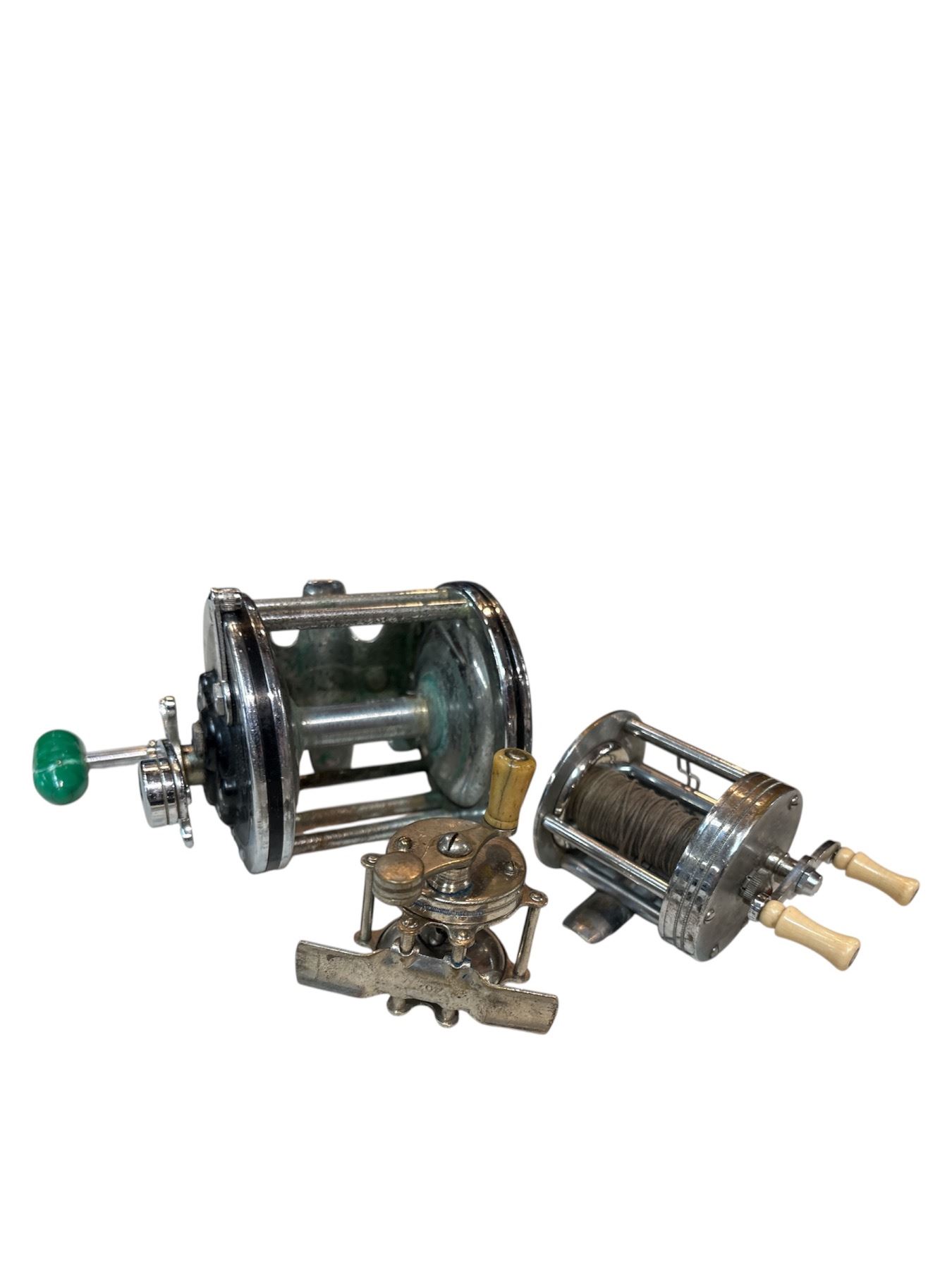 Lot of antique and vintage fishing reels including a Hendryx Fishing Reel, Shakespeare Model 1959, and Penn Senator. These reels represent notable examples of fishing equipment from earlier manufacturing periods. Item is as pictured.