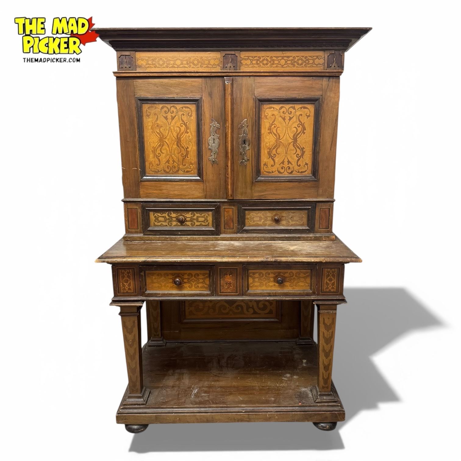 Antique walnut architectural china/silverware cabinet in Renaissance Revival style, circa 1860. Two-piece construction featuring detailed carved embellishments, with overall dimensions of 43x27.5x70 inches. Designed for elegant display and storage, supported on a matching stand. Likely European origin.