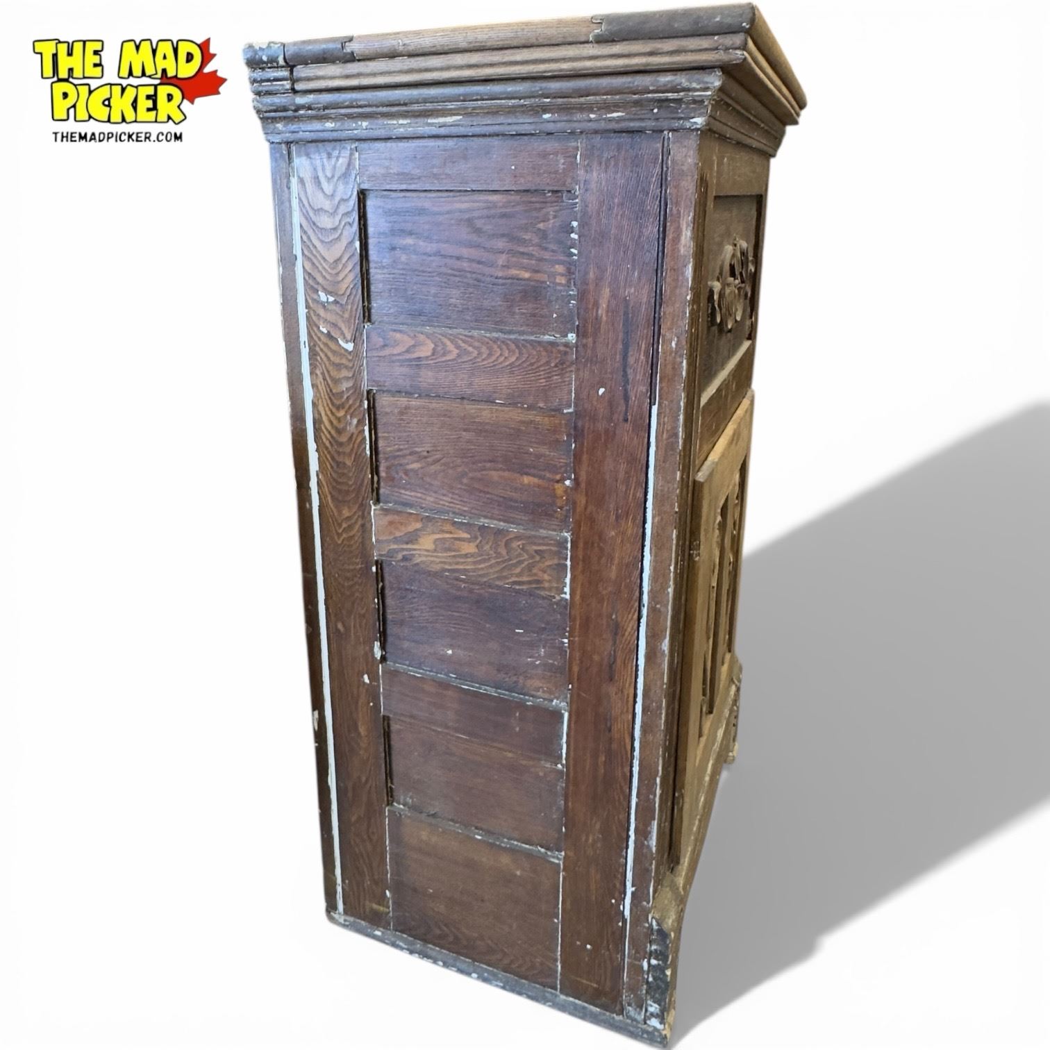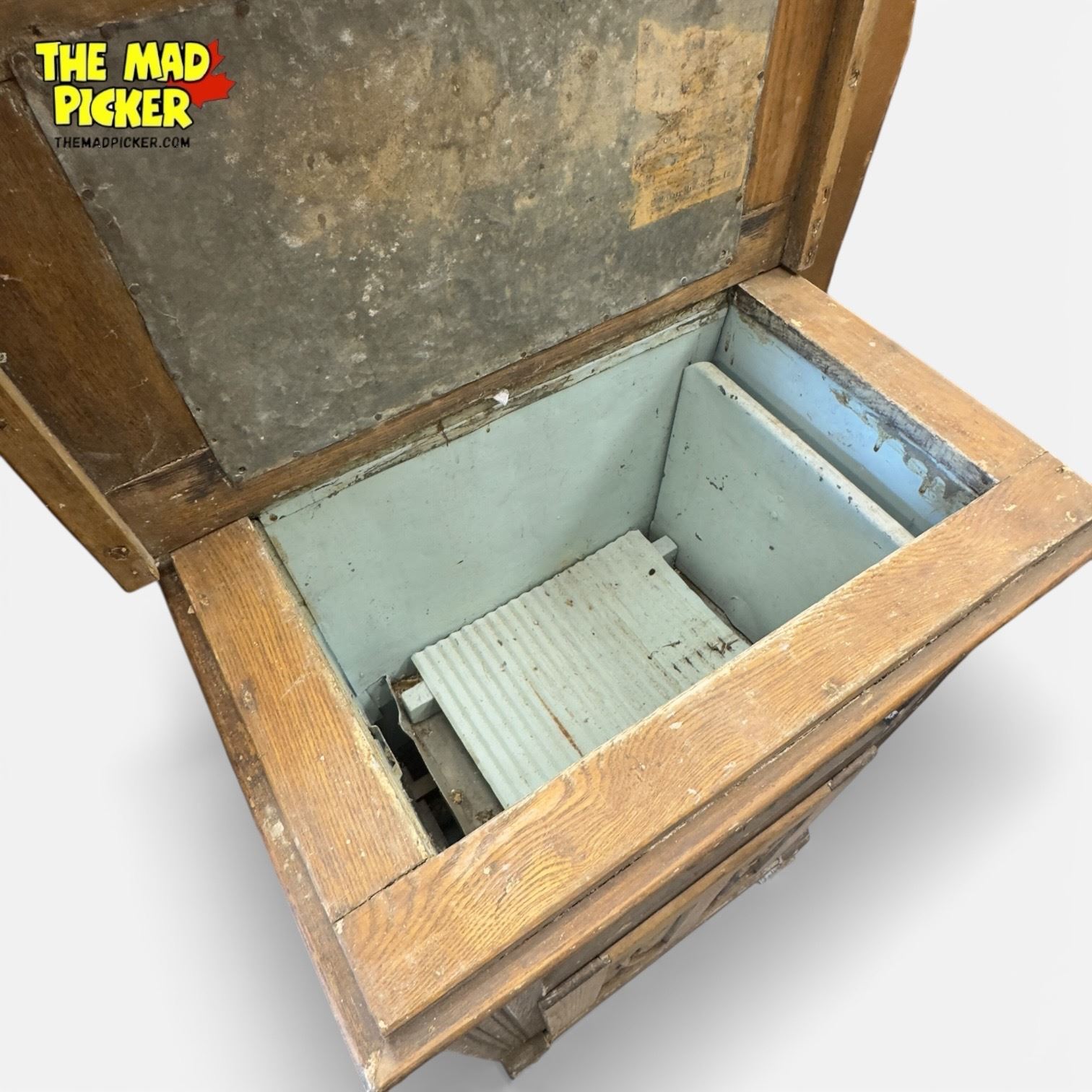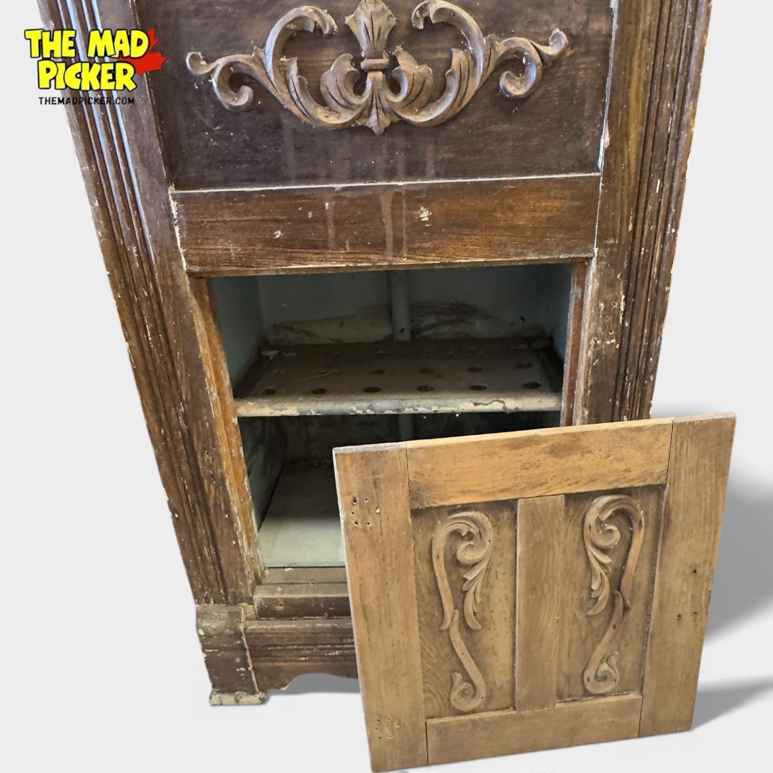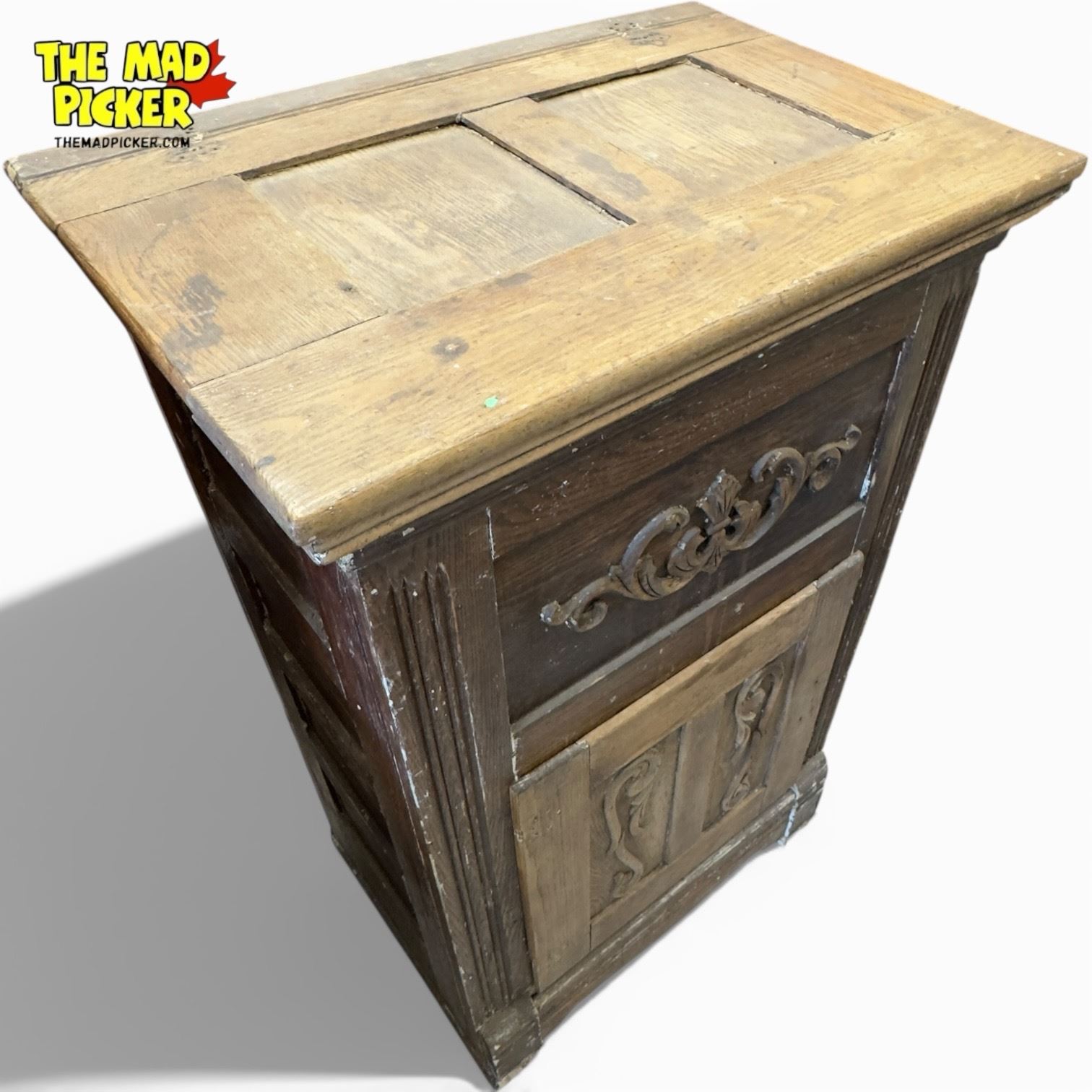 Antique wooden icebox featuring carved details, measuring 25.5 x 17 x 40 inches. Likely from the early 20th century, this piece includes metal hardware and interior compartments. Condition indicates need for restoration, with wear consistent with age and use. A functional kitchen appliance of its time.