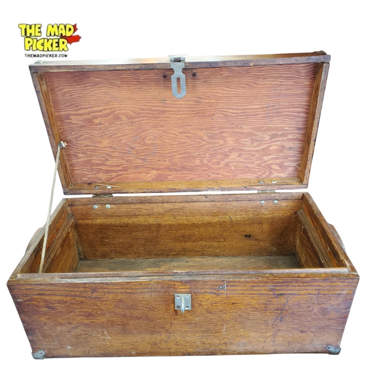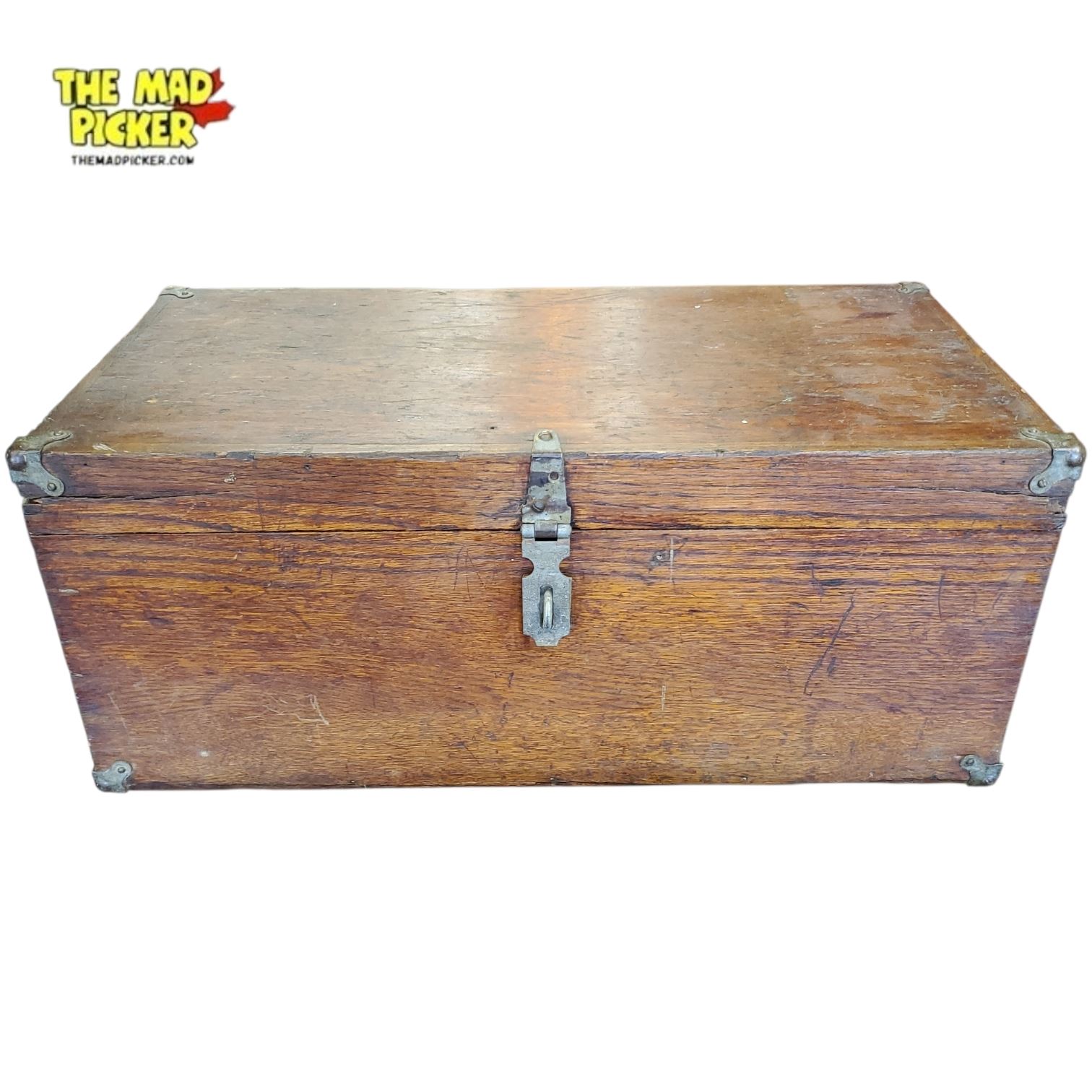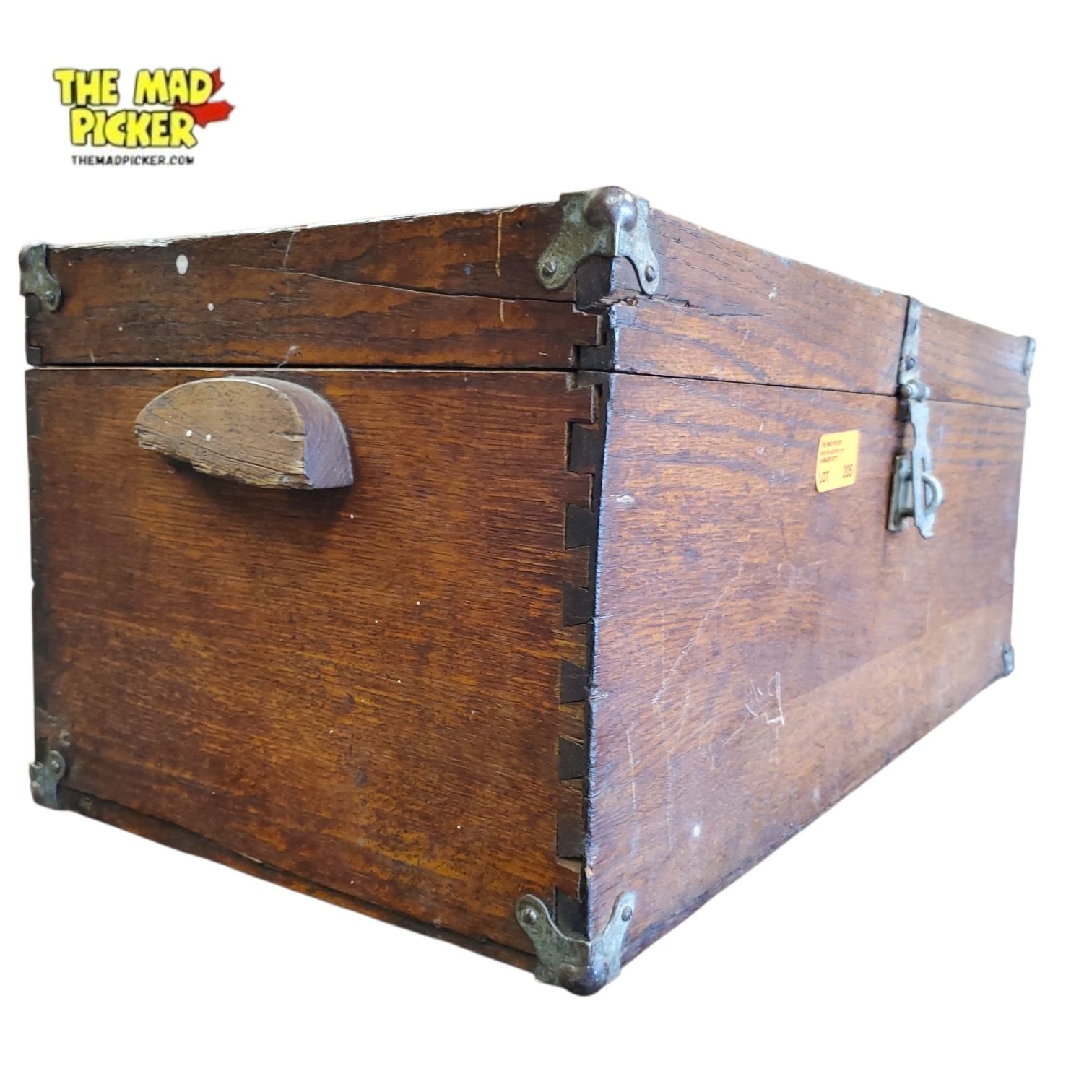 Antique wooden storage chest, potentially an Indian teak Pitara dowry chest. Features metal corner reinforcements and a central metal latch for securing the lid. Rich patina indicates age. Likely utilized by shopkeepers for storing money and important documents.