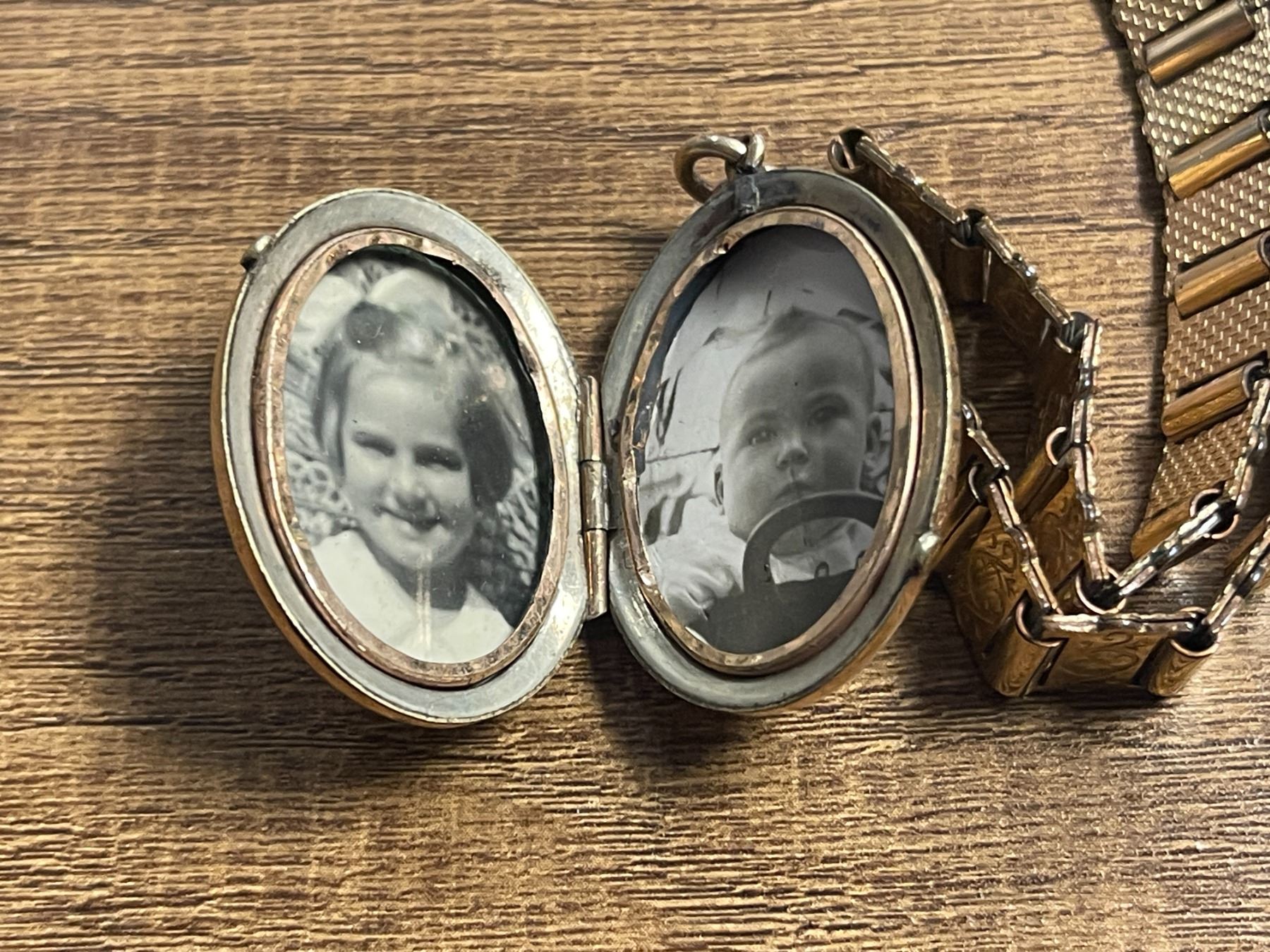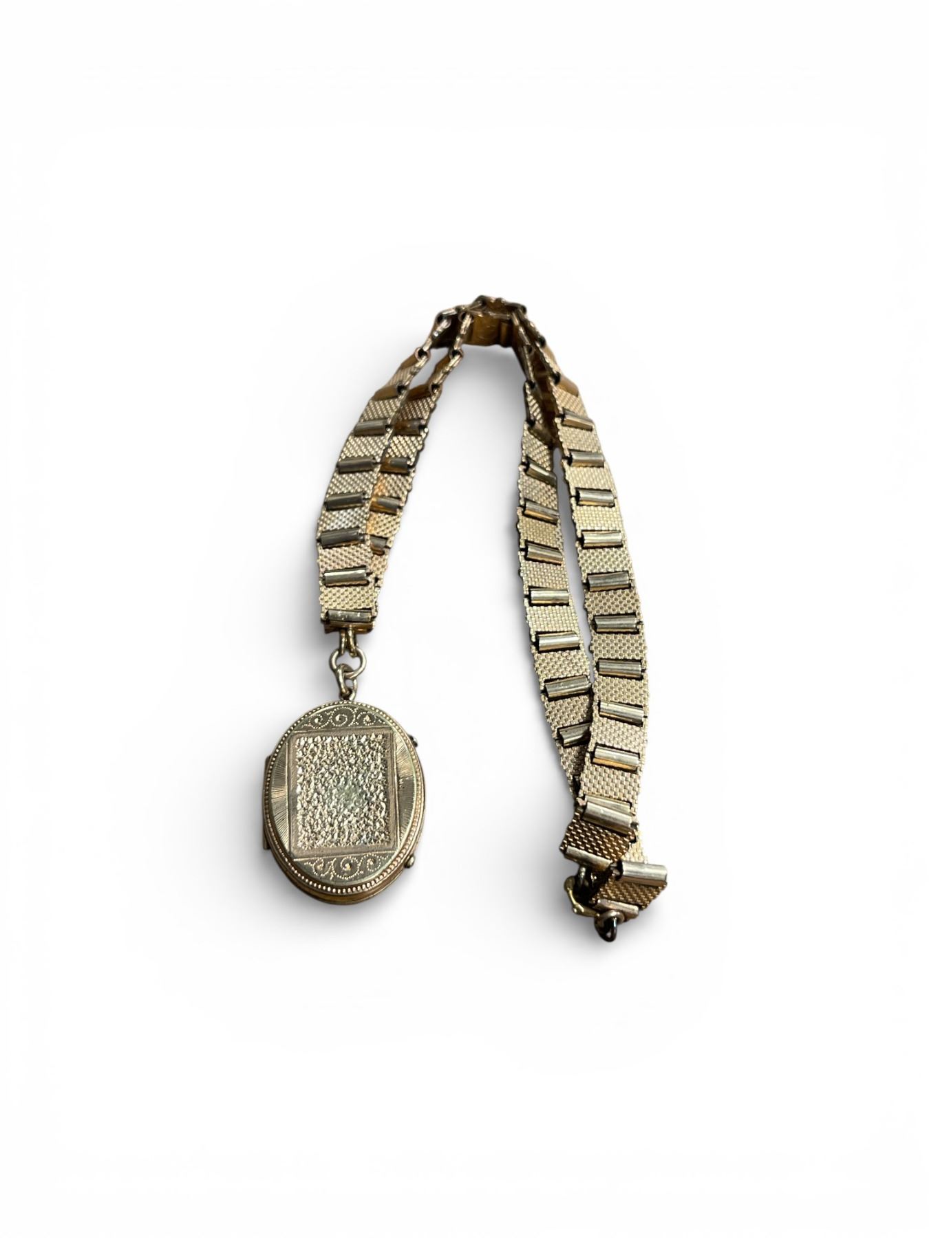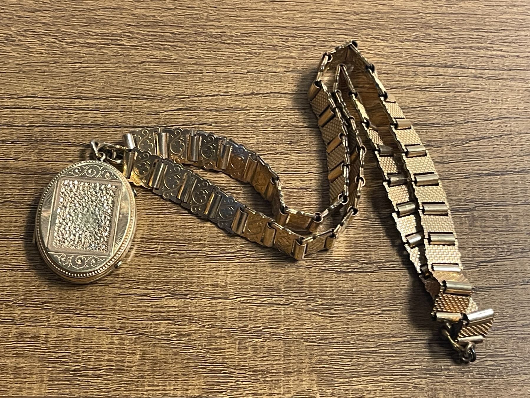 Antique gold colored engraved locket on a heavy 18" gold colored engraved patterned chain necklace