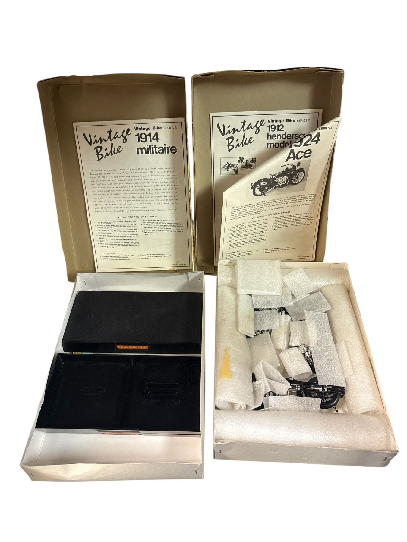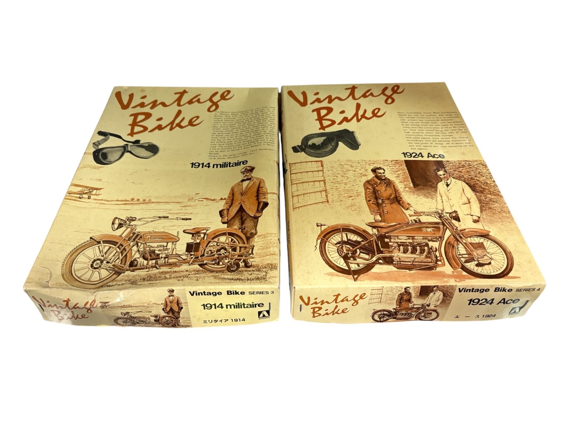 Aoshima Vintage Bike Series plastic model kits featuring the 1924 Ace and 1914 Militaire motorcycles. Both kits are in 1/16 scale, showcasing detailed design typical of early 20th-century motorcycles. Unassembled with parts requiring assembly and painting. Ideal for model enthusiasts interested in vintage motorcycles.