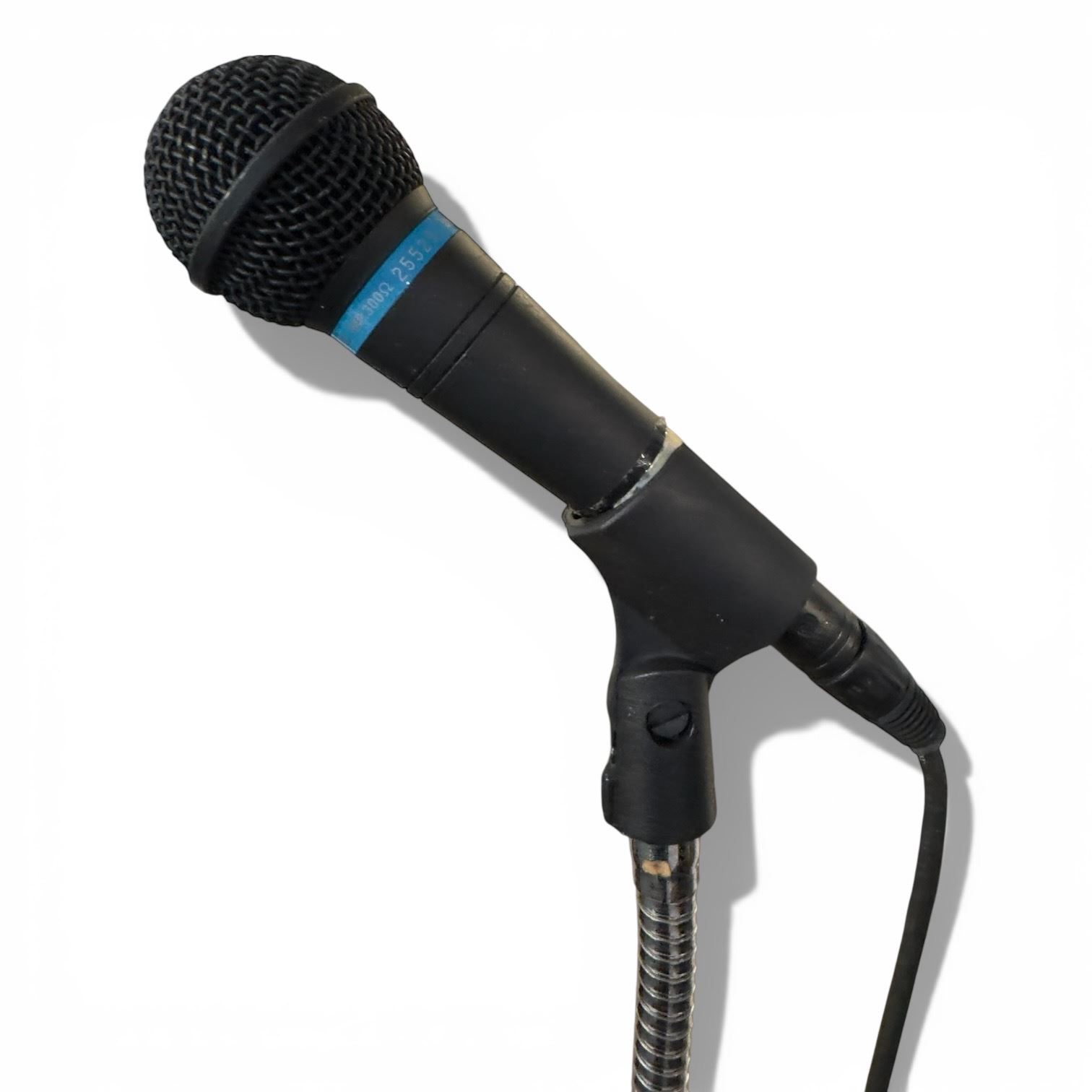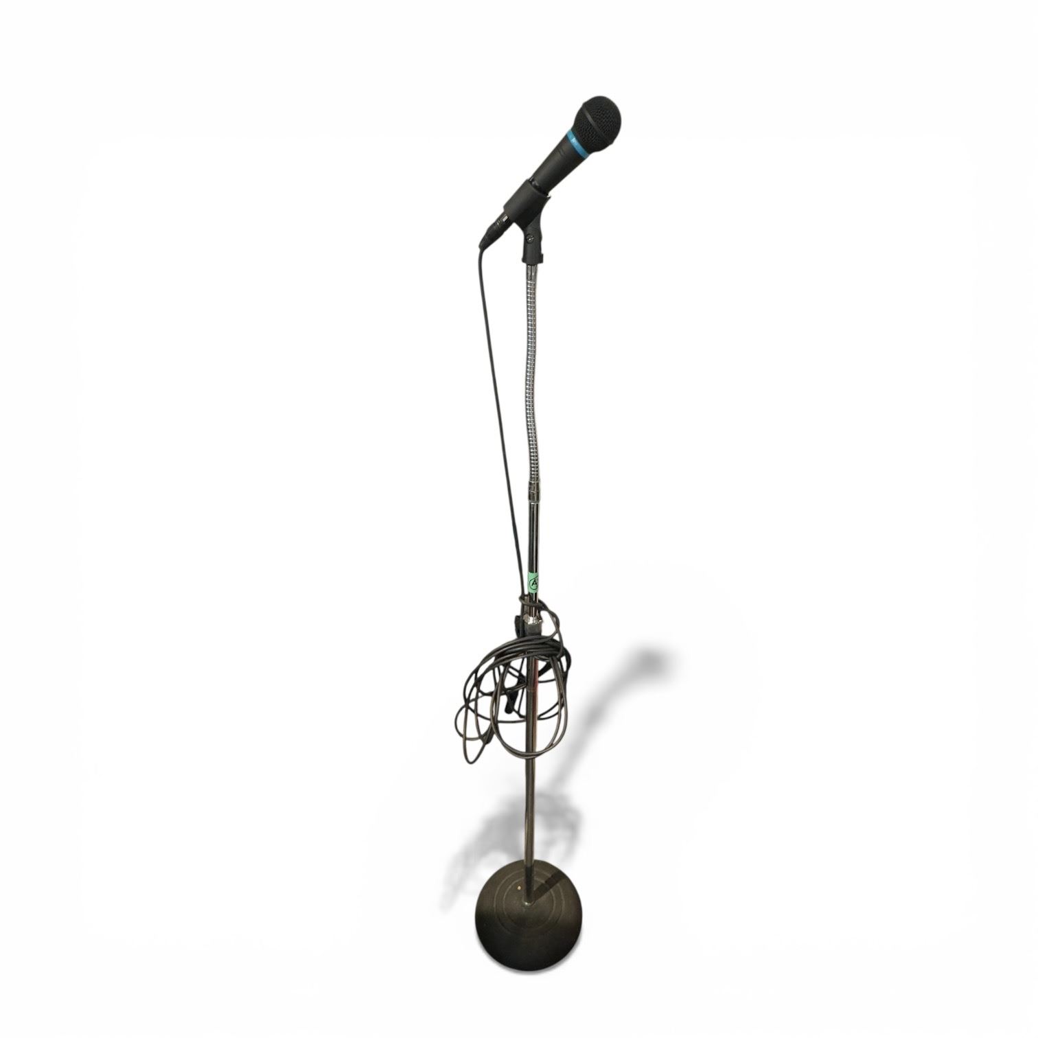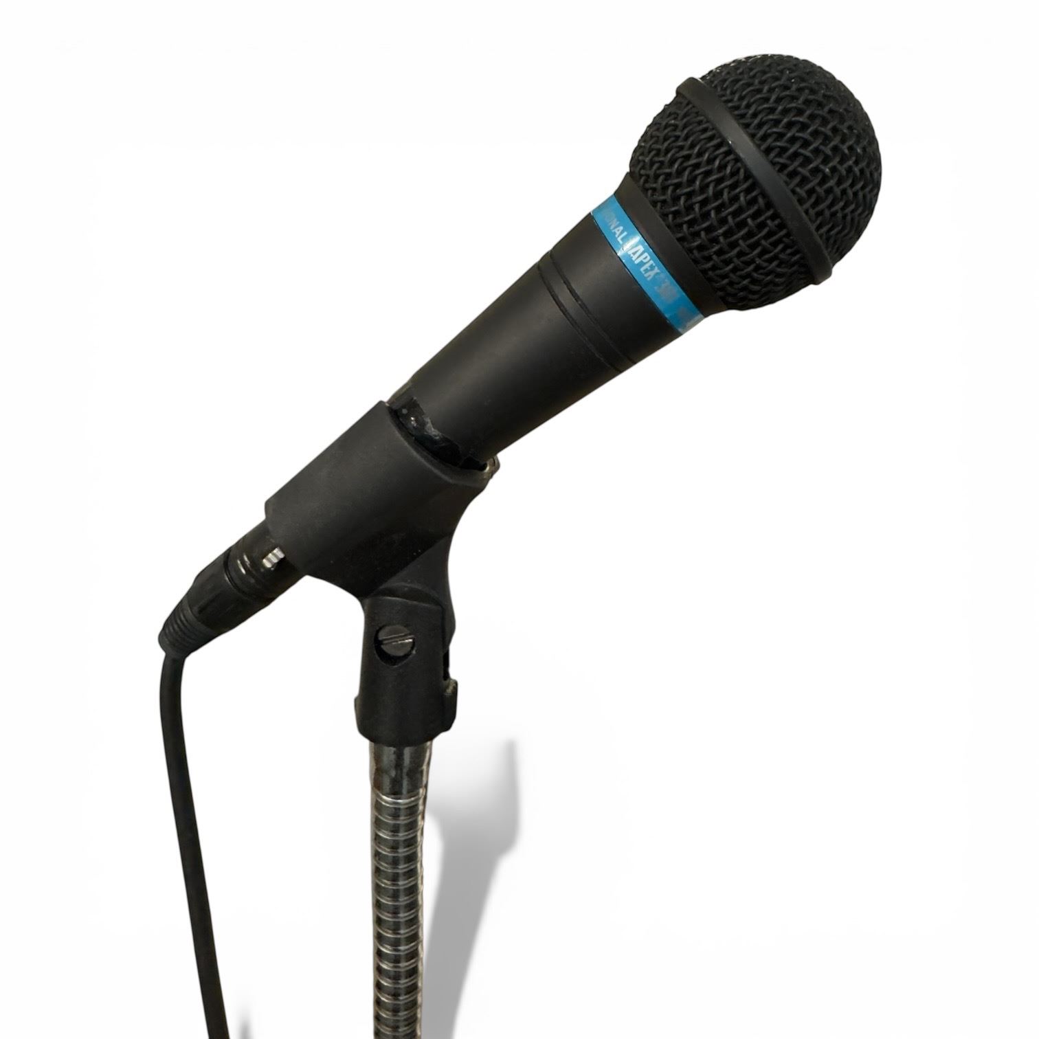 Apex 381 dynamic microphone with included adjustable stand. Suitable for vocal or instrumental use. Compact and lightweight design ideal for portable setups. Item is as pictured.