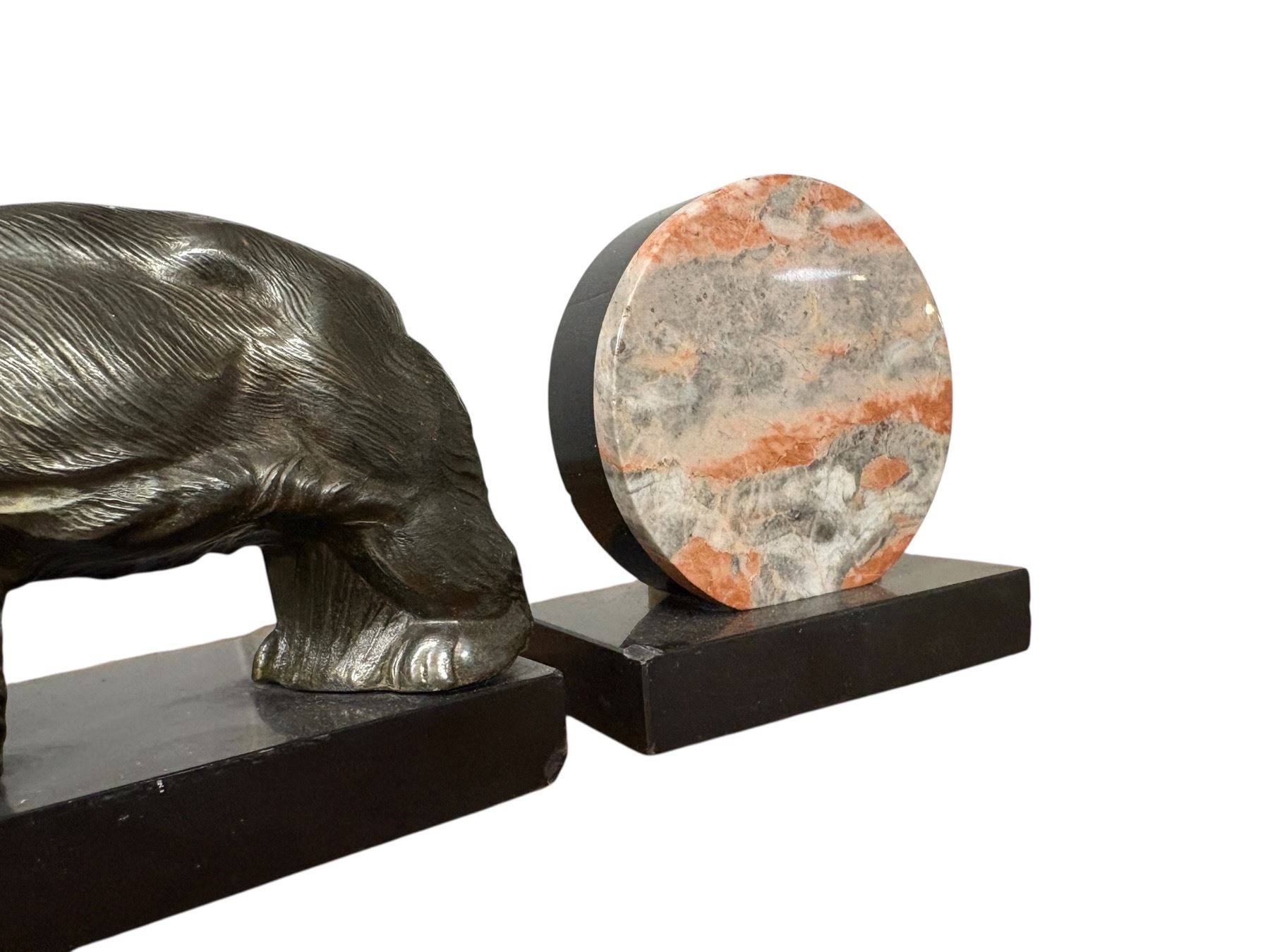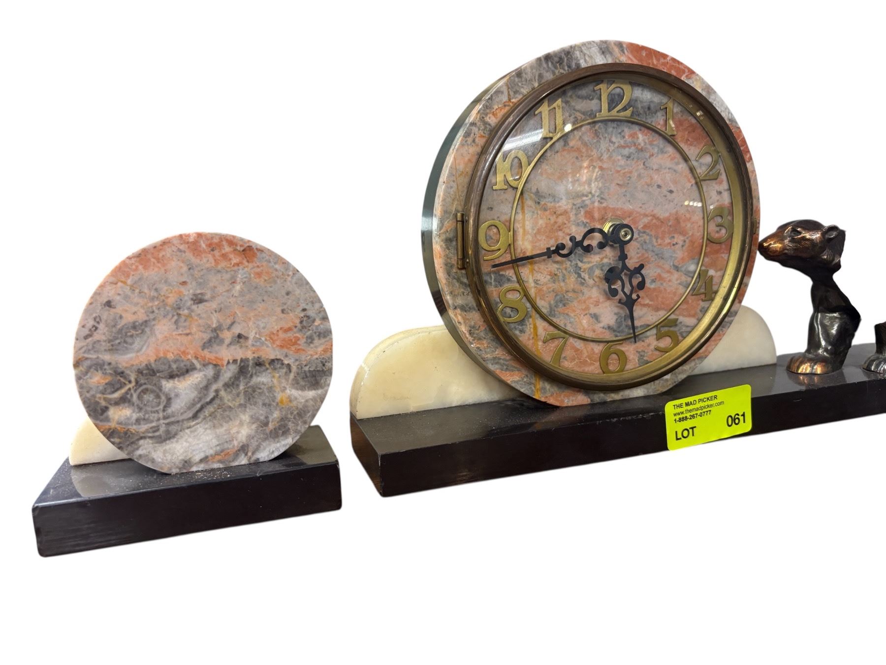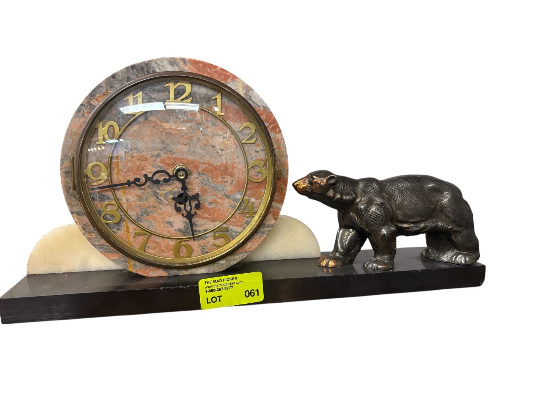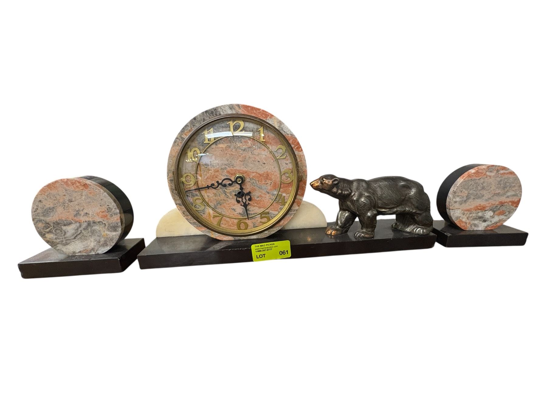 Art Deco-style mantel clock set featuring a hollow bronze polar bear atop a marble base. Includes two matching side pieces. The clock measures approximately 8 inches in height. Notable for its geometric design and elegant combination of materials typical of the Art Deco period.