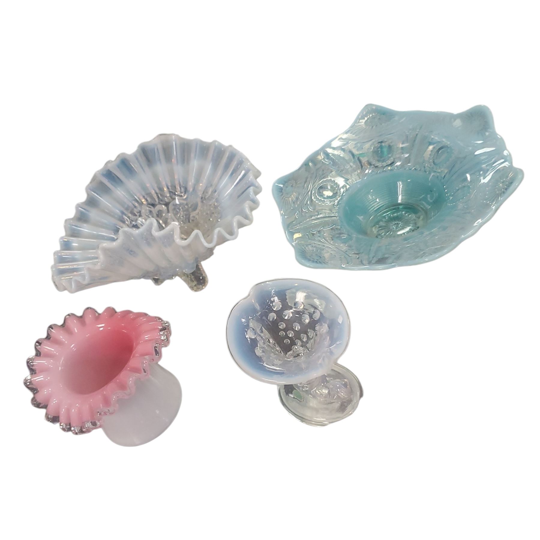 This collection includes a Fenton opalescent ruffed edge bowl, a Fenton Peach Crest case glass piece, a hobnail cornucopia vase, and a Northwood 'Spokes and Wheels' pattern bowl from circa 1905 measuring 8-Inch in diameter. All items showcase classic art glass techniques and designs. Items are as pictured.