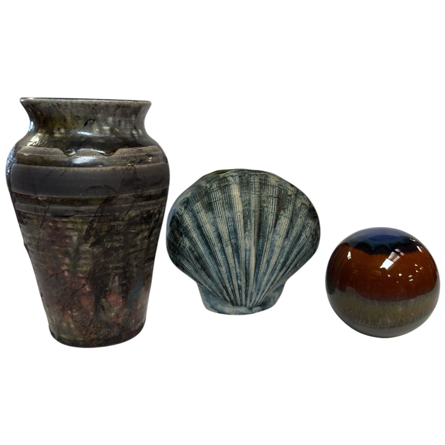 Art Pottery 7" Vase, Carn Pottery Shell and Orb Paperweight
