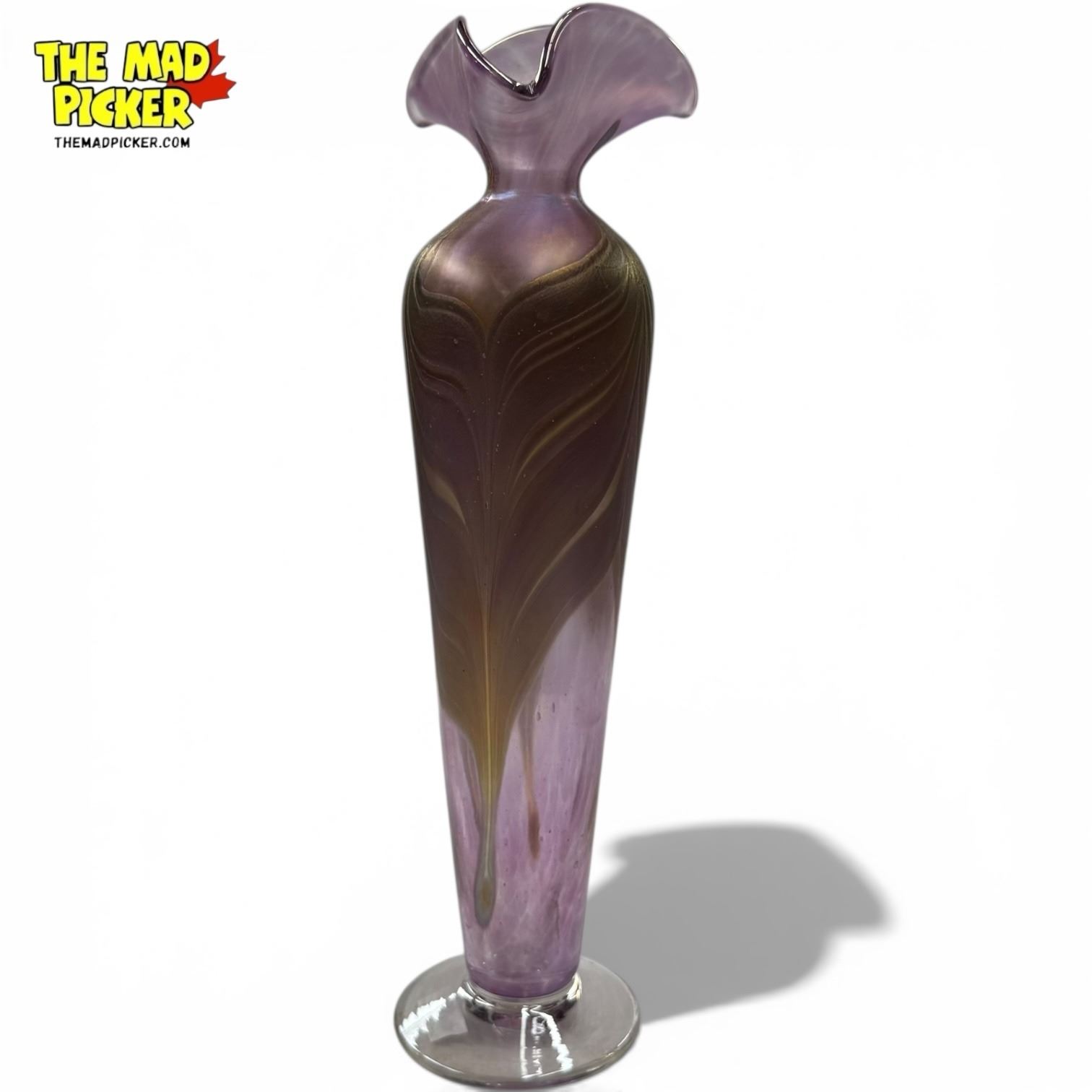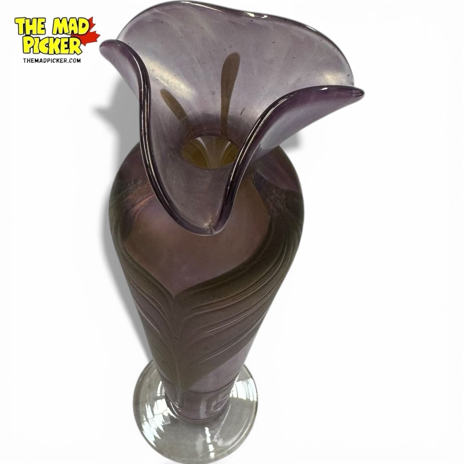 Art Vargas Canadian Hand Blown Lavendar Art Glass Vase with Pulled Feather Design - 11" tall x 3.5" diameter