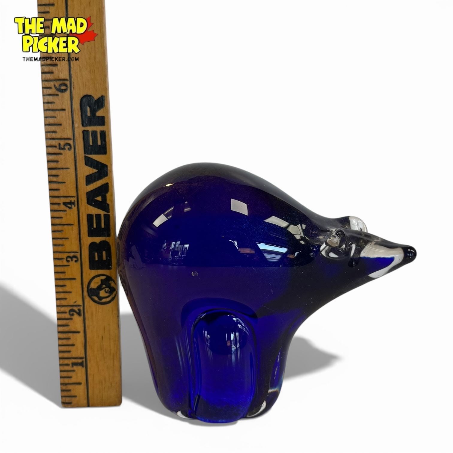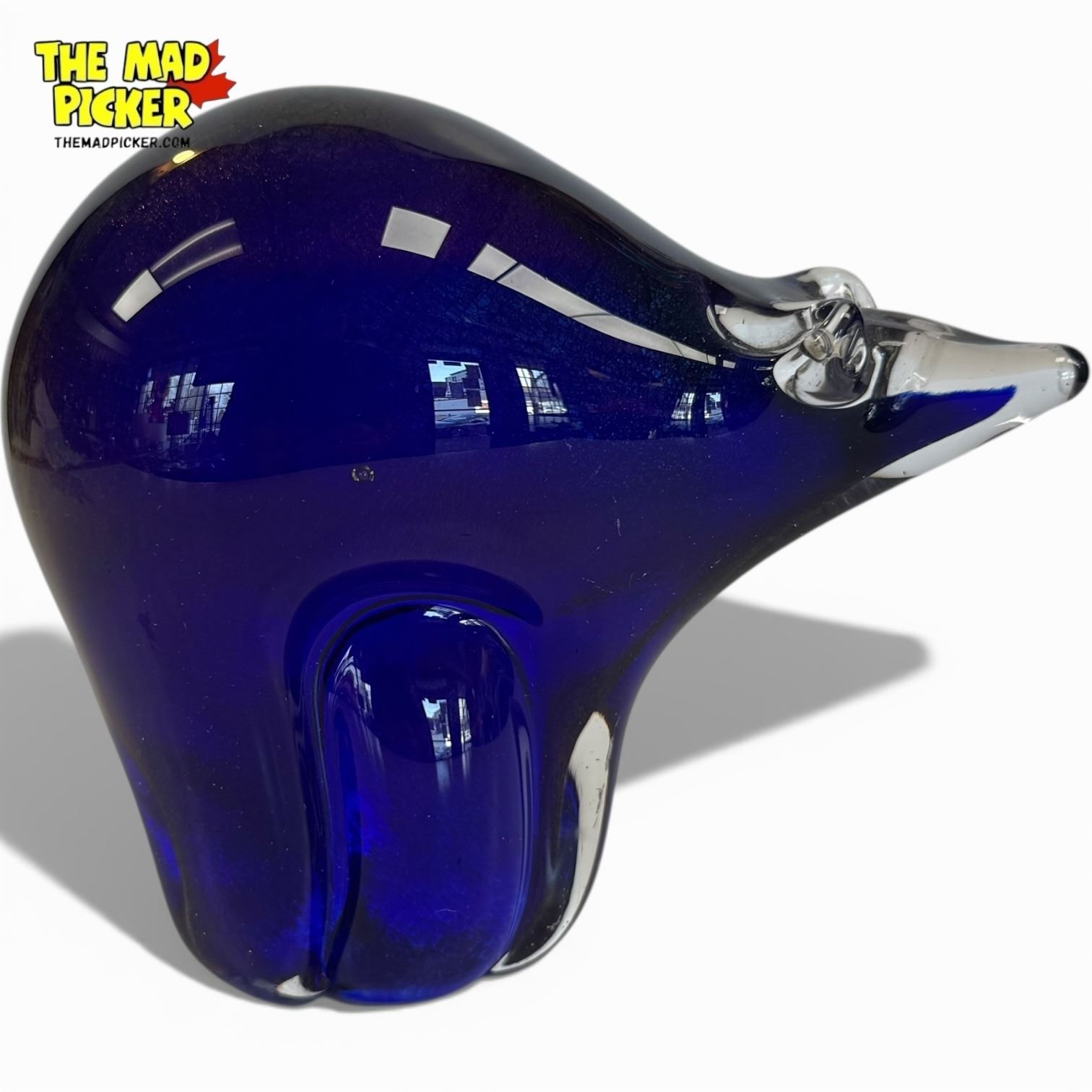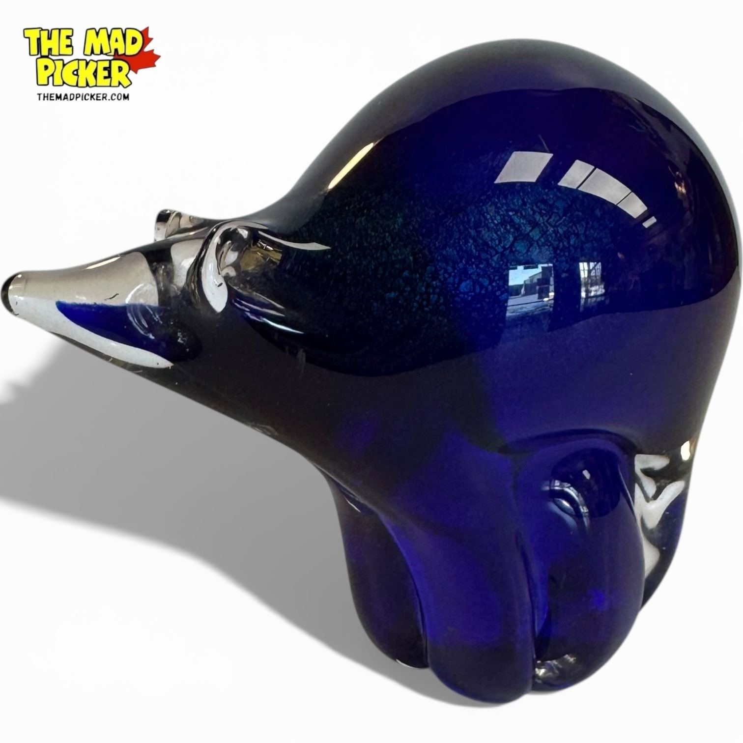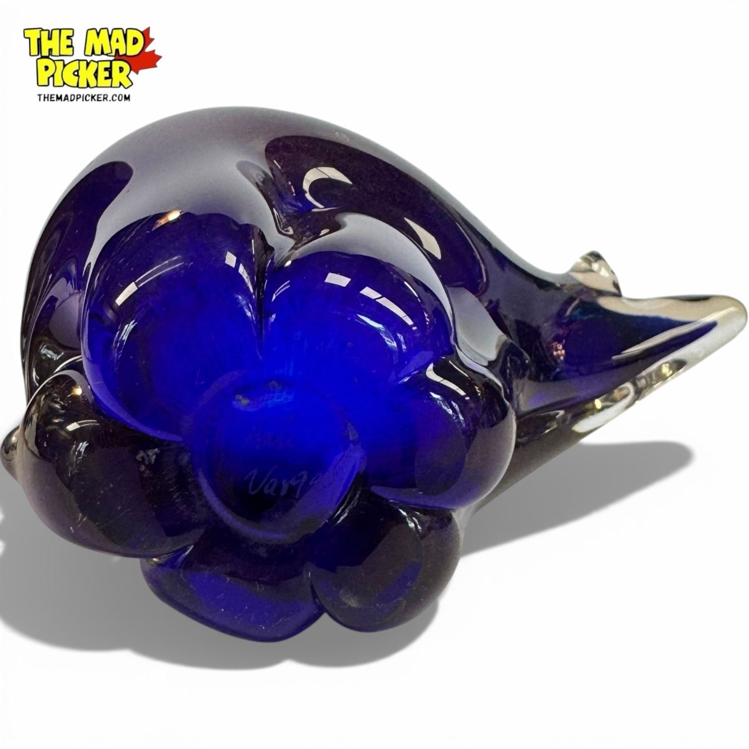 Arte Vargas blue glass bear sculpture designed by Daniel Vargas. Handcrafted in Canada, this piece highlights the vibrant blue art glass uniquely associated with Arte Vargas. Daniel Vargas is known for his traditional glassblowing techniques and exceptional craftsmanship, active since the 1970s.