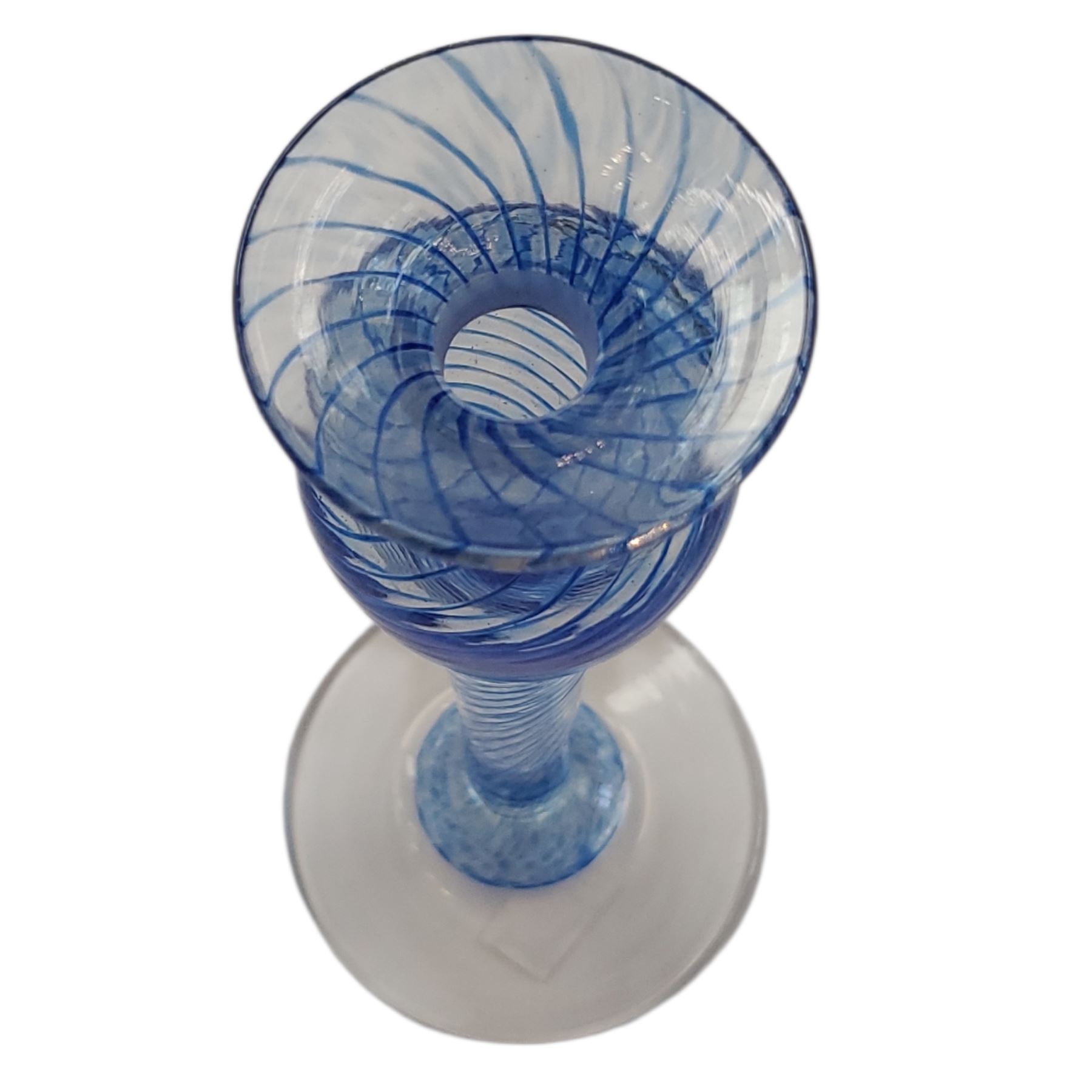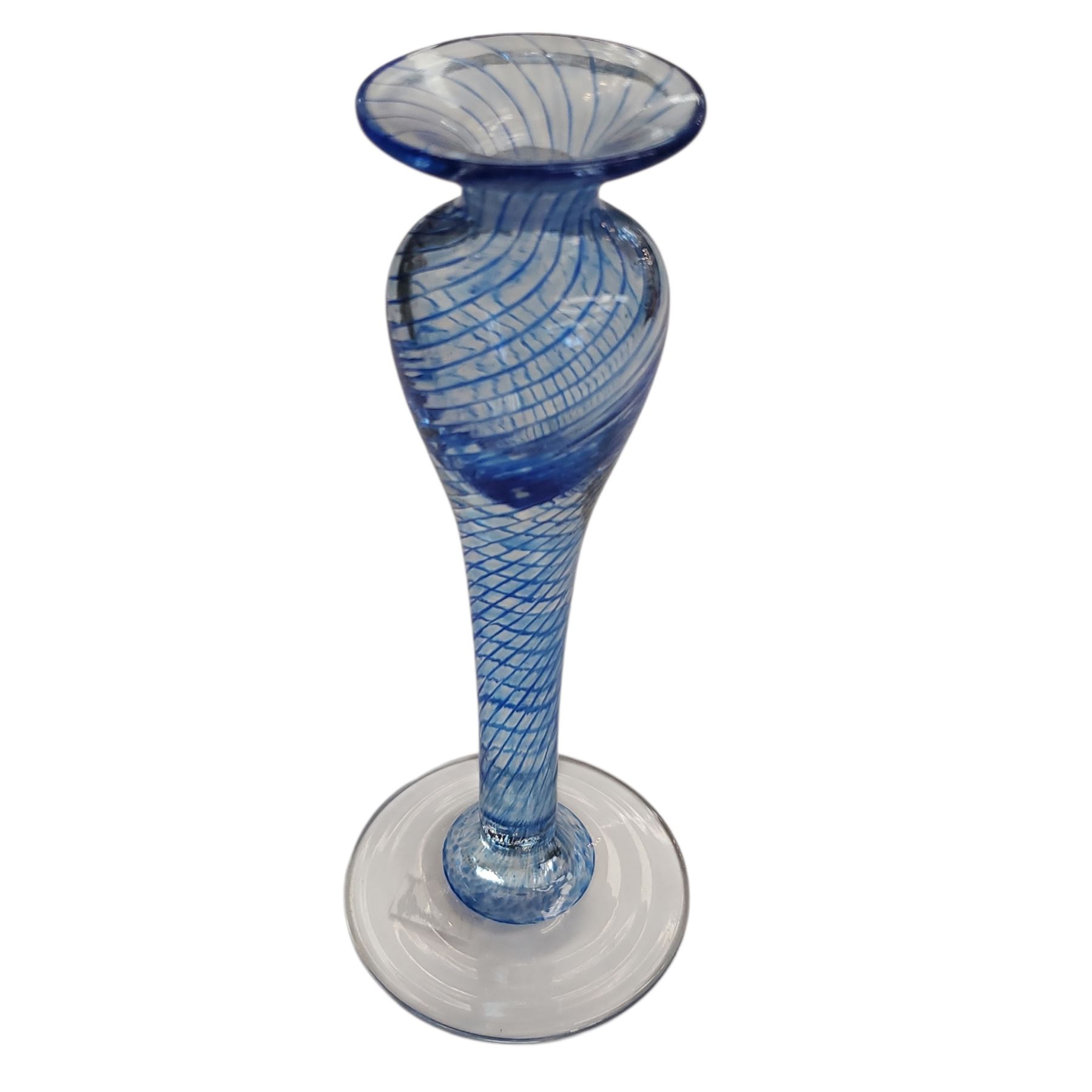 Arte Vargas candlestick holder featuring a blue swirl design. Handmade art glass piece signed by the artisan, attributed to the 1990s. Approximately 7 inches tall, showcasing the skillful craftsmanship of Arte Vargas, a Canadian glass studio known for unique designs and quality.