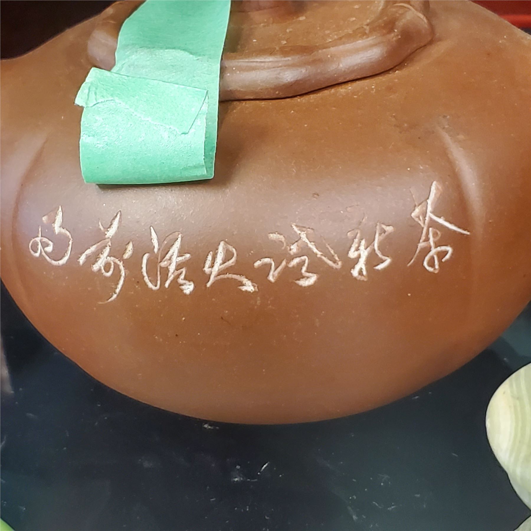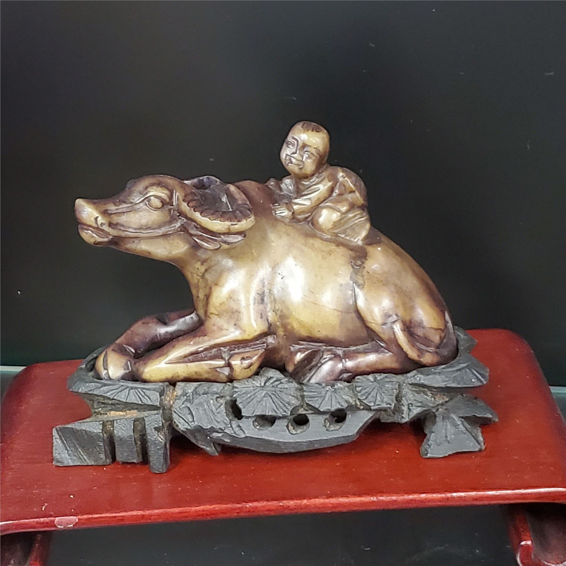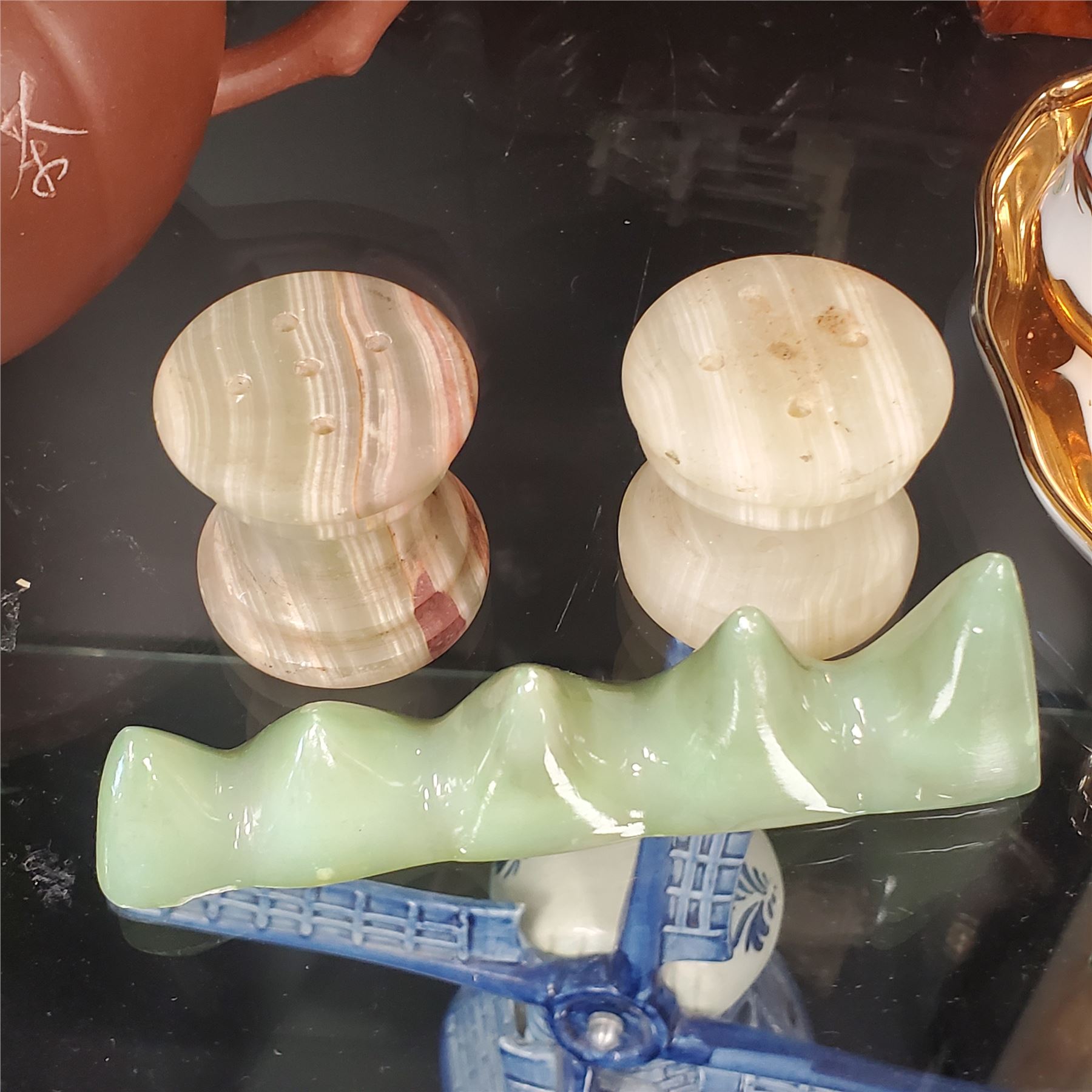 Lot of Asian decorative collectables including a teapot, water buffalo figurine, mortar & pestle, jade items, and additional pieces. Includes various materials and designs. Items are as pictured.