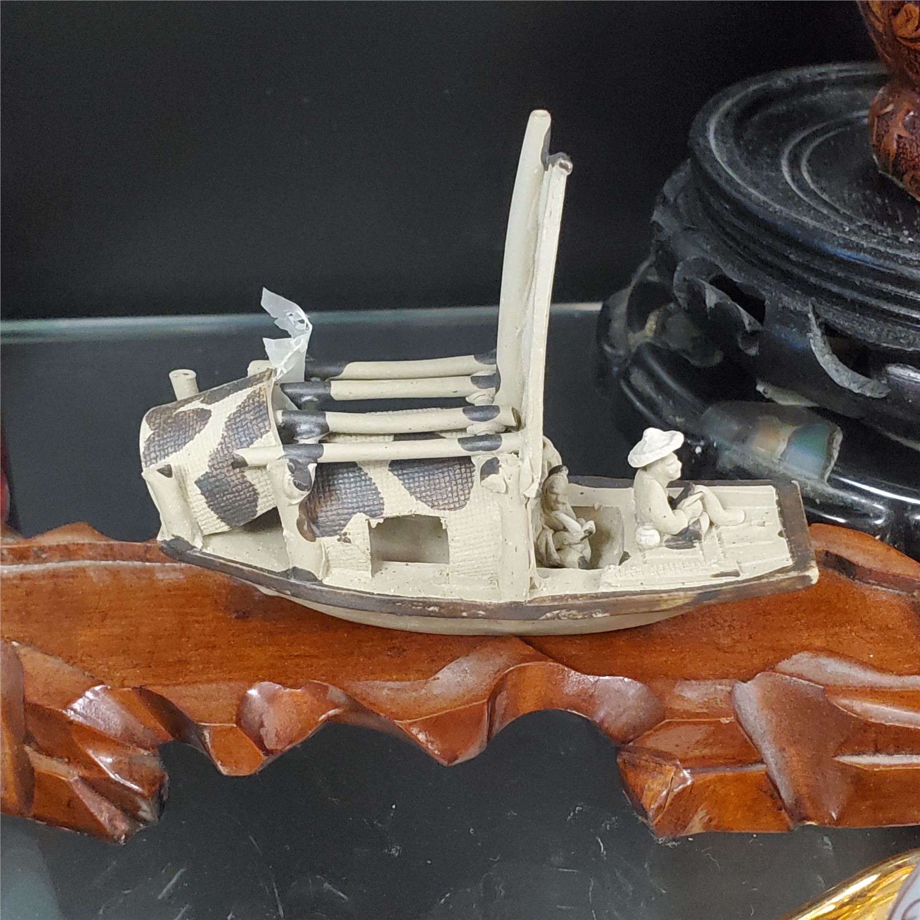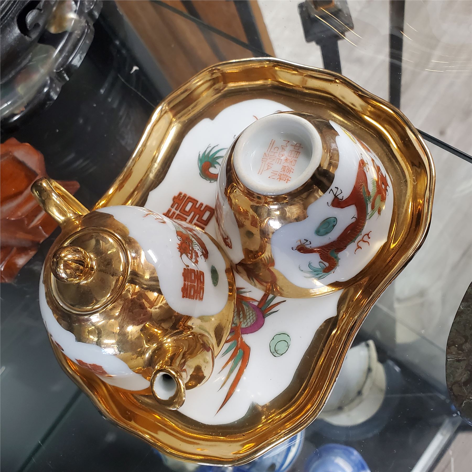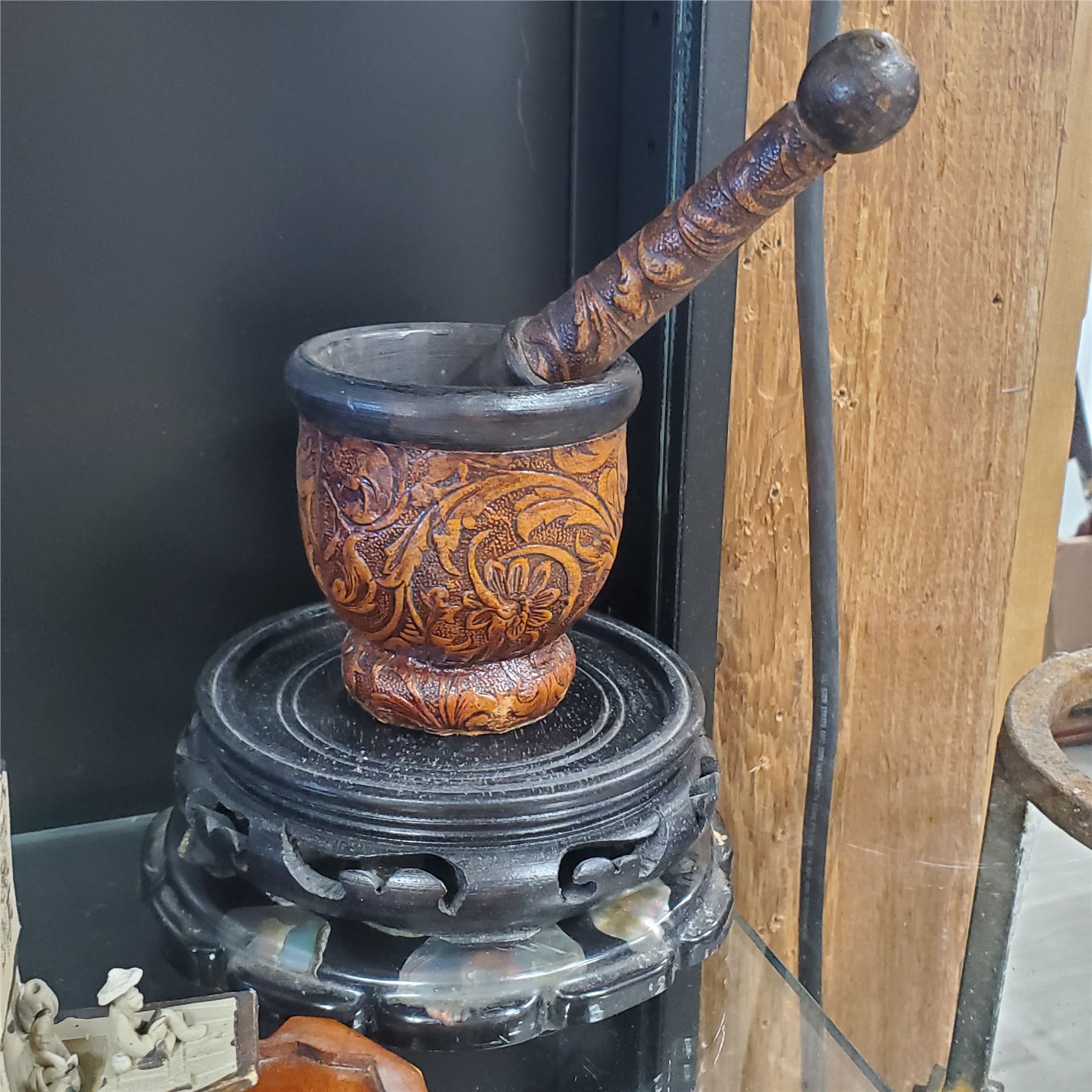Lot of Asian decorative collectables including a teapot, water buffalo figurine, mortar & pestle, jade items, and additional pieces. Includes various materials and designs. Items are as pictured.