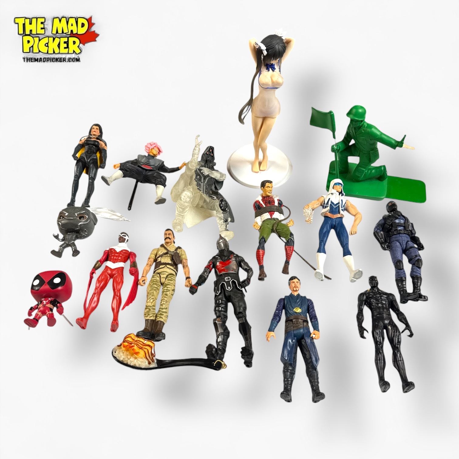 Collection of action figures featuring Marvel and DC Comics characters, including Dead Pool, Black Panther.