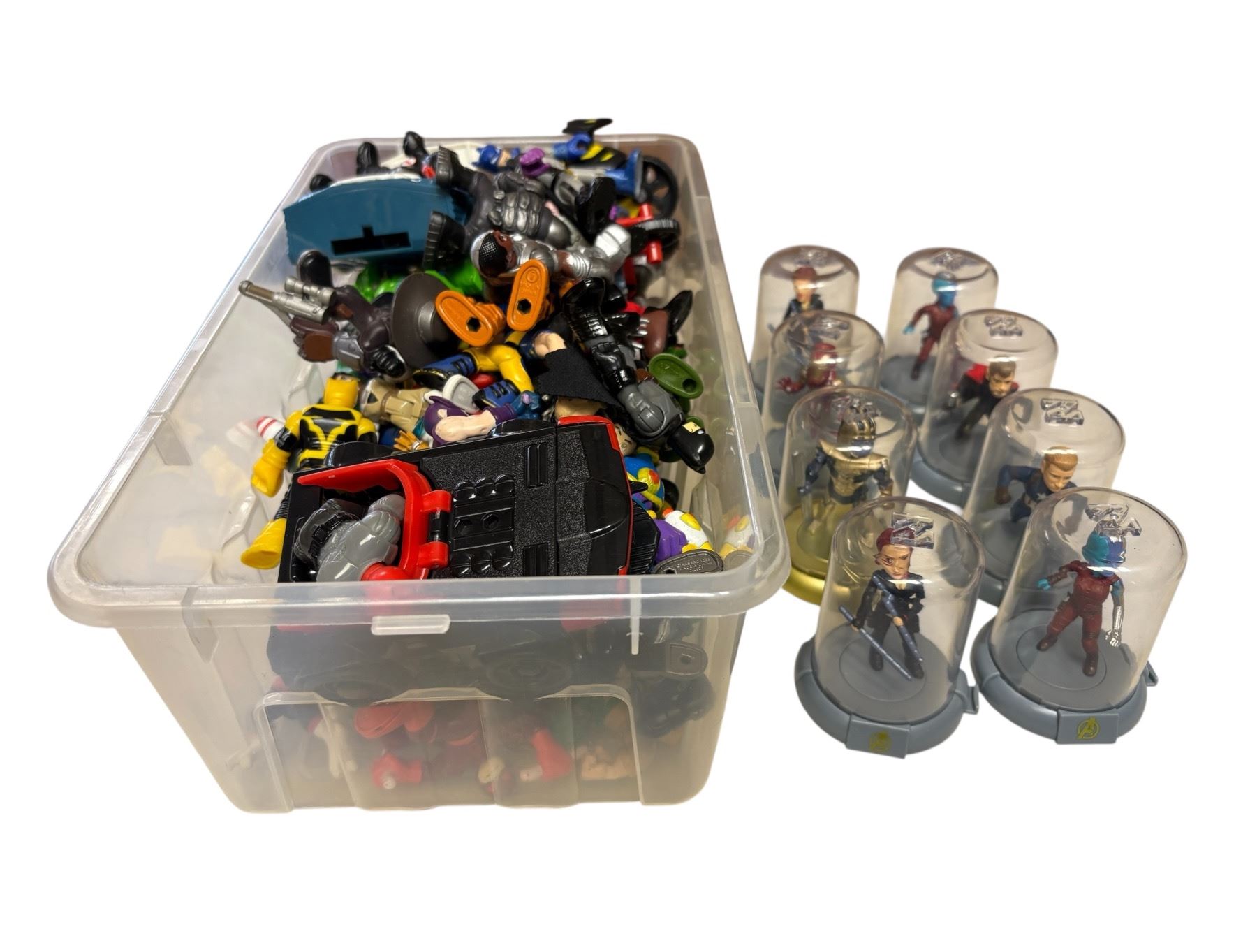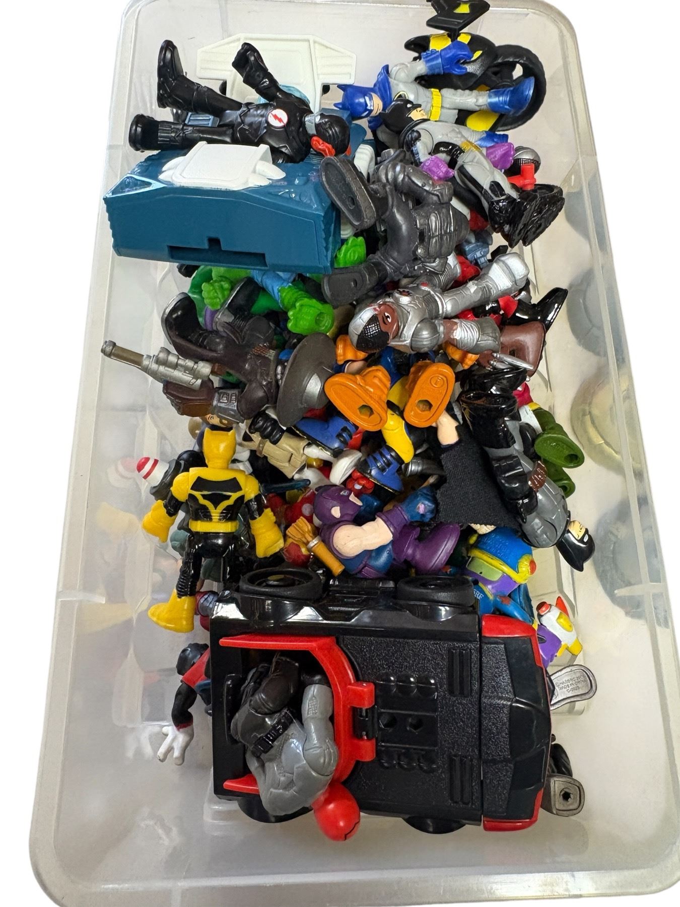 Collection of assorted action figures featuring characters from DC, Marvel, and other franchises. Includes various sizes, brands, and materials. Likely spans multiple eras, with figures representing superheroes, villains, and supporting characters. Exact mix and completeness unspecified.