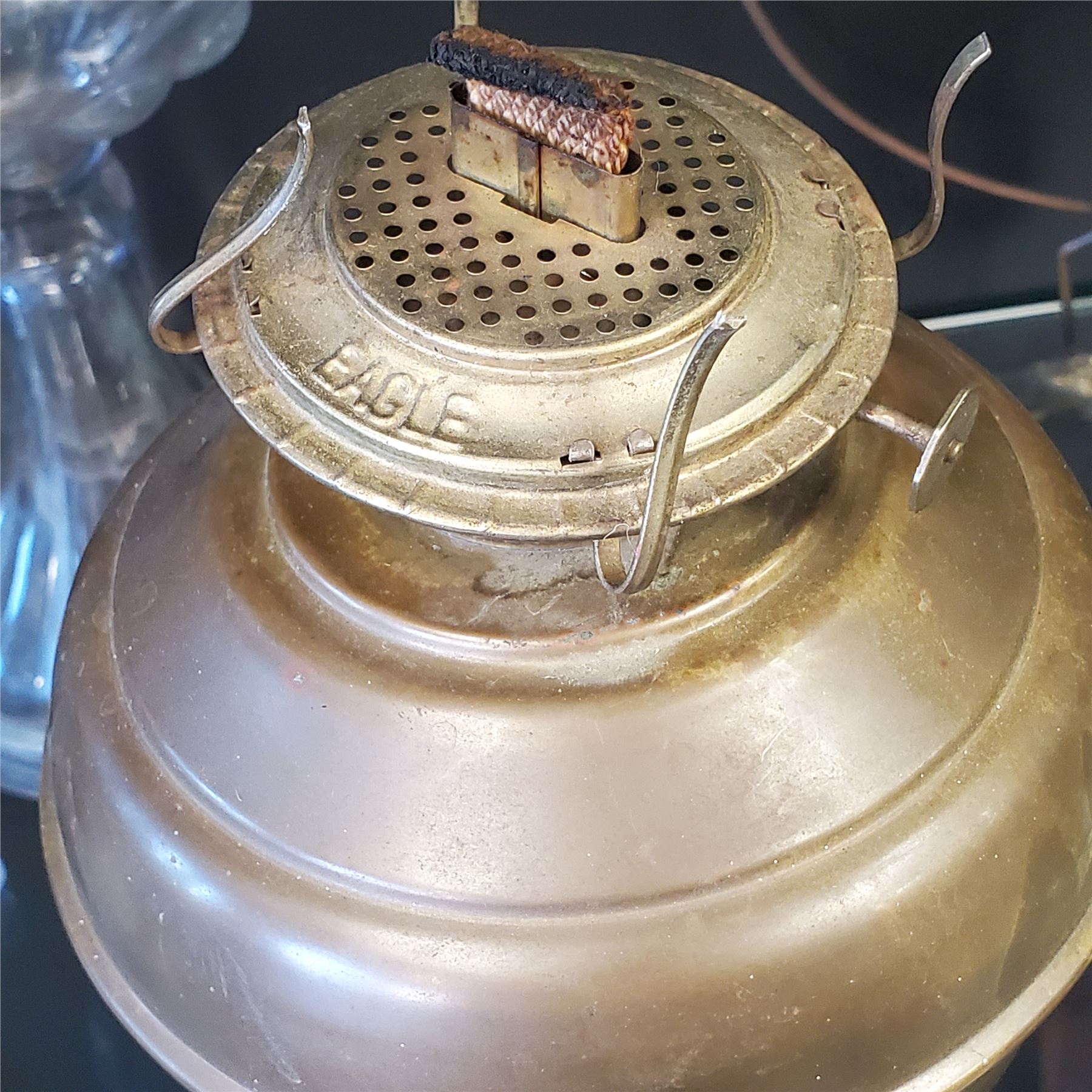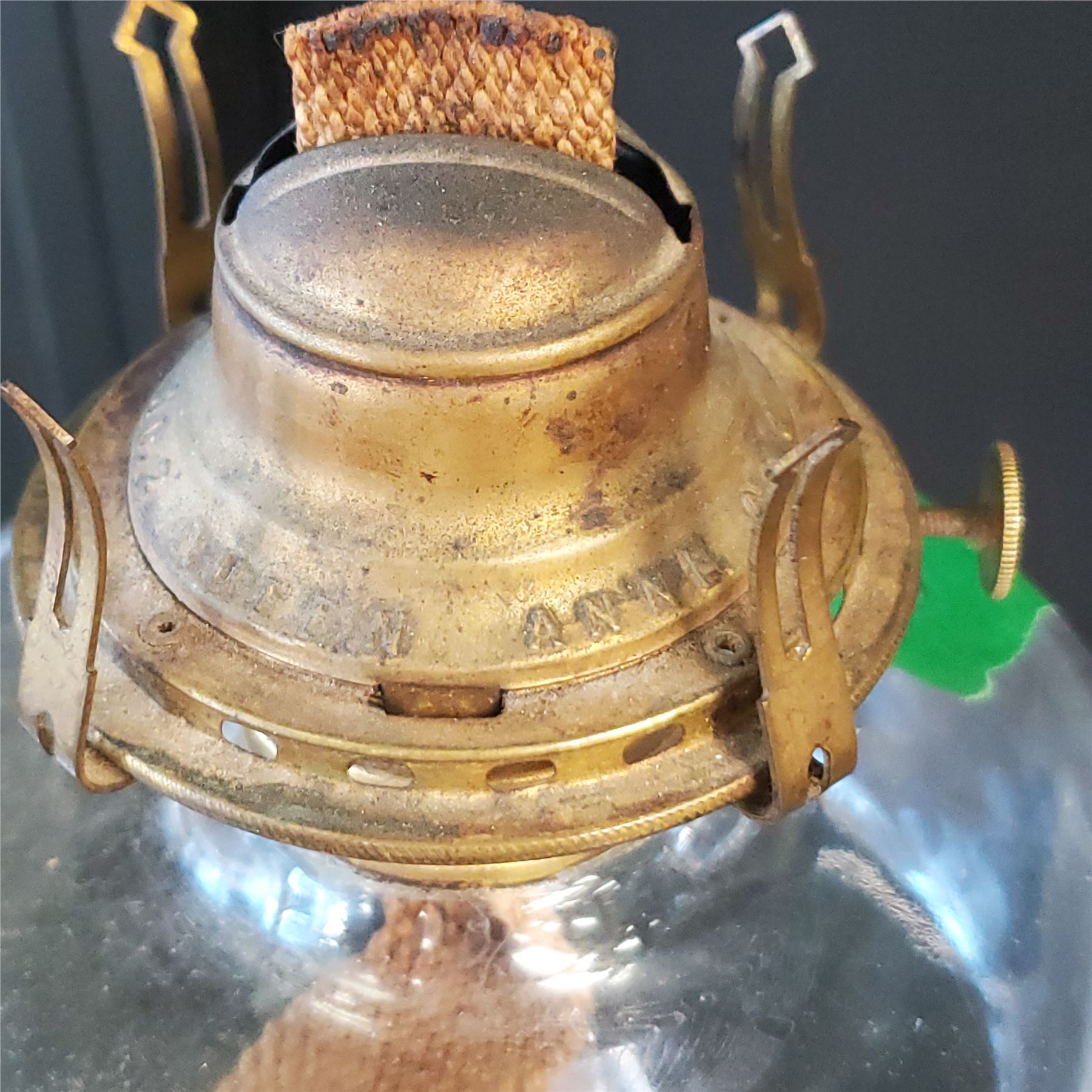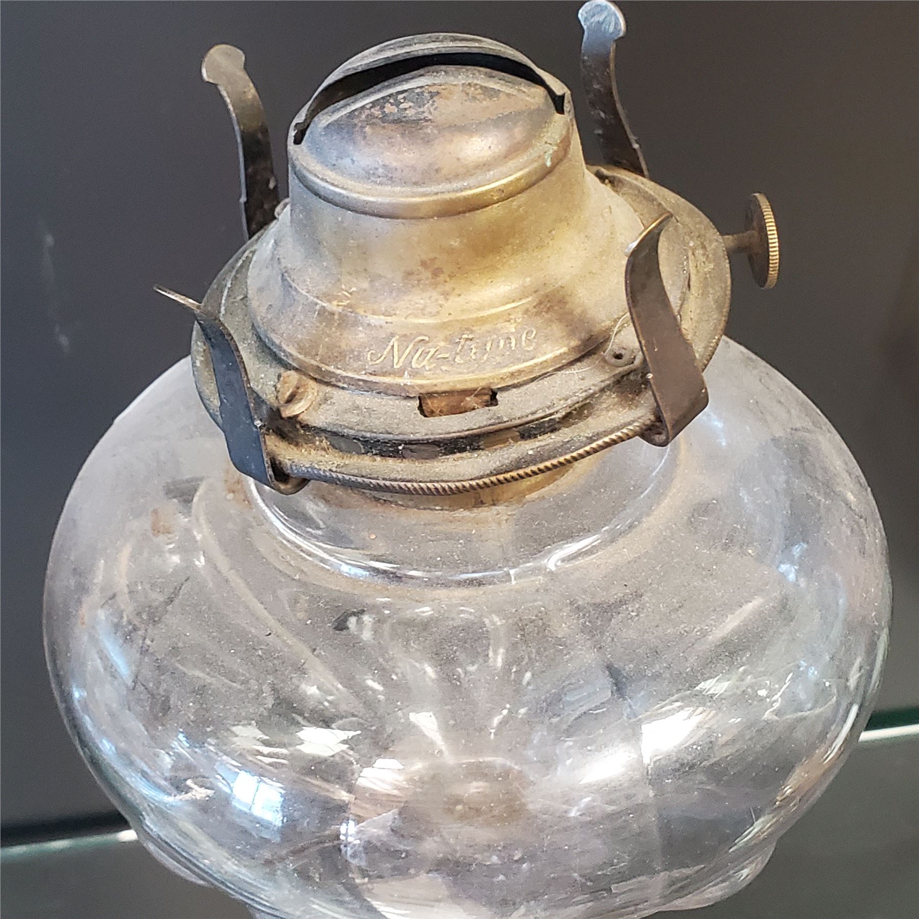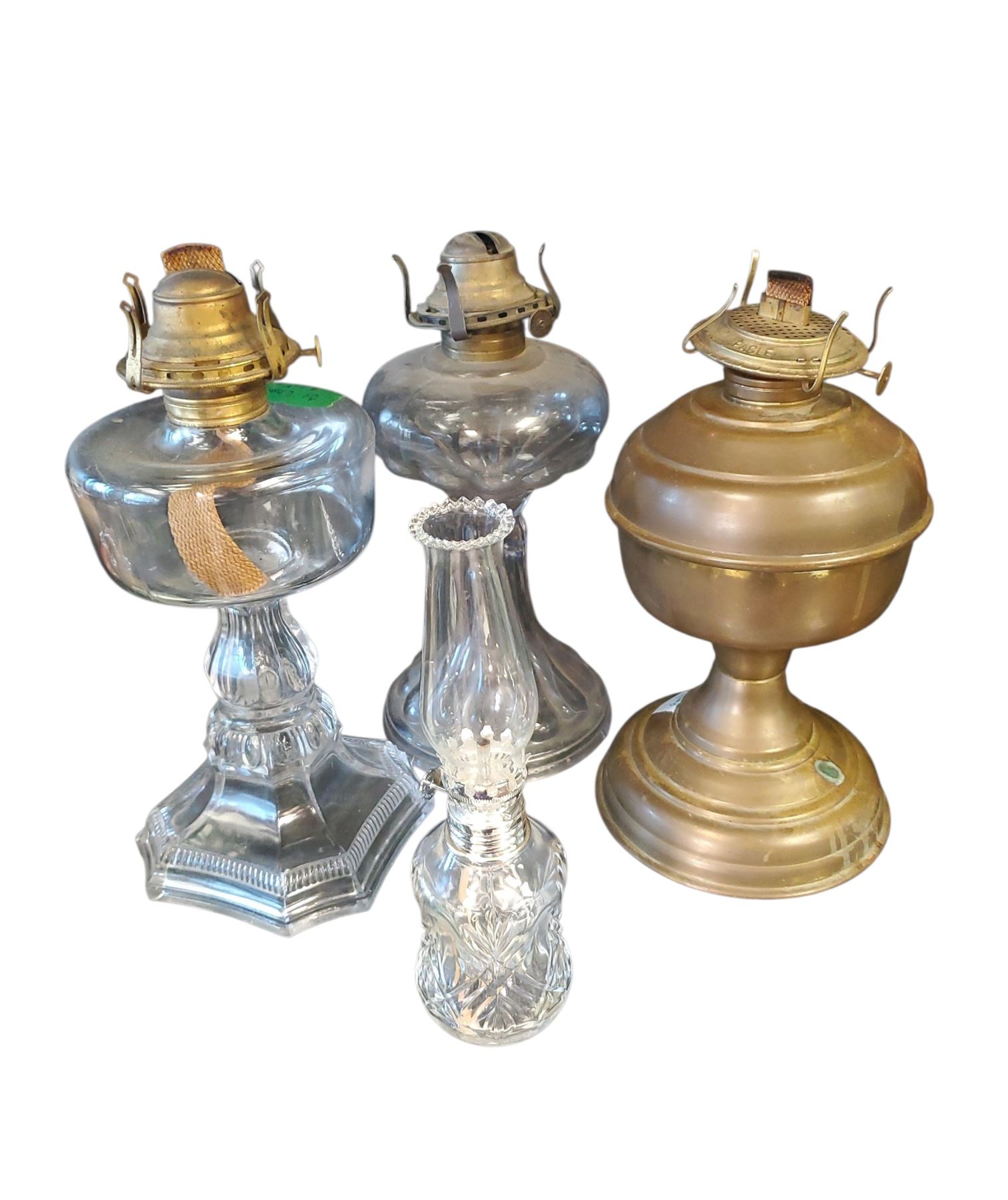 Collection of assorted antique oil lanterns featuring metal bases and glass reservoirs. All lanterns are missing their flutes. Likely from late 19th to early 20th century. Designs vary in shape and detailing. Item is as pictured.