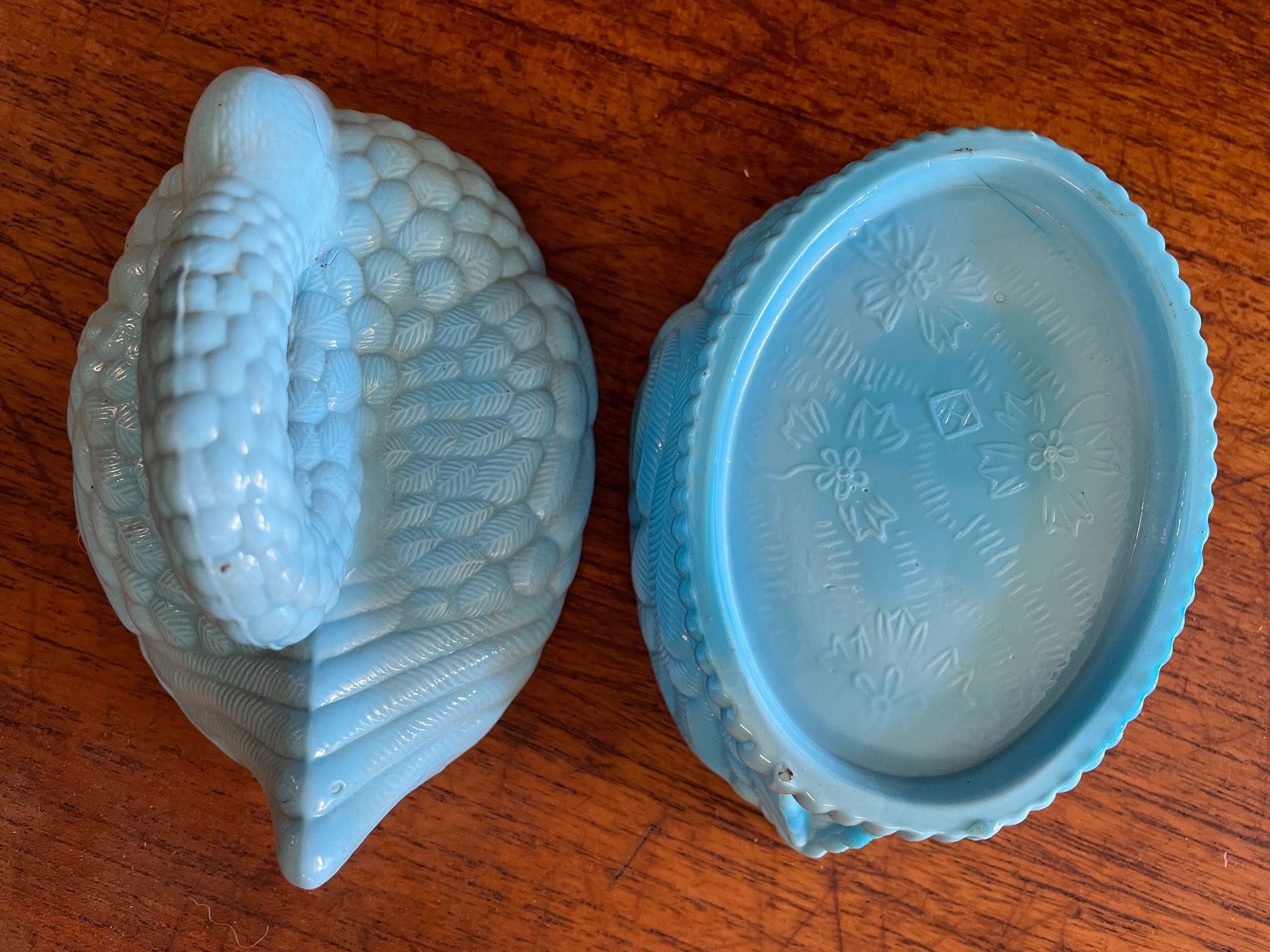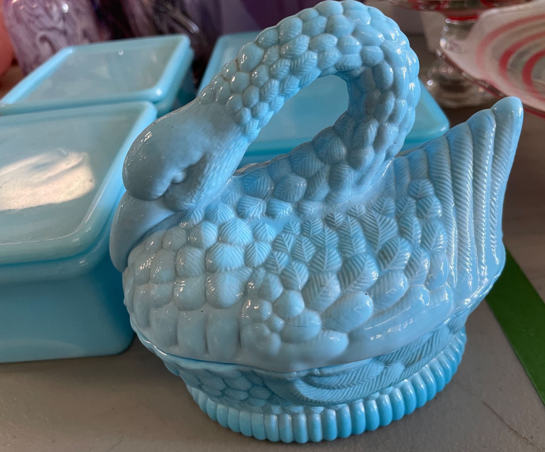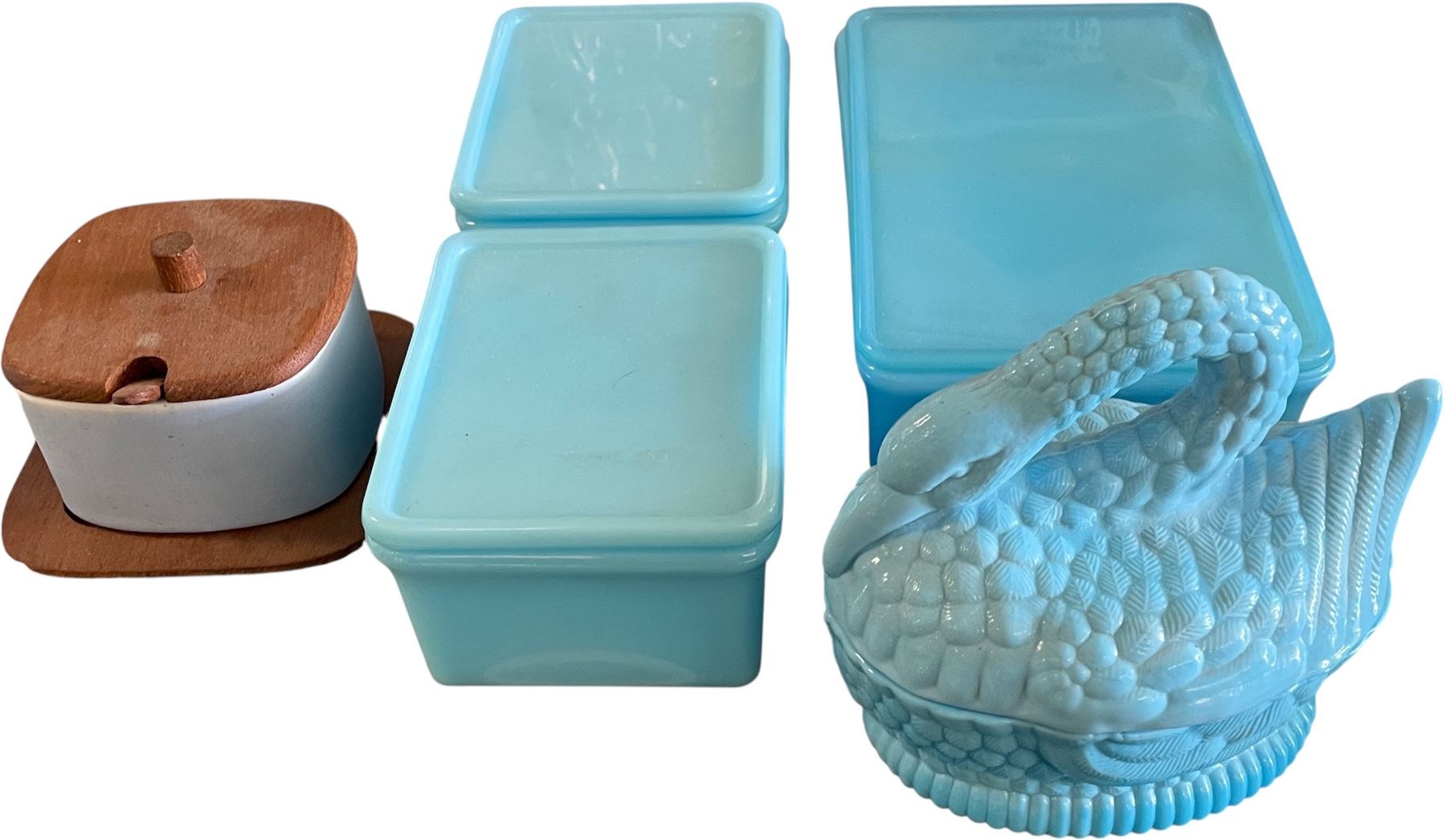 Assorted Blue Milk Glass Containers & Covered Swan Dish with Wood Lid Box