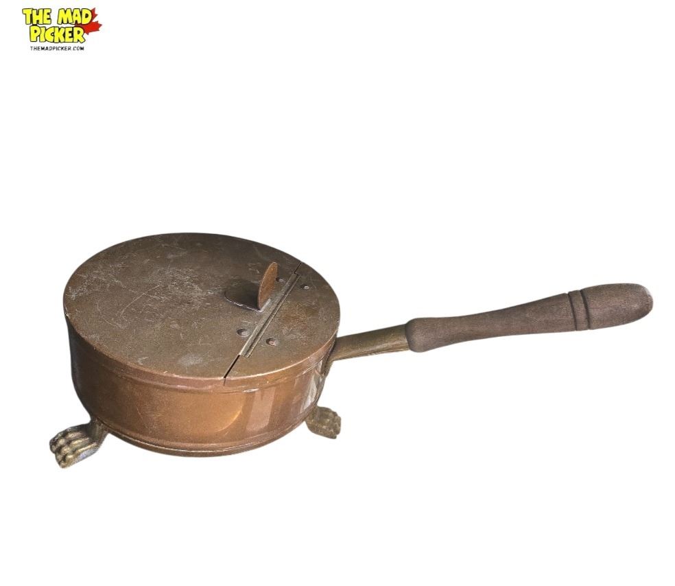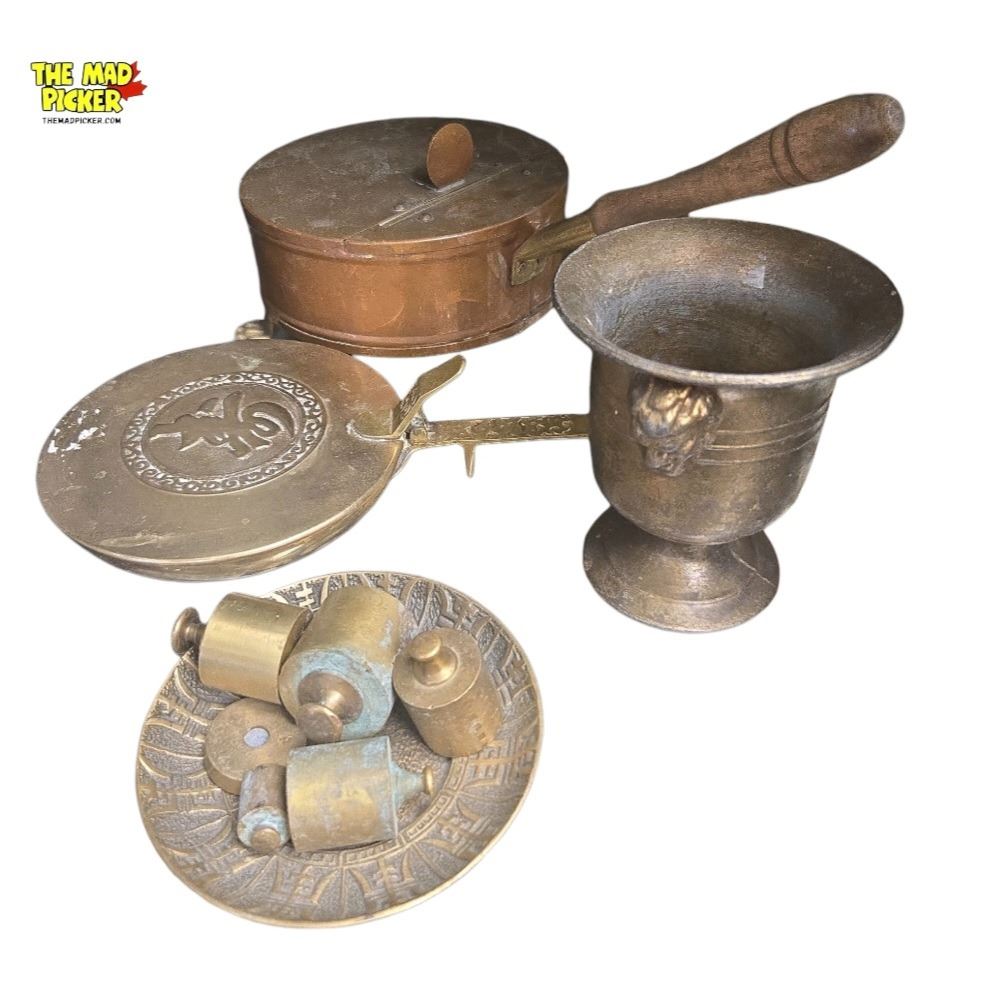 Collection includes assorted brass and copper items: brass weights, a brass cup, a silent butler, and a crumb catcher. The pieces display functional designs with vintage appeal. Exact origins or makers are unspecified. Suitable for display or period decor settings.