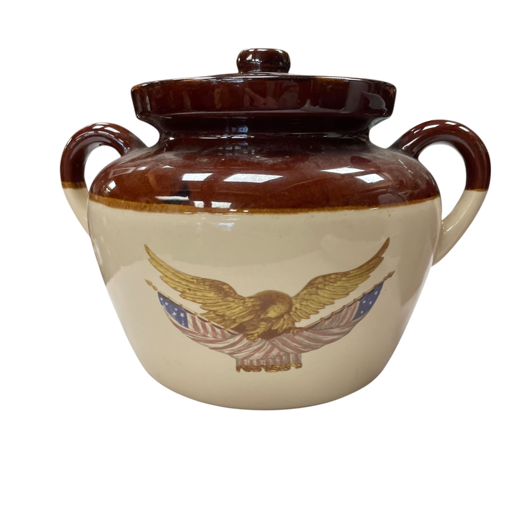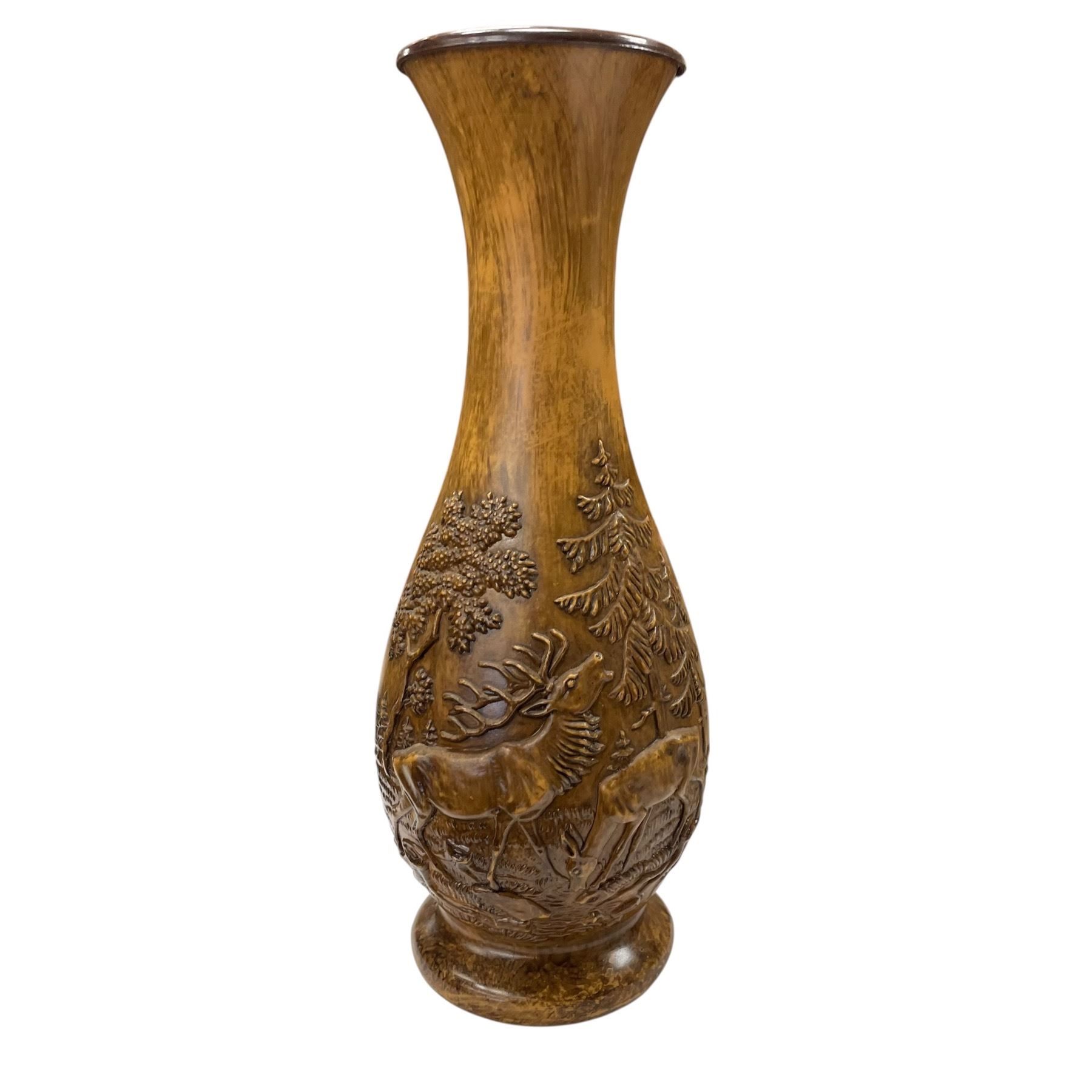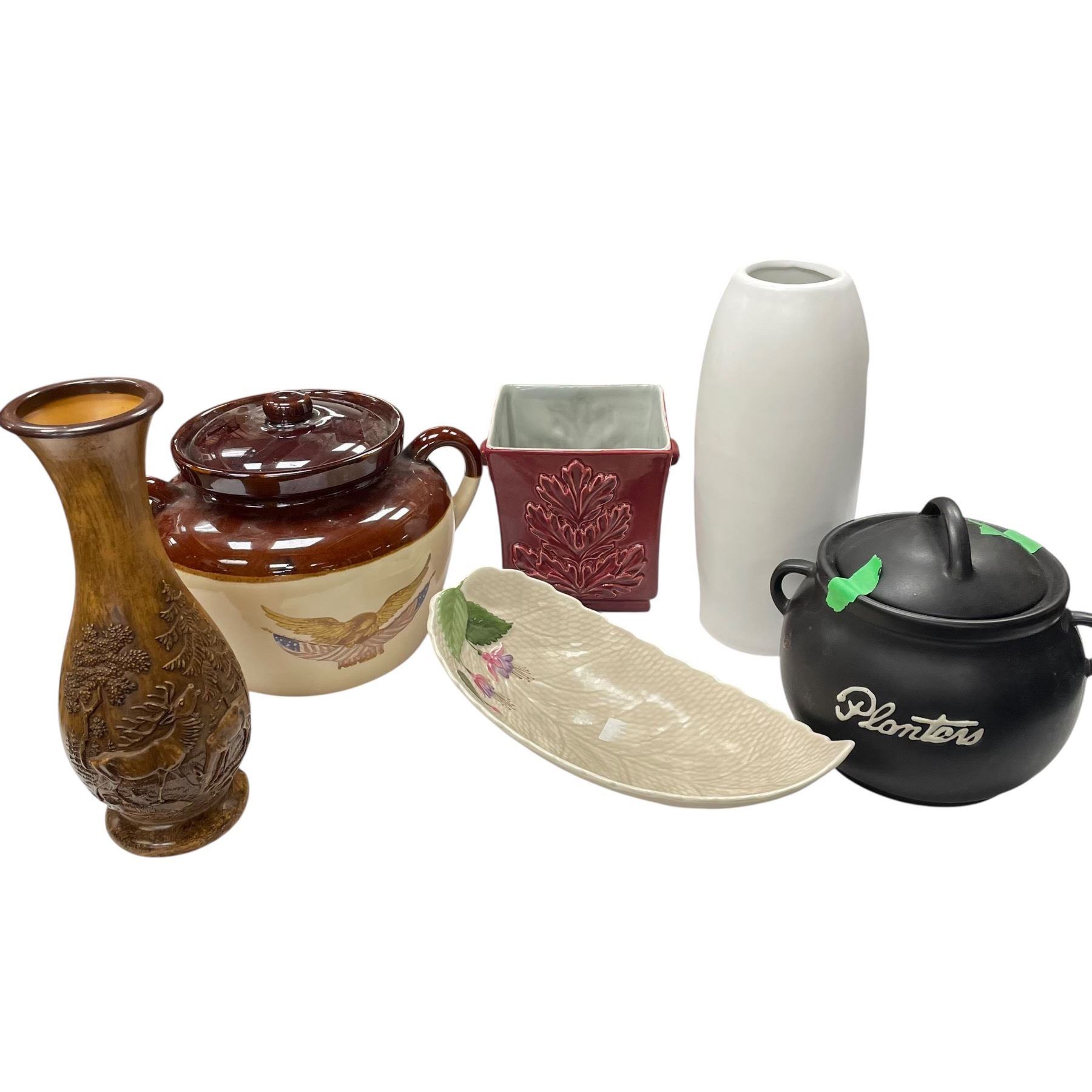 Assorted collectable lot including a bean pot, elk themed composite vase, Crown Devon piece, Planters Peanuts jar, Red Wing planter and a Kimisty vase. The tallest item in the collection measures 9.5-Inch. Item is as pictured.