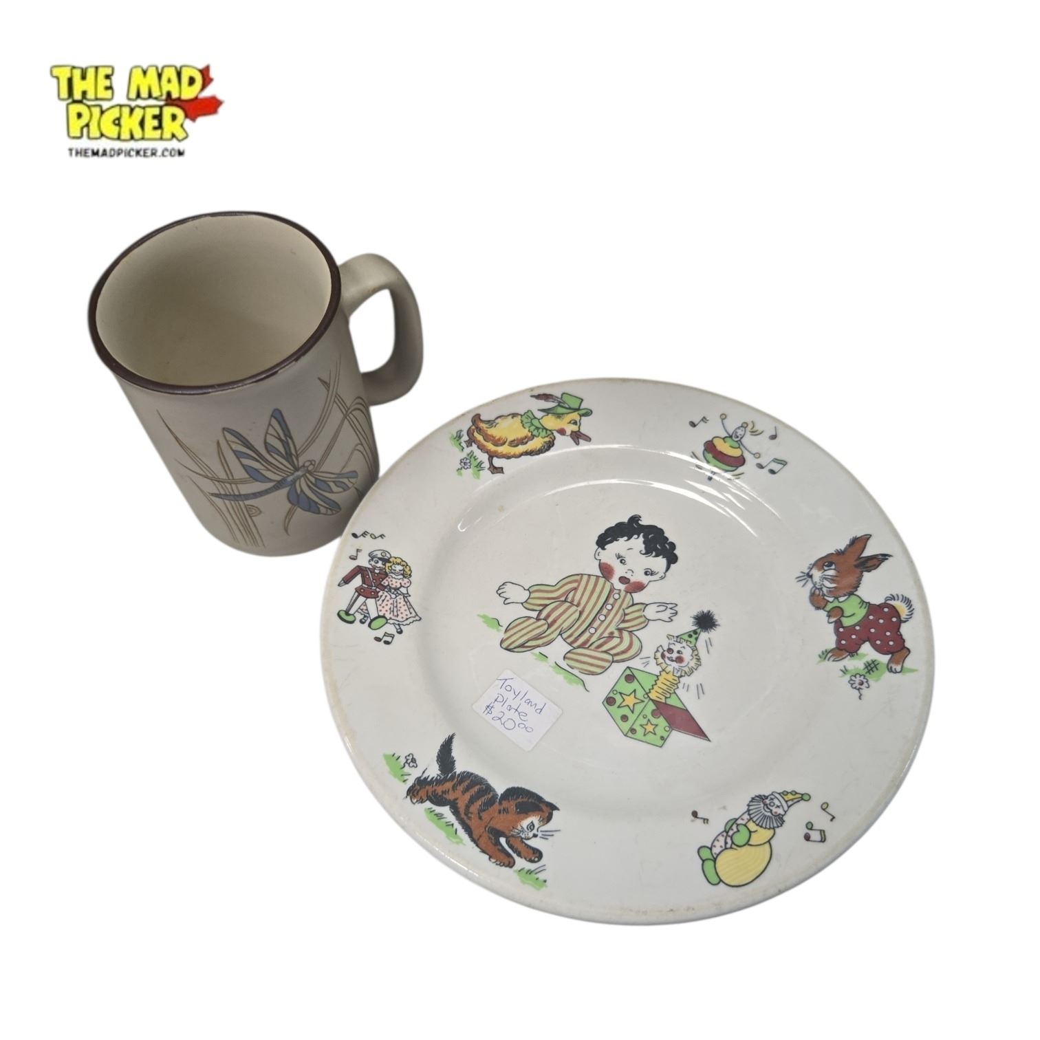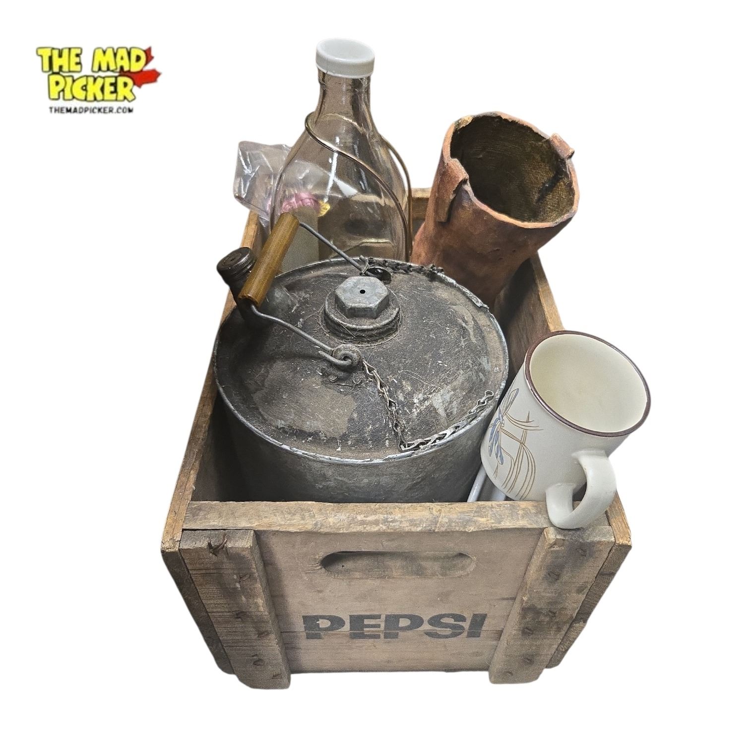 This assorted lot includes a collectibles plate, mug, and art, all housed in a vintage Pepsi-branded wooden crate. The crate features iconic Pepsi logo markings, reflecting mid-20th-century design. Exact details on included items are unspecified; crate shows wear consistent with age.