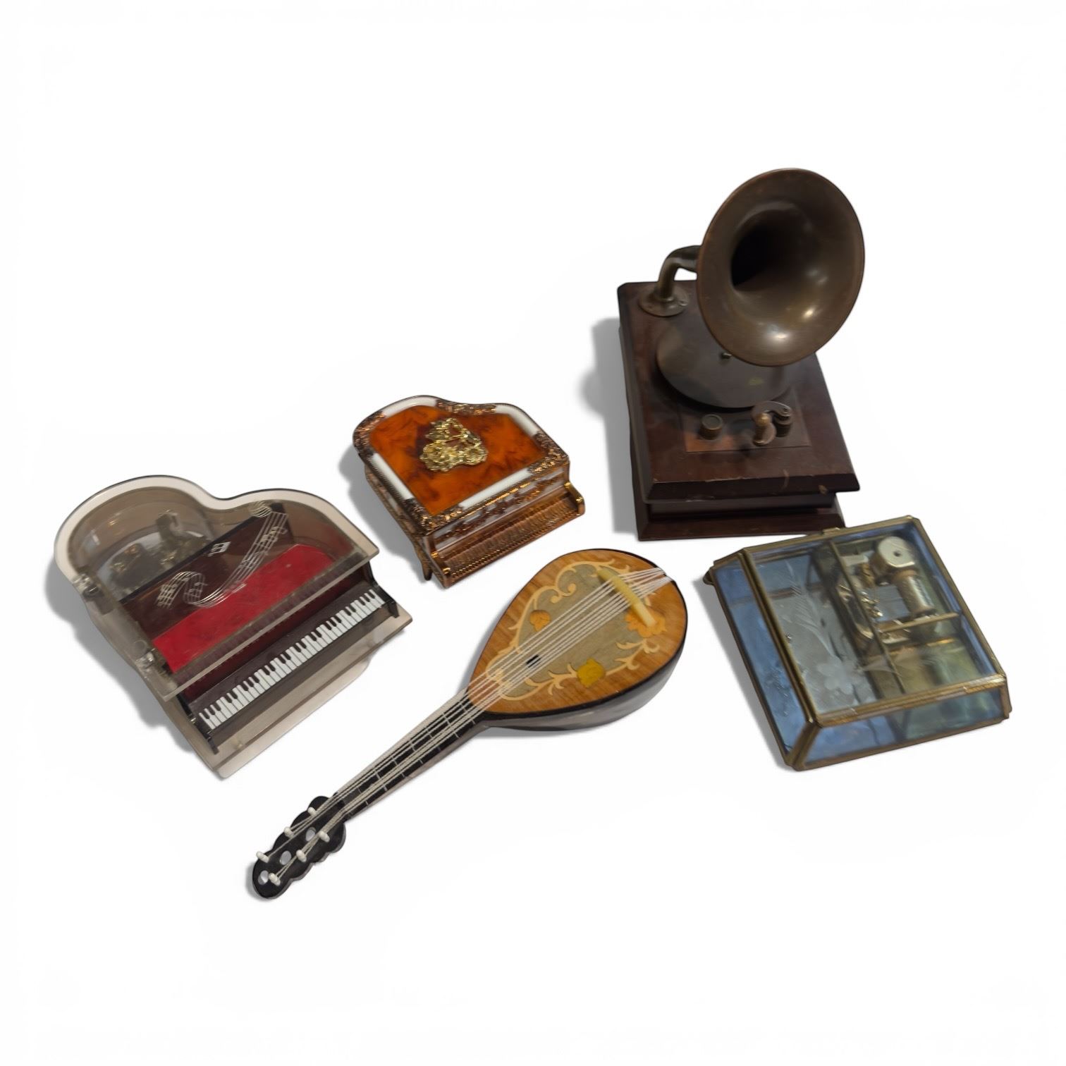 Collection of 5 music boxes featuring various designs including miniature pianos, a phonograph, a glass and brass style, and a mandolin-shaped box. Each piece plays music when wound. Item is as pictured.