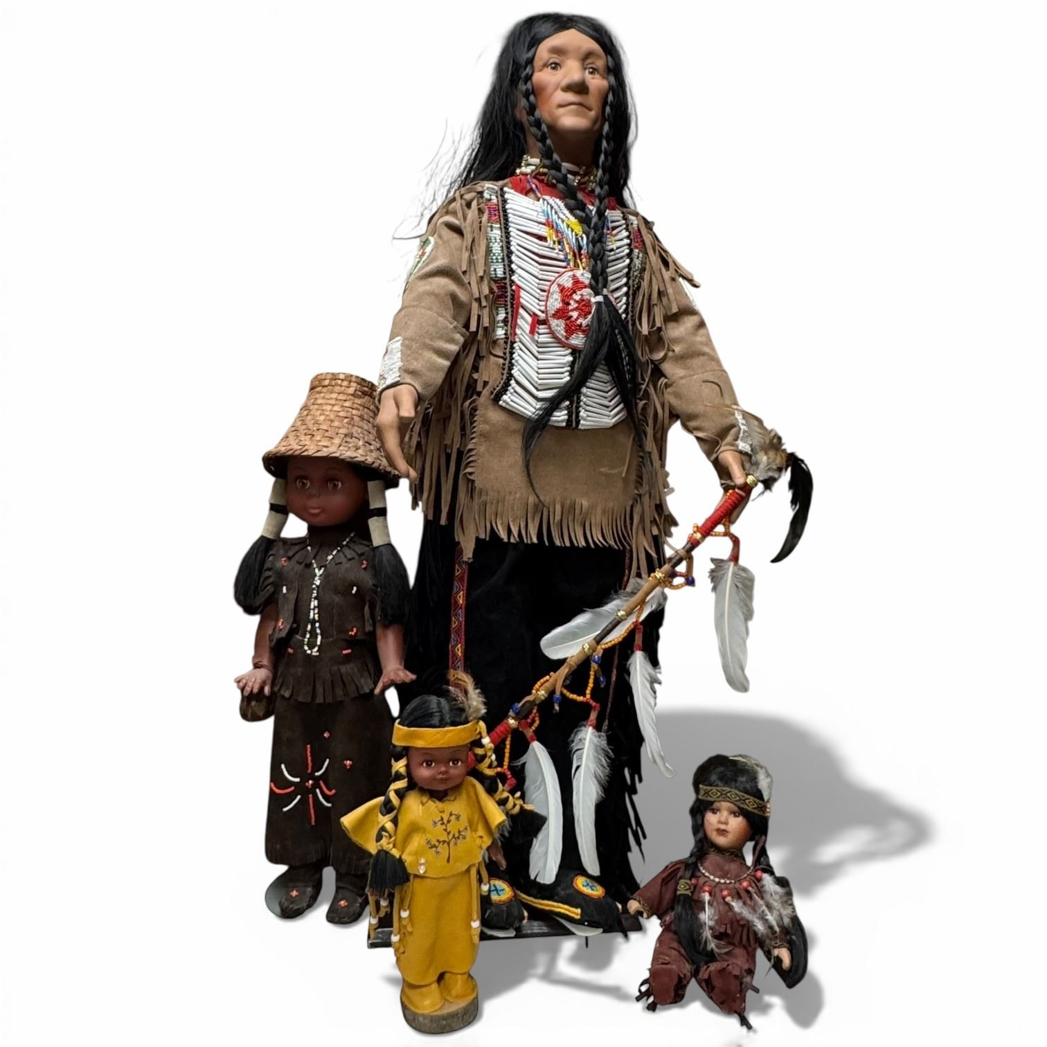 Collection of Native North American dolls featuring various traditional dress designs. Includes multiple sizes, with the tallest doll measuring 33-Inch. Item is as pictured.