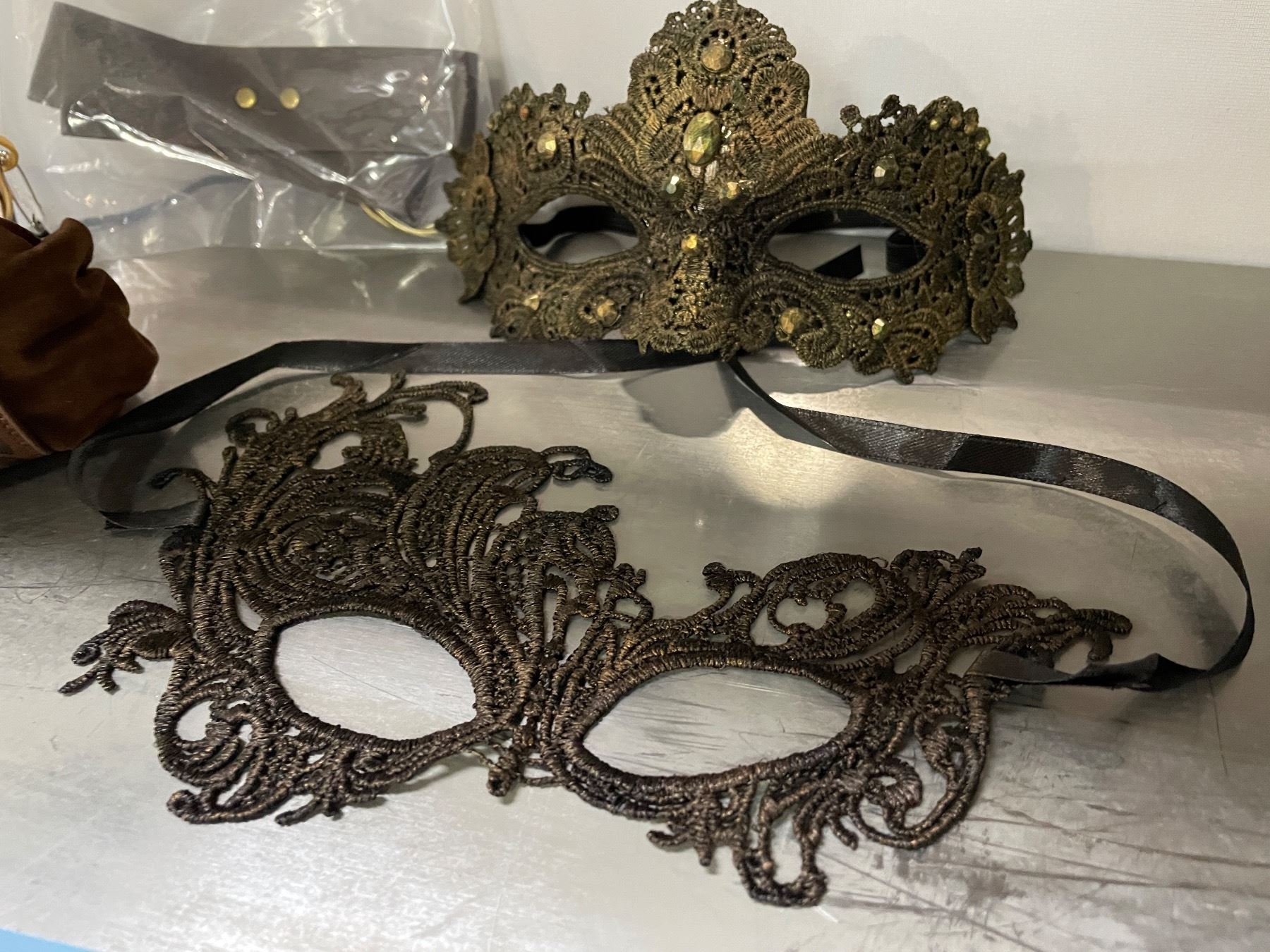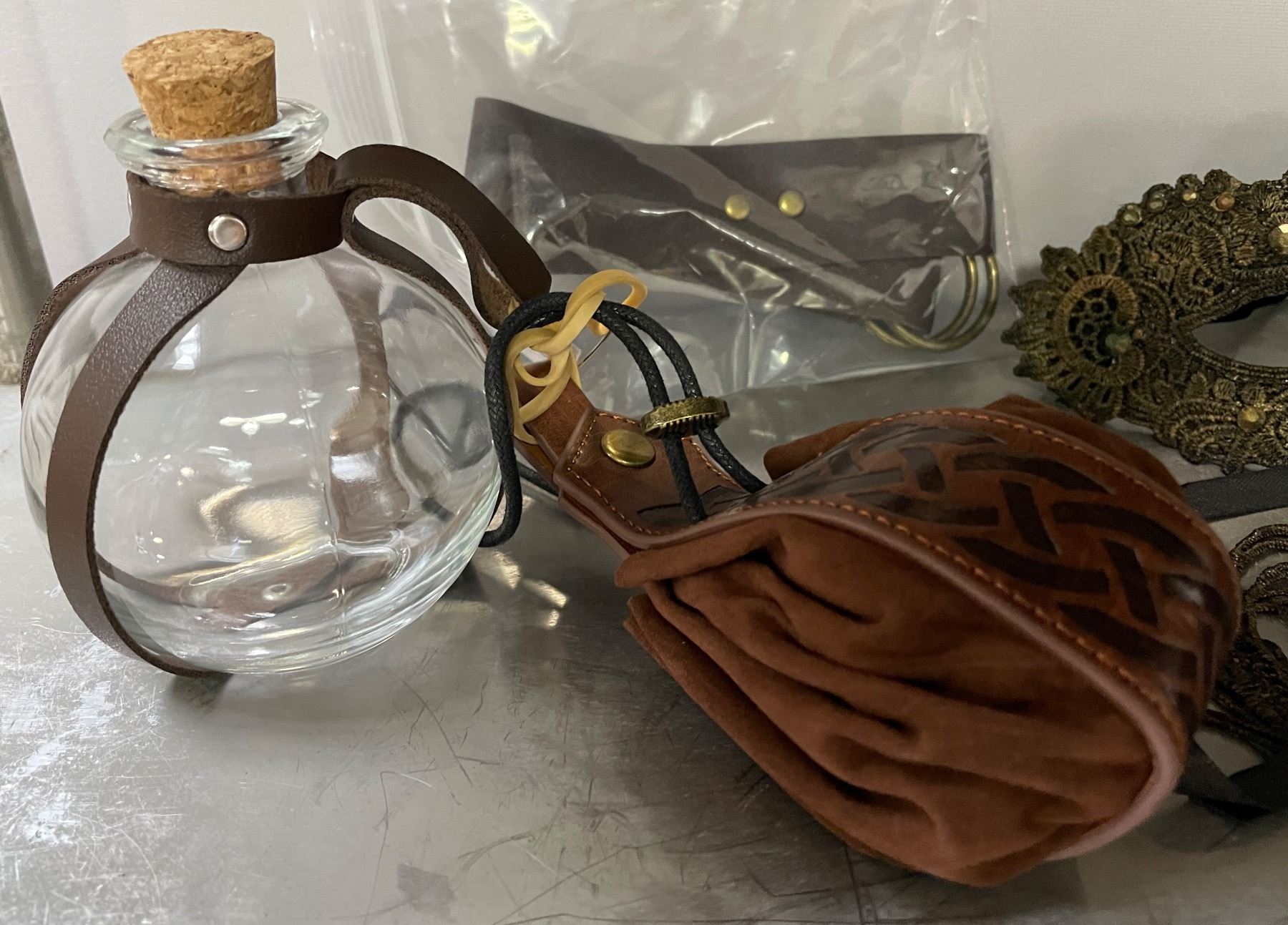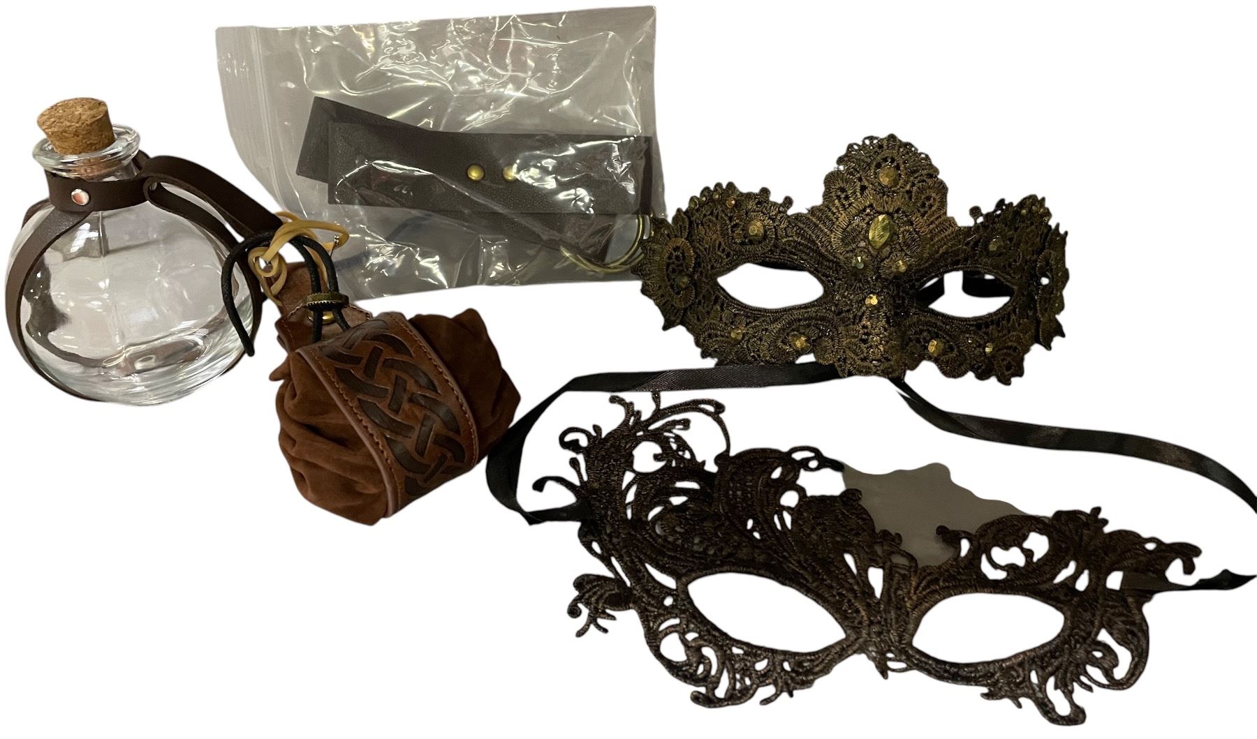 Assorted Costume Accessories - Decorative Masquerade Masks, Leather Pouch & Glass Flask