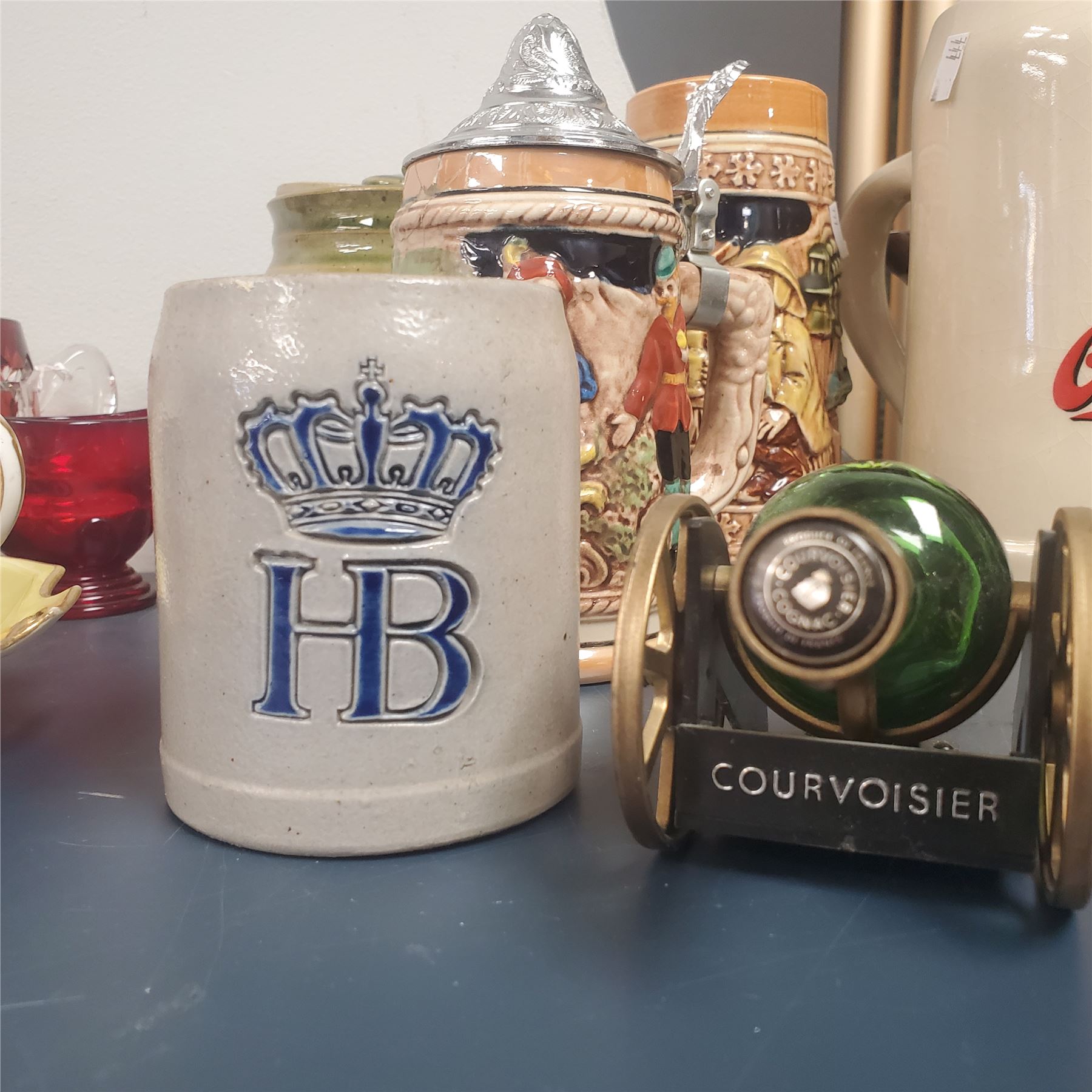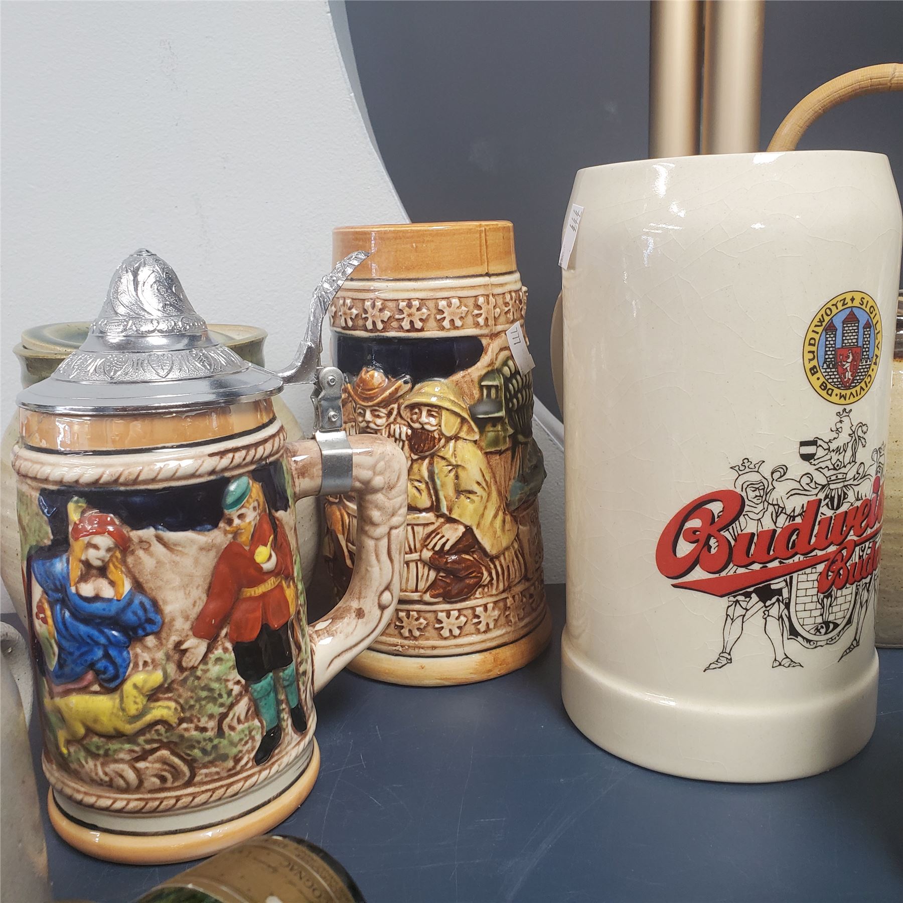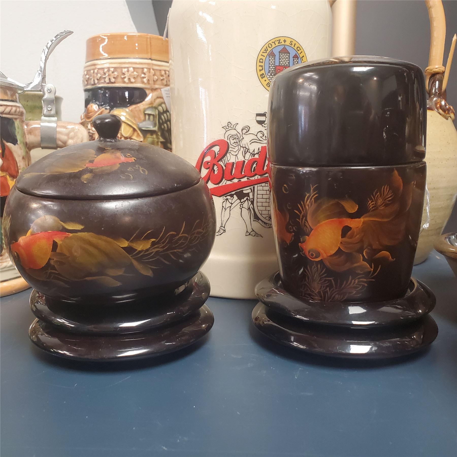 A diverse collection of decorative collectables including pottery items, lacquer pieces, steins and other assorted items. Varieties and details are as pictured. Items feature various materials and designs suitable for display or collection purposes. Item is as pictured.