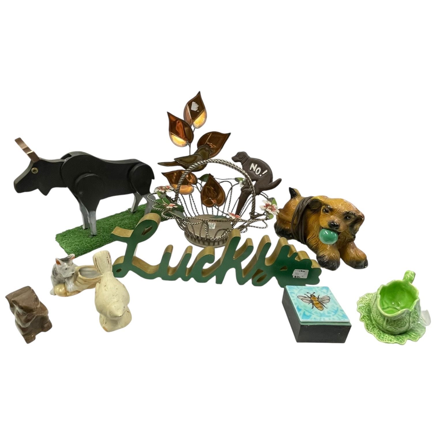 Lot includes assorted decorative collectibles featuring a carved wood moose figure, various porcelain items, a chalkware dog lamp, and additional pieces. Items represent diverse materials and styles with varied craftsmanship. Item is as pictured.