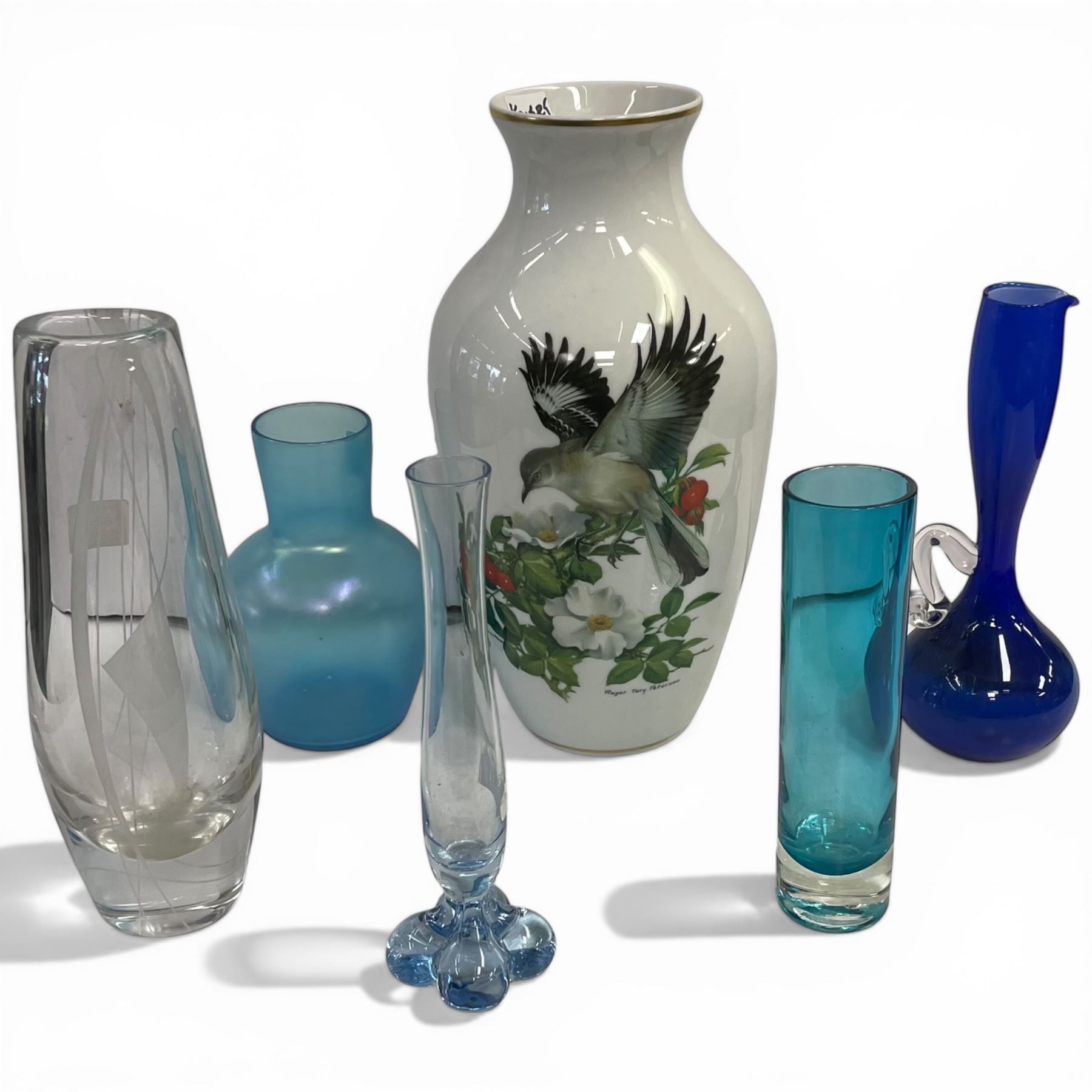Assorted Decorative Glass Vases and One Kasier Mockingbird Vase 11" Tall