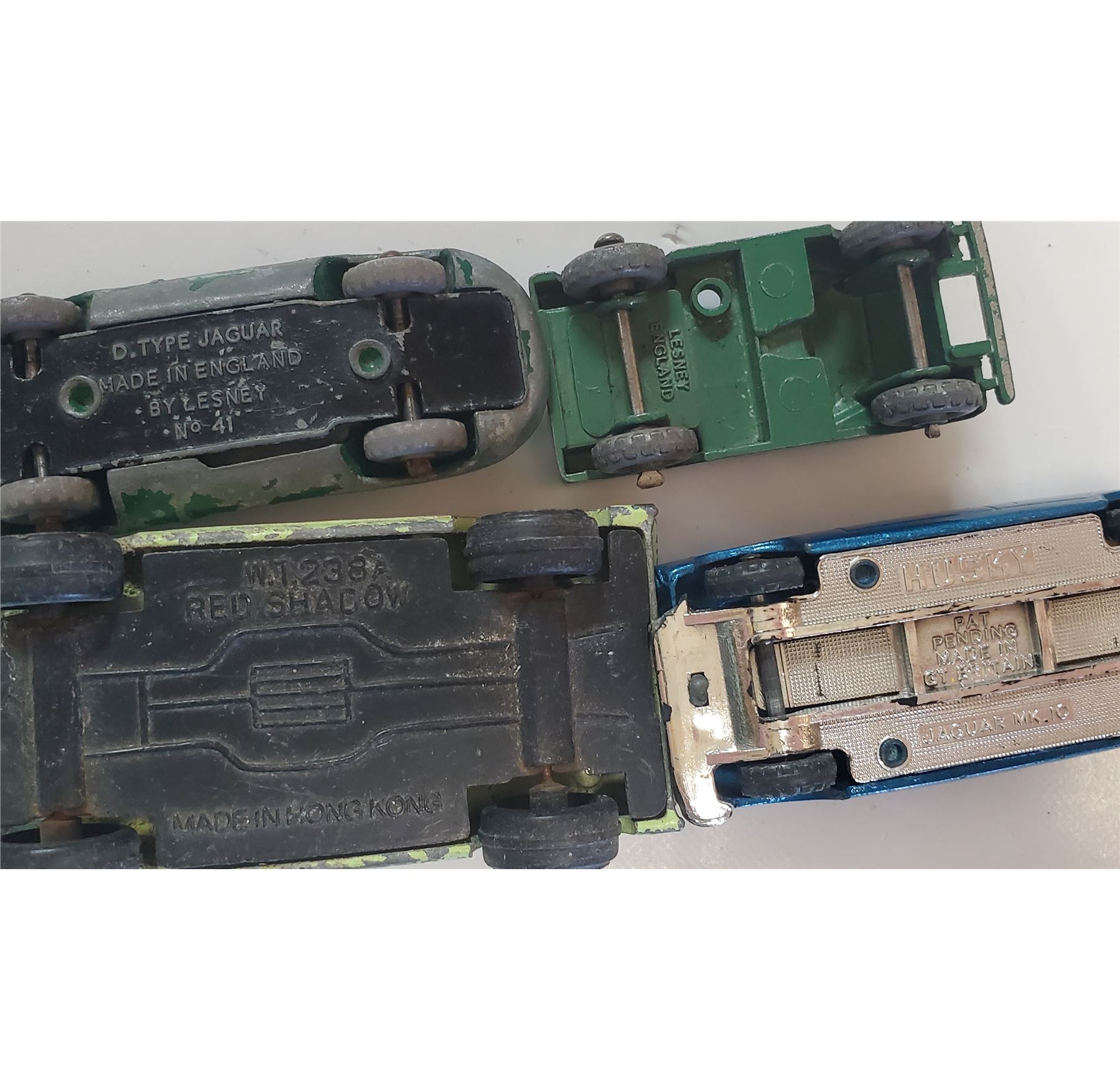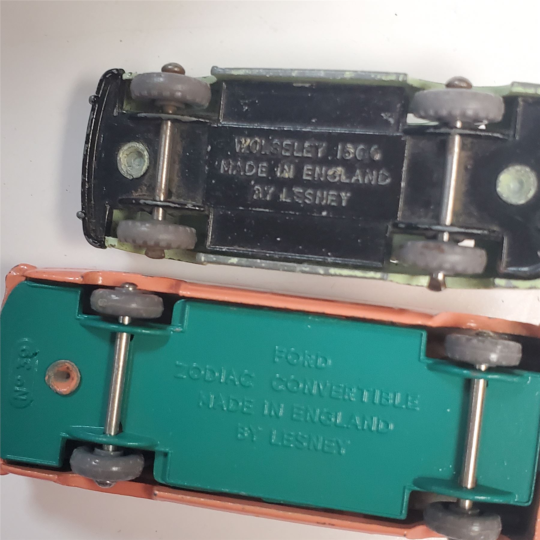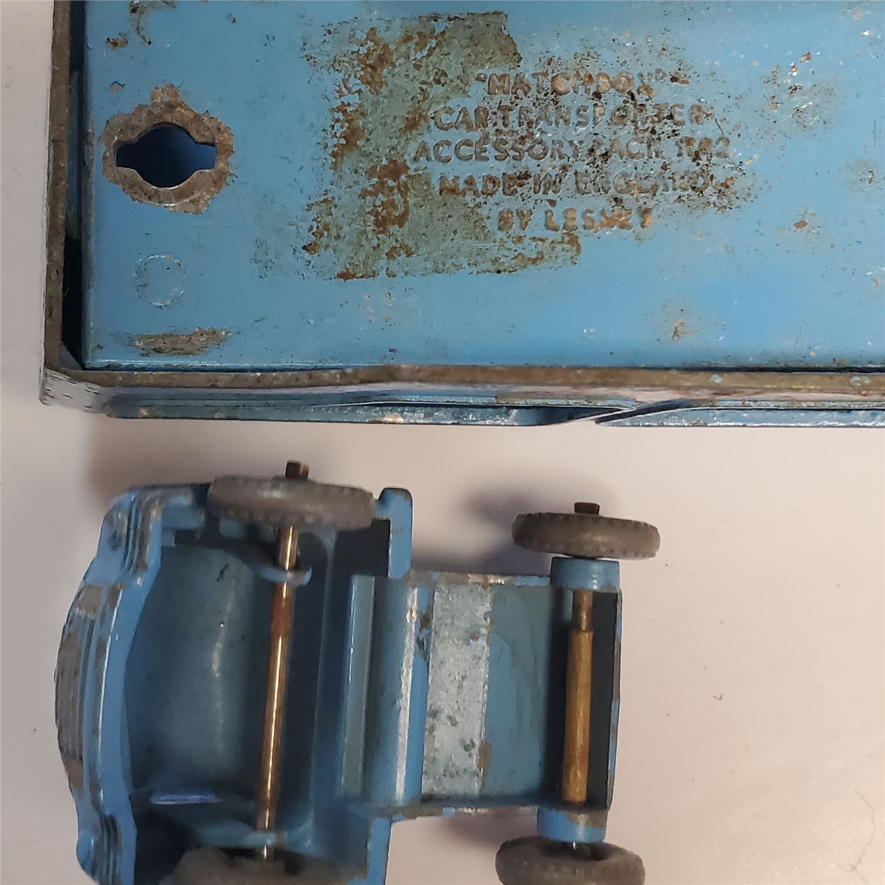 Collection includes Matchbox Lesney A-2 Bedford Car Transporter (1957-1962) with Type S cab and two-level trailer in blue. Additional vintage Matchbox diecast vehicles are included, shown both on and off the transporter. Condition and specific variations play a role in their collectability.