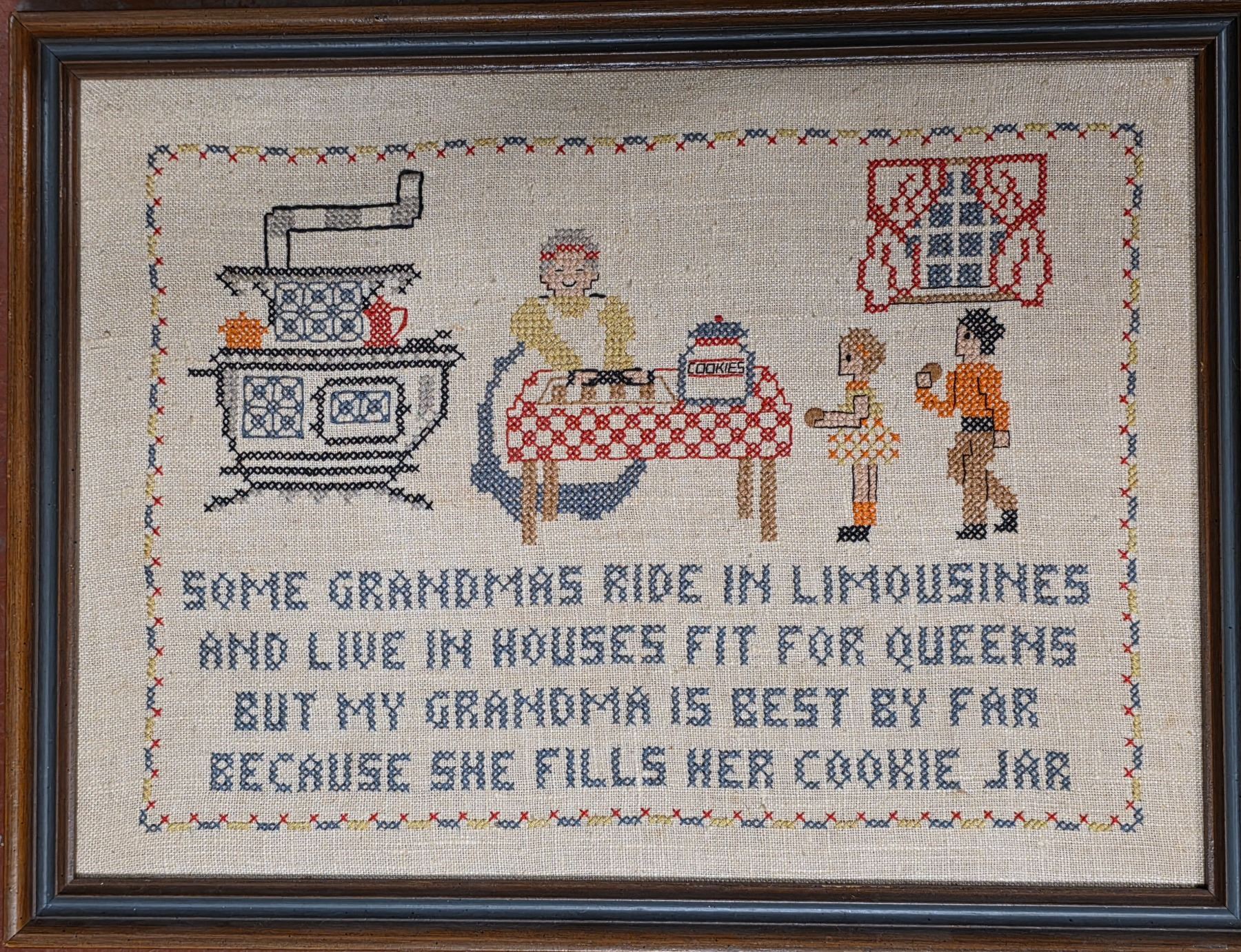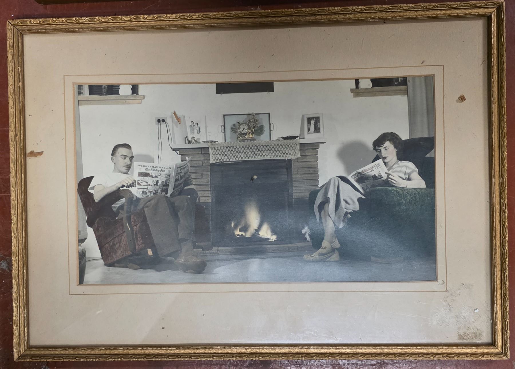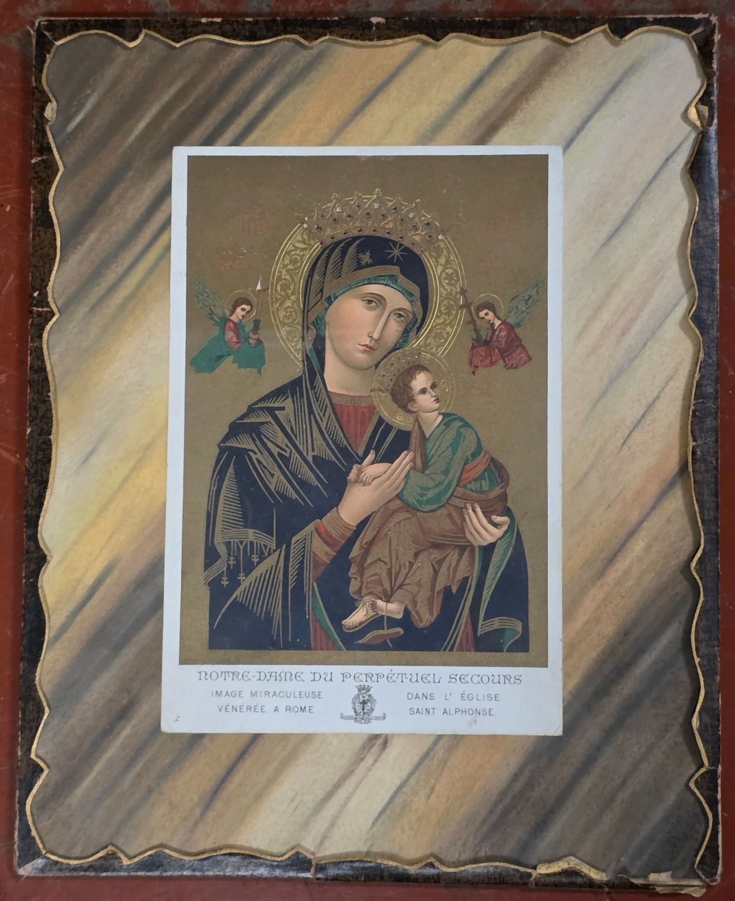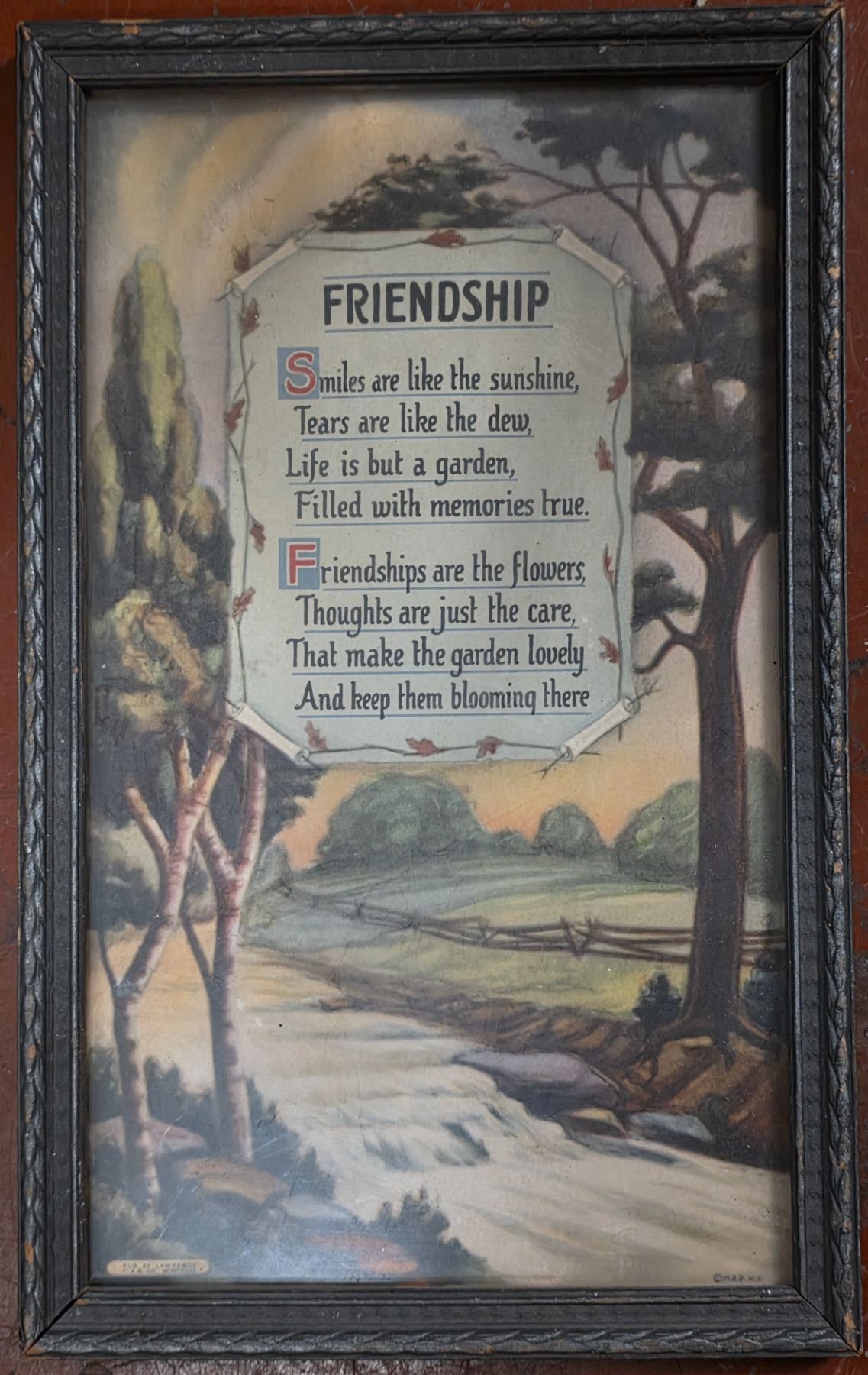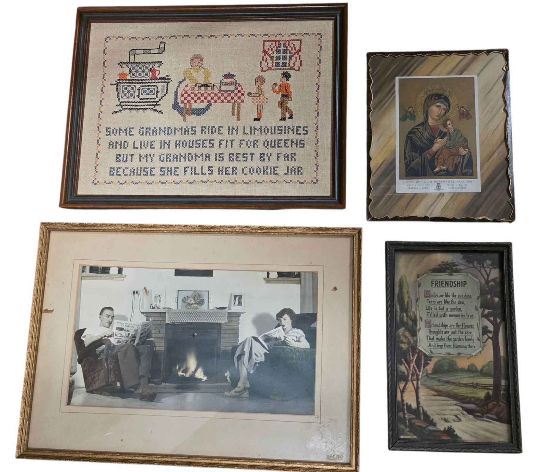 Assorted Framed Vintage Wall Art - Cross Stitch Sampler, Madonna & Child Religious Icon, Mid-Century Fireplace Photo & Friendship Motto Prints (4pcs)