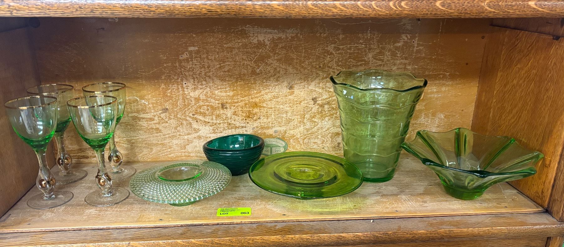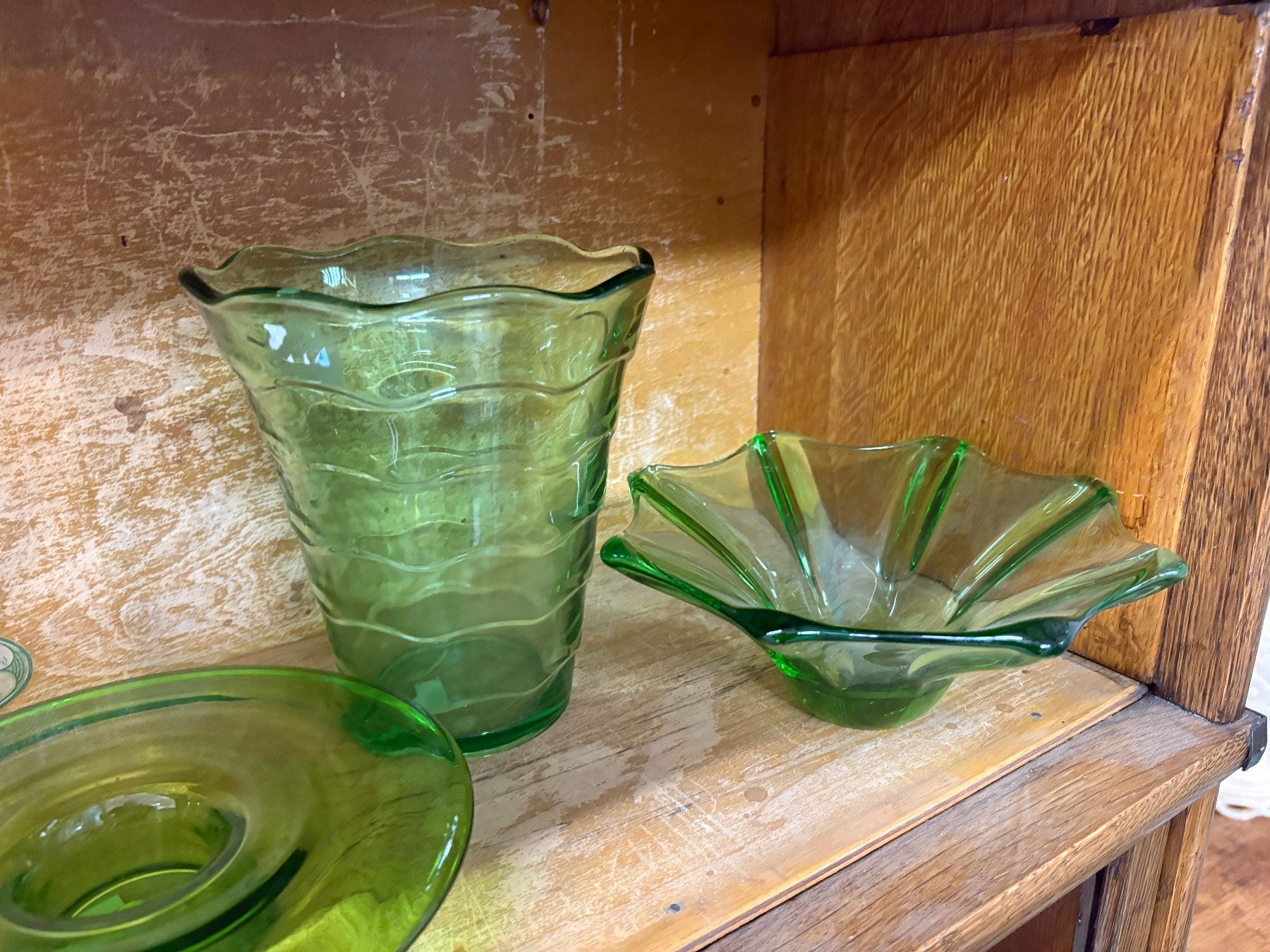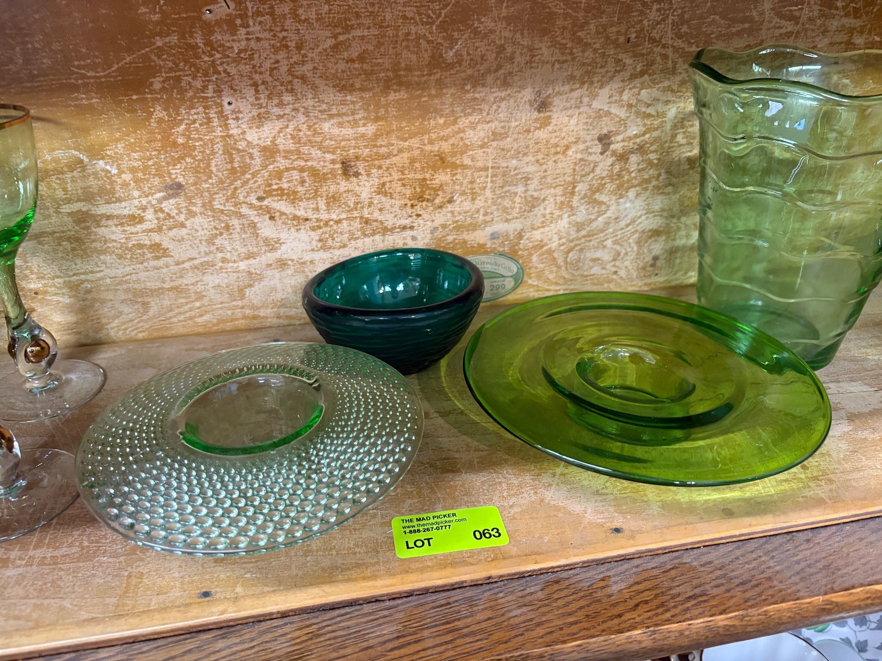 Collection of nine green art glass pieces of varied shapes and sizes. The tallest piece measures 7 inches in height. Includes a variety of decorative forms made of green-hued glass, showcasing diverse designs and craftsmanship. Exact makers or origins unspecified.