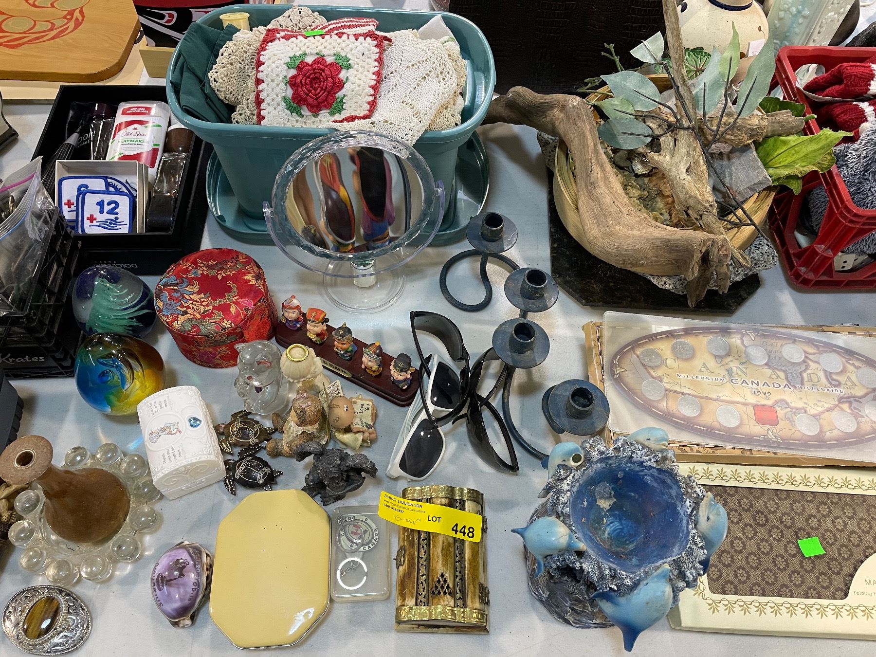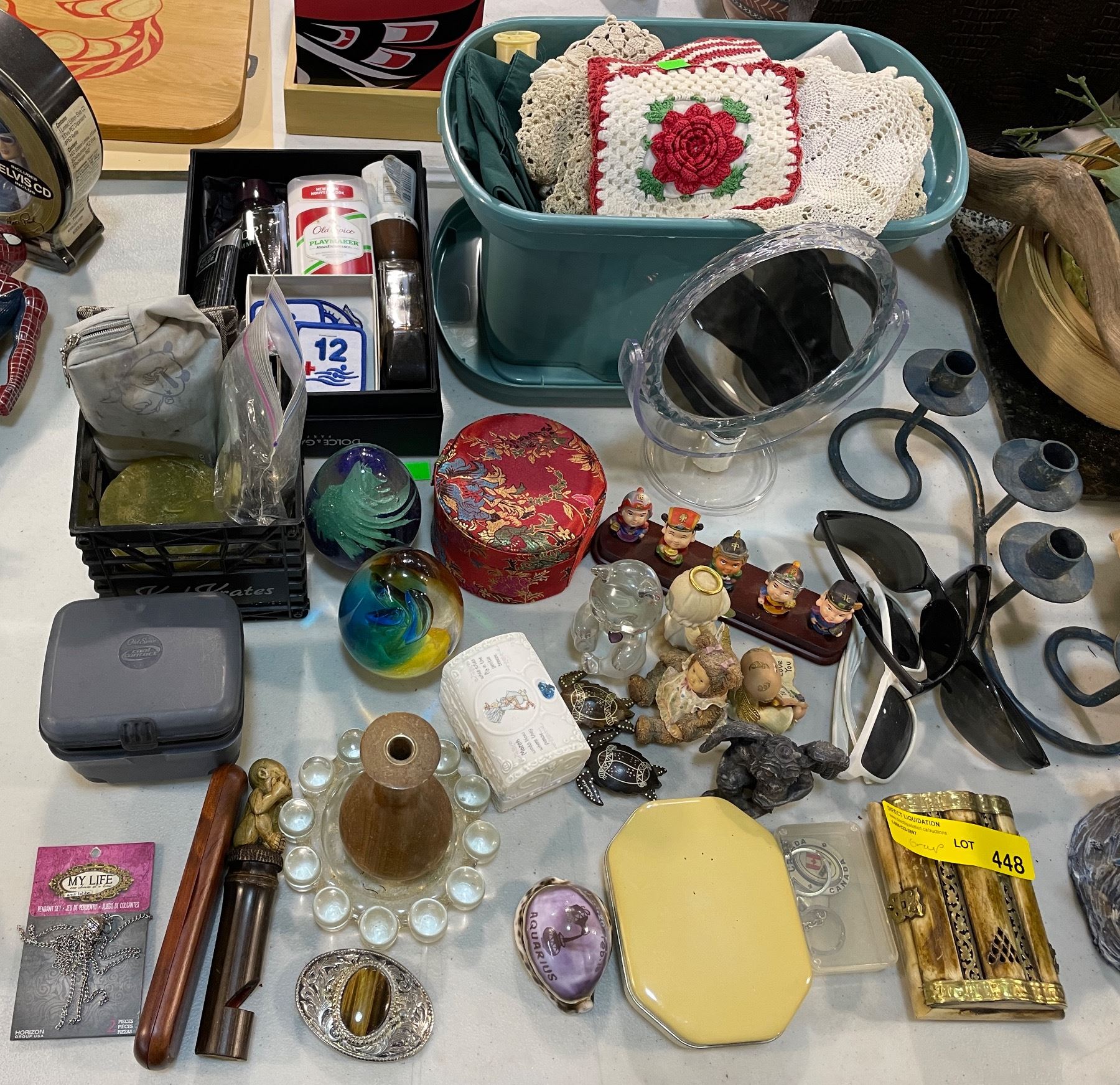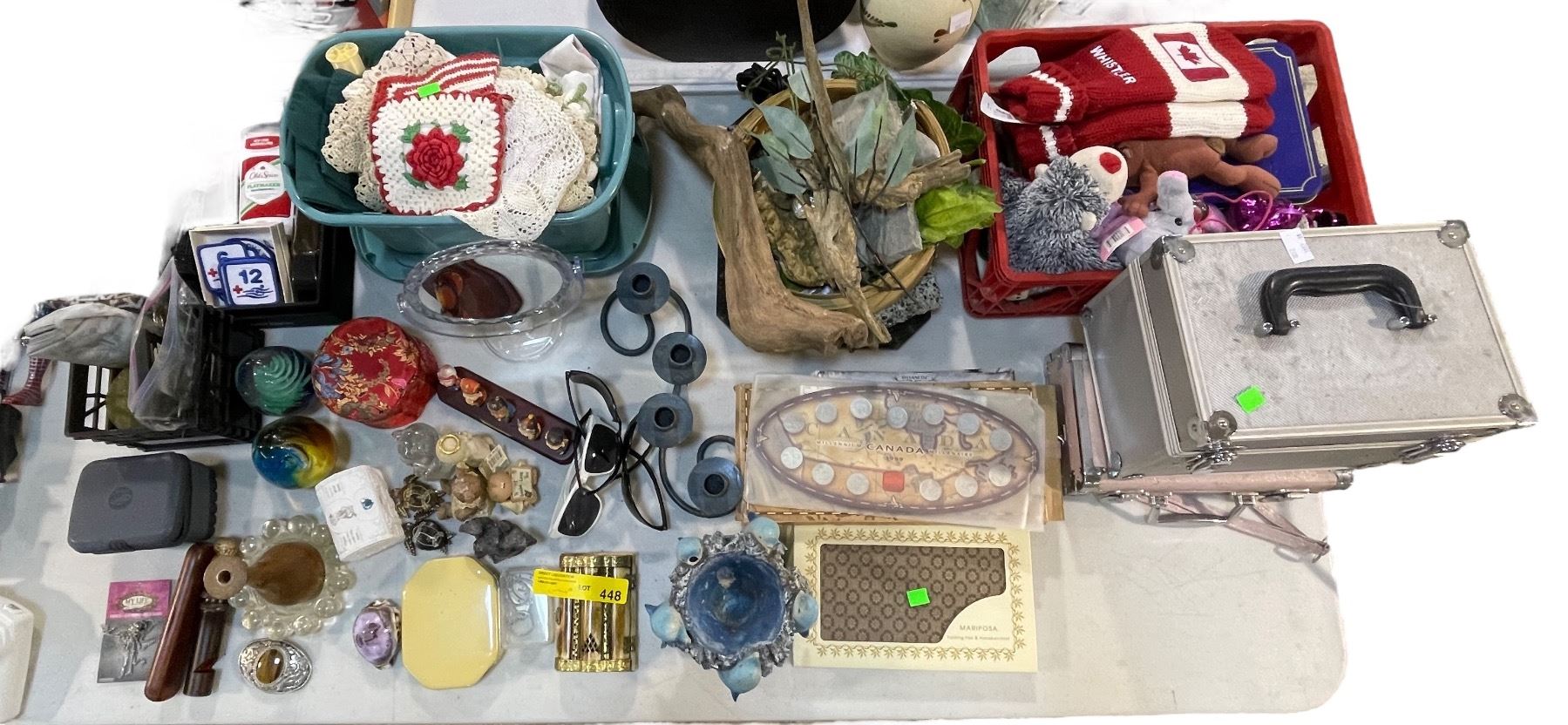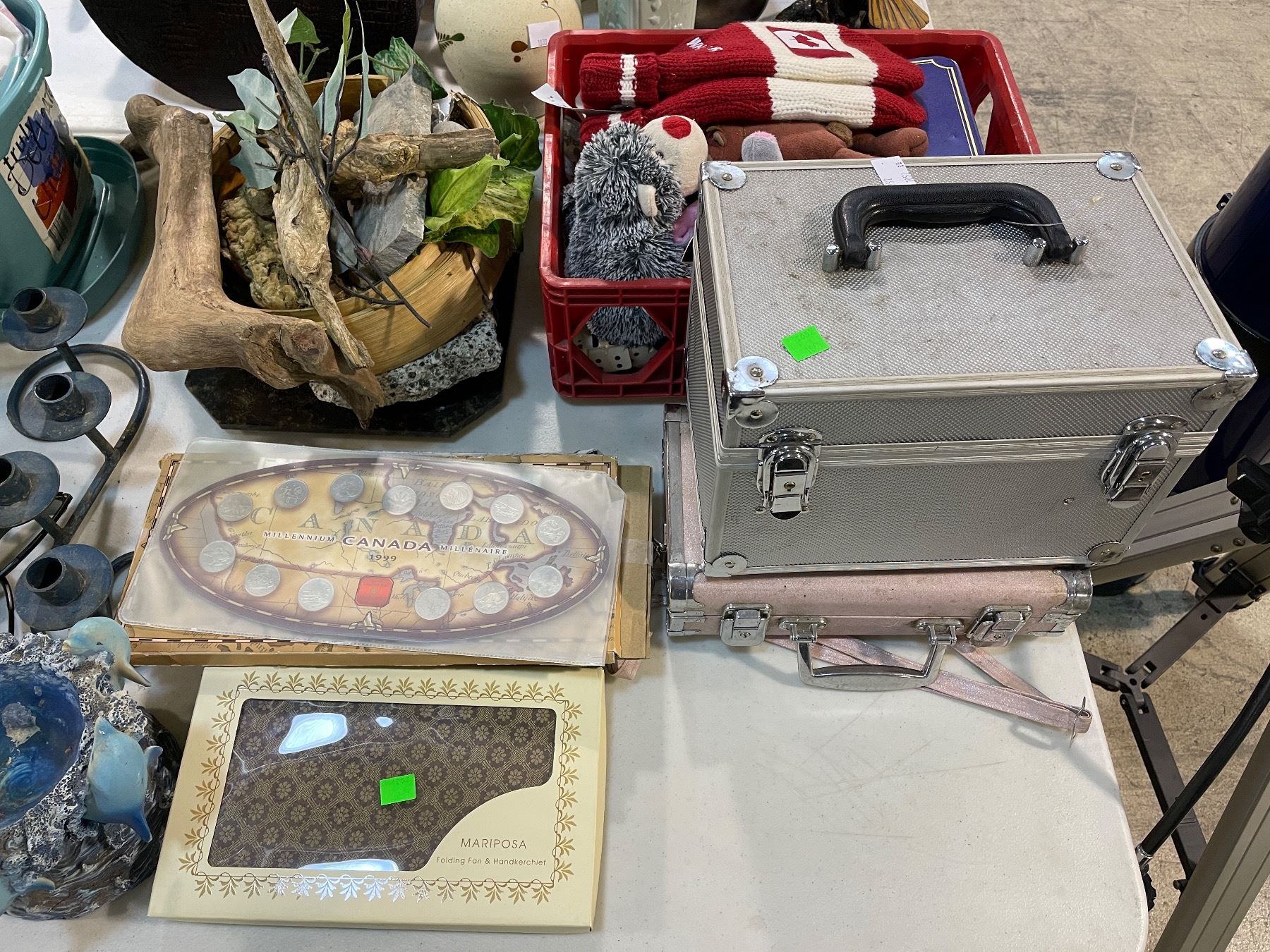 Assorted Home Decor Collectibles, Coins, Bathroom Amenities, Etc.