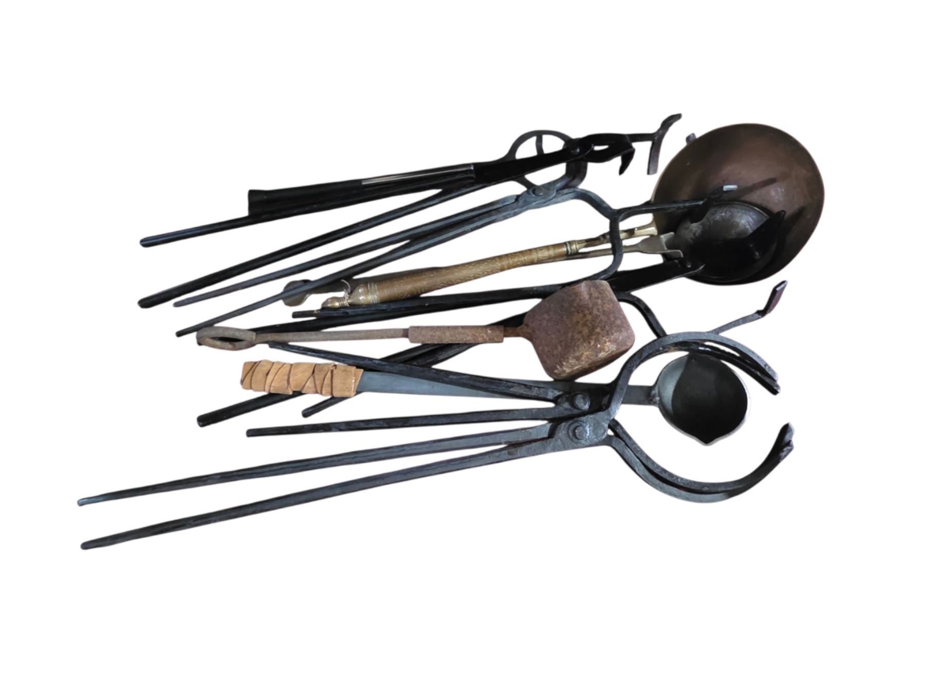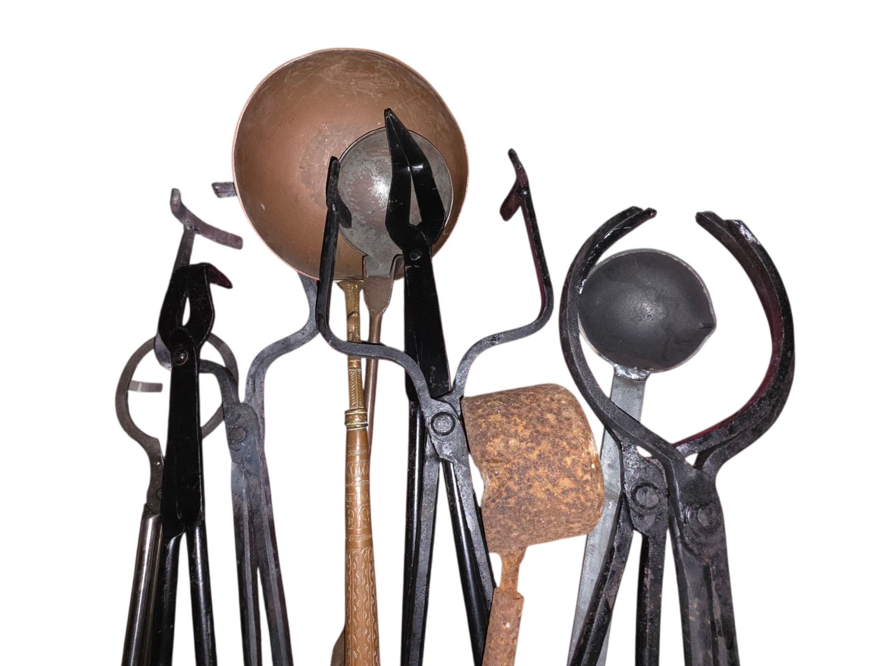 Assorted Metal Tools including Iron Tongs, Ladles, and Pokers